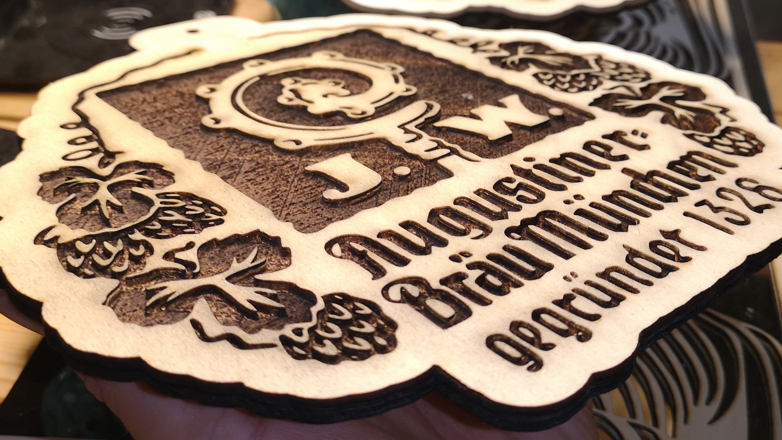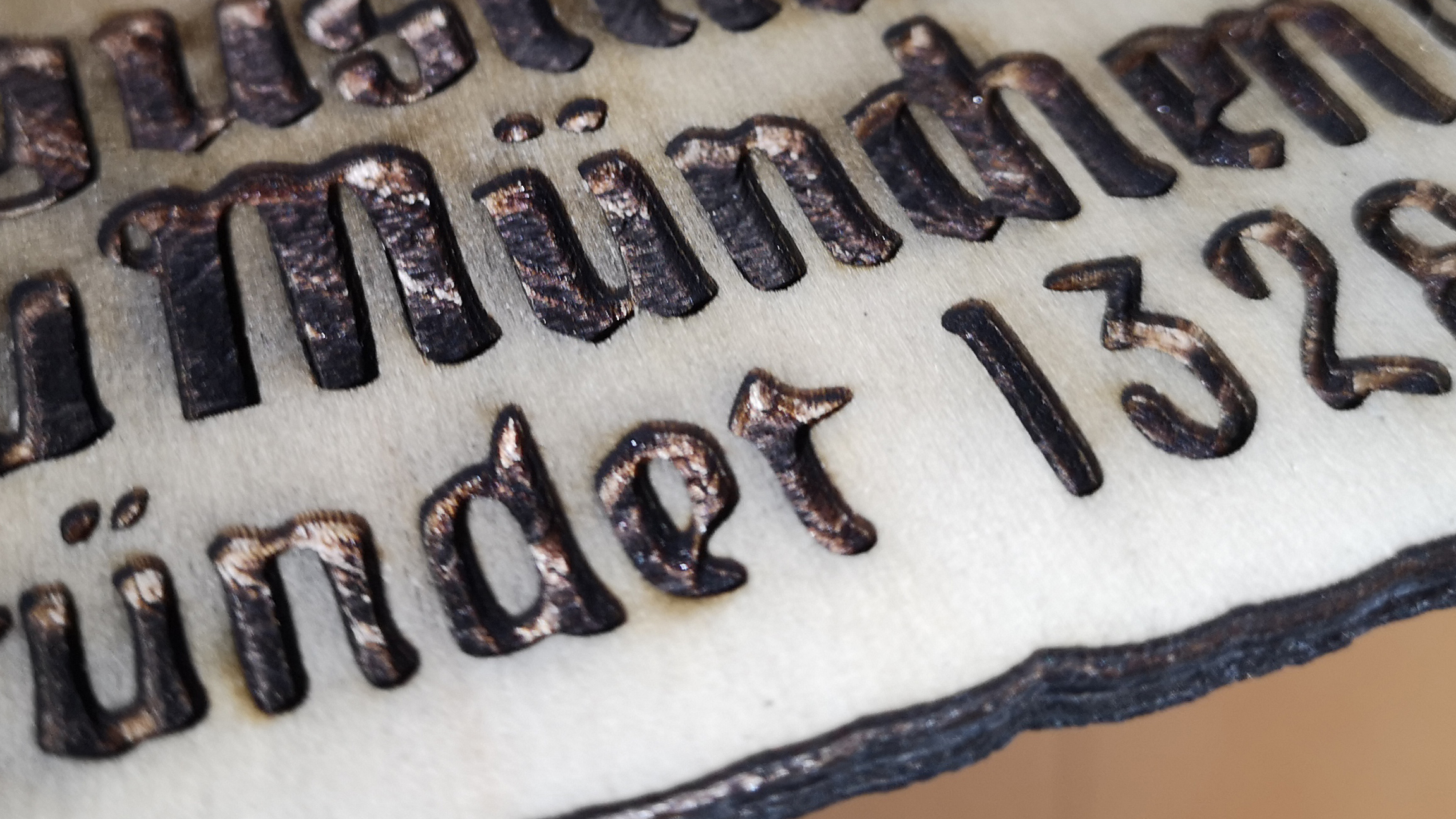 Nachdem wir uns langsam an die neuen Einstellungen gewöhnt haben, werden auch die Ergebnisse immer besser. Gravieren von Holz, Leder oder das dauerhafte Markieren von Metall funktioniert super. Umrisse und Details sind scharf und spürbar ins Holz eingebrannt. Auf dem benutzten Sperrholz sind Kontraste und Graustufen gut zu sehen und zu unterscheiden. Selbst bei einer Geschwindigkeit von 8000 mm/min und nur 50 Prozent Leistung ist die Gravur spürbar vertieft eingebrannt. Bei 5 W ist hier gerade einmal die Oberfläche leicht geschwärzt.