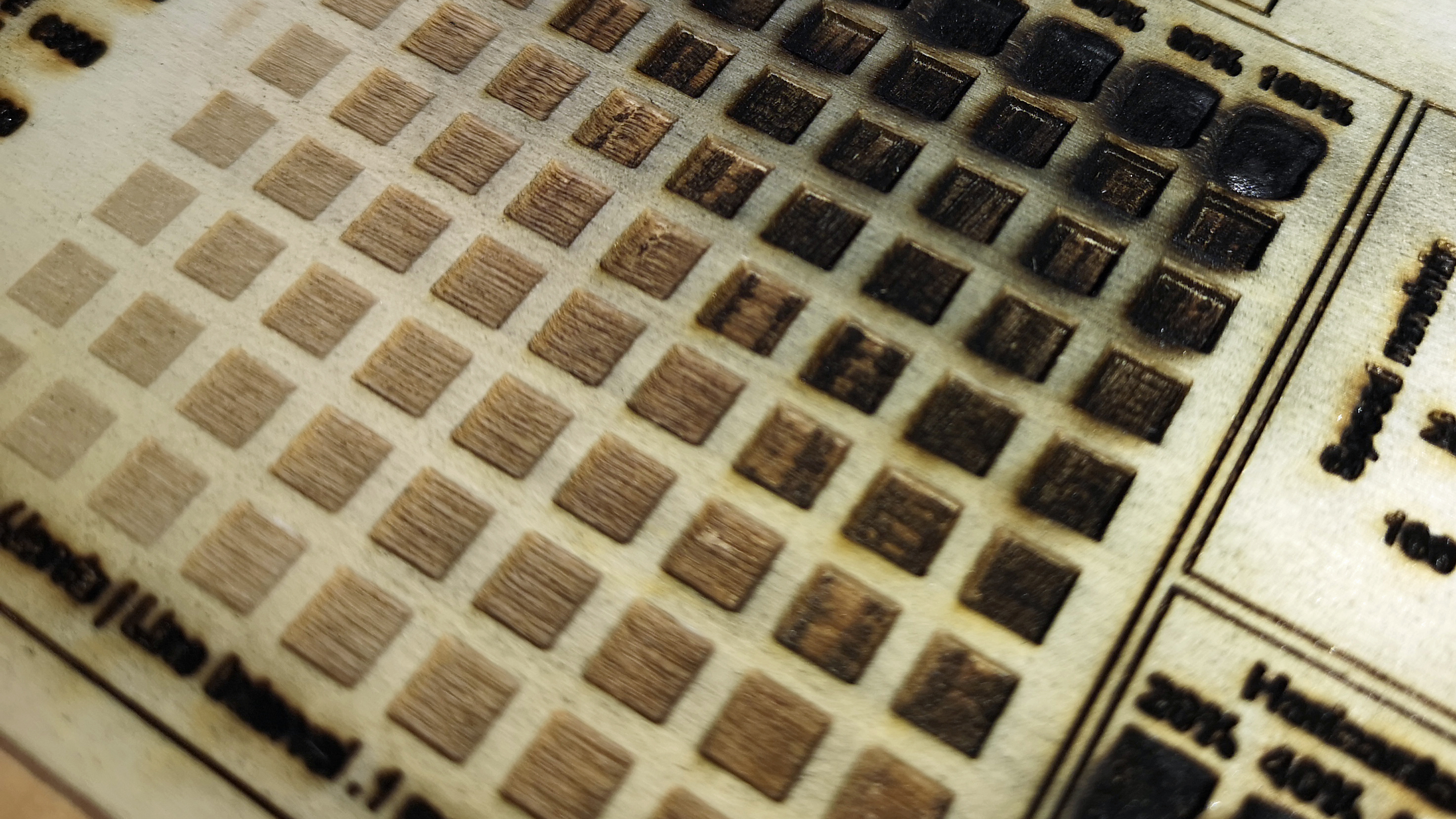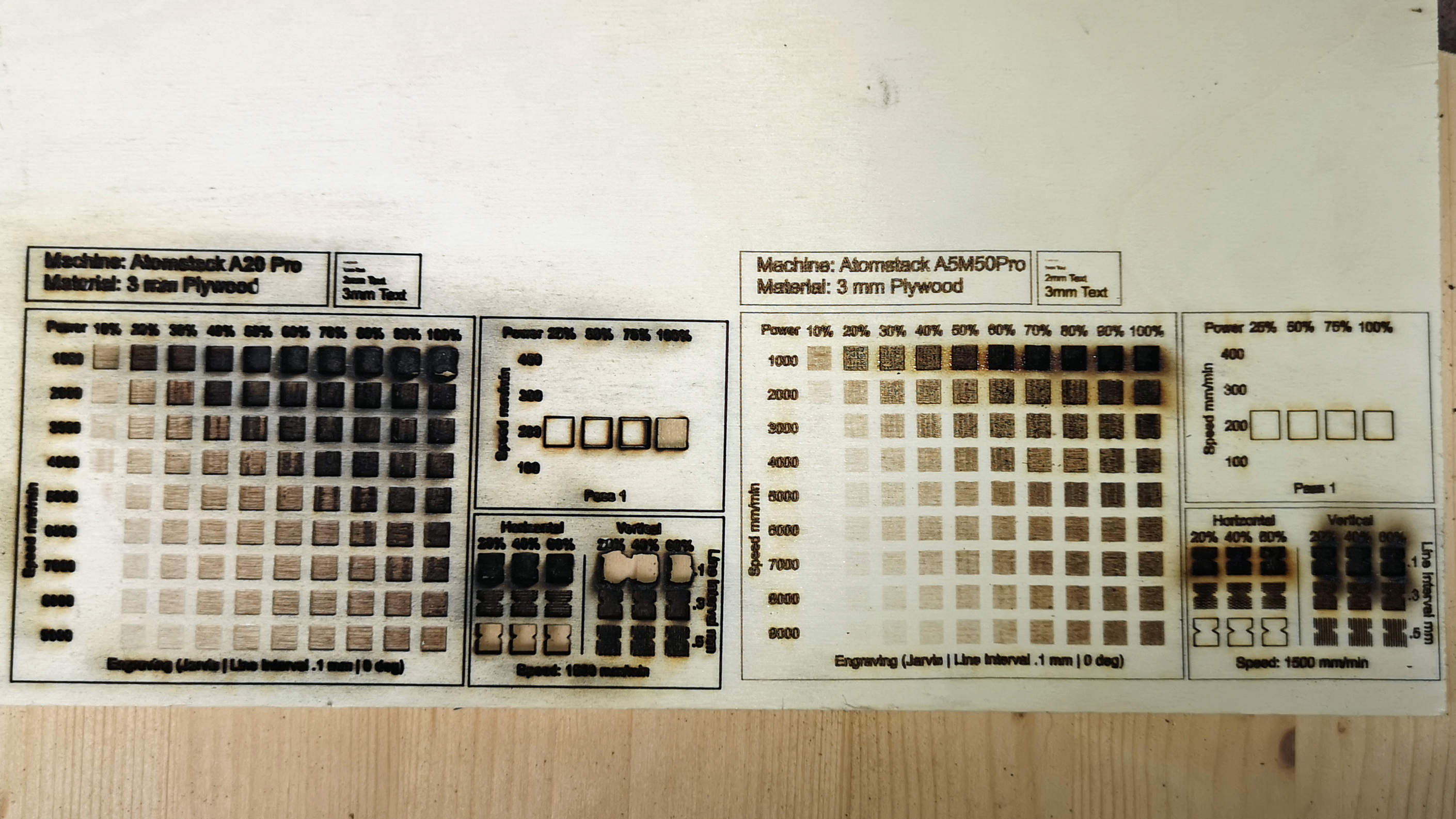So funktioniert der Laser zwar von Anfang an problemlos, die Ergebnisse sind zu Beginn aber nicht so toll, da oft zu tief und zu verbrannt. Unsere ersten Gravuren auf 2 mm starkem Sperrholz sind komplett durch das Material gegangen und selbst die nächsten Versuche enden zunächst unbefriedigend, da zu tief und zu verbrannt. Das liegt an unseren Standard-Settings. Diese sind für 5 bis 6 W Leistung ausgelegt und somit beim A20 ungeeignet. Wie groß der Leistungsunterschied ist, zeigt etwa dieser Test-Chart, den wir einmal mit A5 M50 Pro und einmal mit A20 Pro graviert haben. Wir testen also und arbeiten dann mit deutlich höheren Geschwindigkeiten und mit weniger Leistung –zumindest beim Gravieren.
