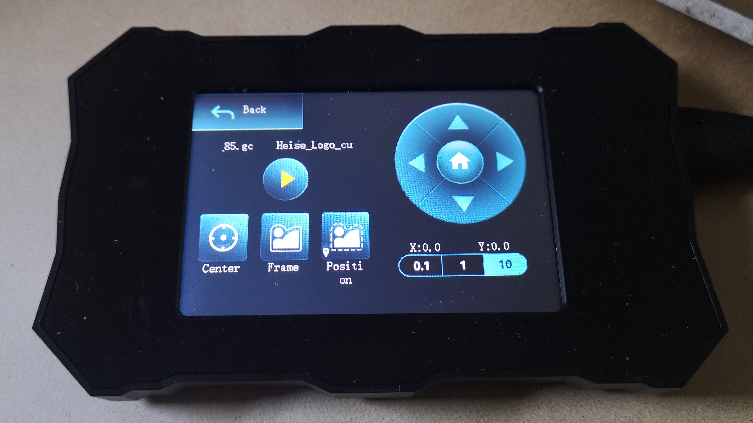 Am PC geschieht zunächst der Import der gewünschten Vorlage, einer Pixel- oder Vektorgrafik und die Anpassung von Größe und Position. Auch das Erstellen von Text oder Grafiken direkt in der Software ist möglich. Das Programm unterstützt neben JPEG, TIFF oder DXF noch zahlreiche andere Formate. Nach den Einstellungen für Geschwindigkeit und Laser-Power folgt dann entweder der Start des Engravers oder, in unserem Fall, der Export des GCodes auf Speicherkarte. Ist diese im Laser eingelegt, lassen sich die Daten bequem per Touchscreen auswählen. Dann folgt die Positionierung auf dem Werkstück. Dazu lassen wir den Rahmen um die Grafik vom Laser-Kopf abfahren – noch ganz ohne starken Laserstrahl, nur um die Position zu ermitteln. Diese kann man nun per Pfeiltasten anpassen und korrigieren. Anschließend starten wir den Arbeitsvorgang per Play-Taste. Die Bedienung des berührungsempfindlichen Bildschirms funktioniert besser als beim A5 M50 Pro – der optisch identische Touchscreen reagiert genauer und zuverlässiger.