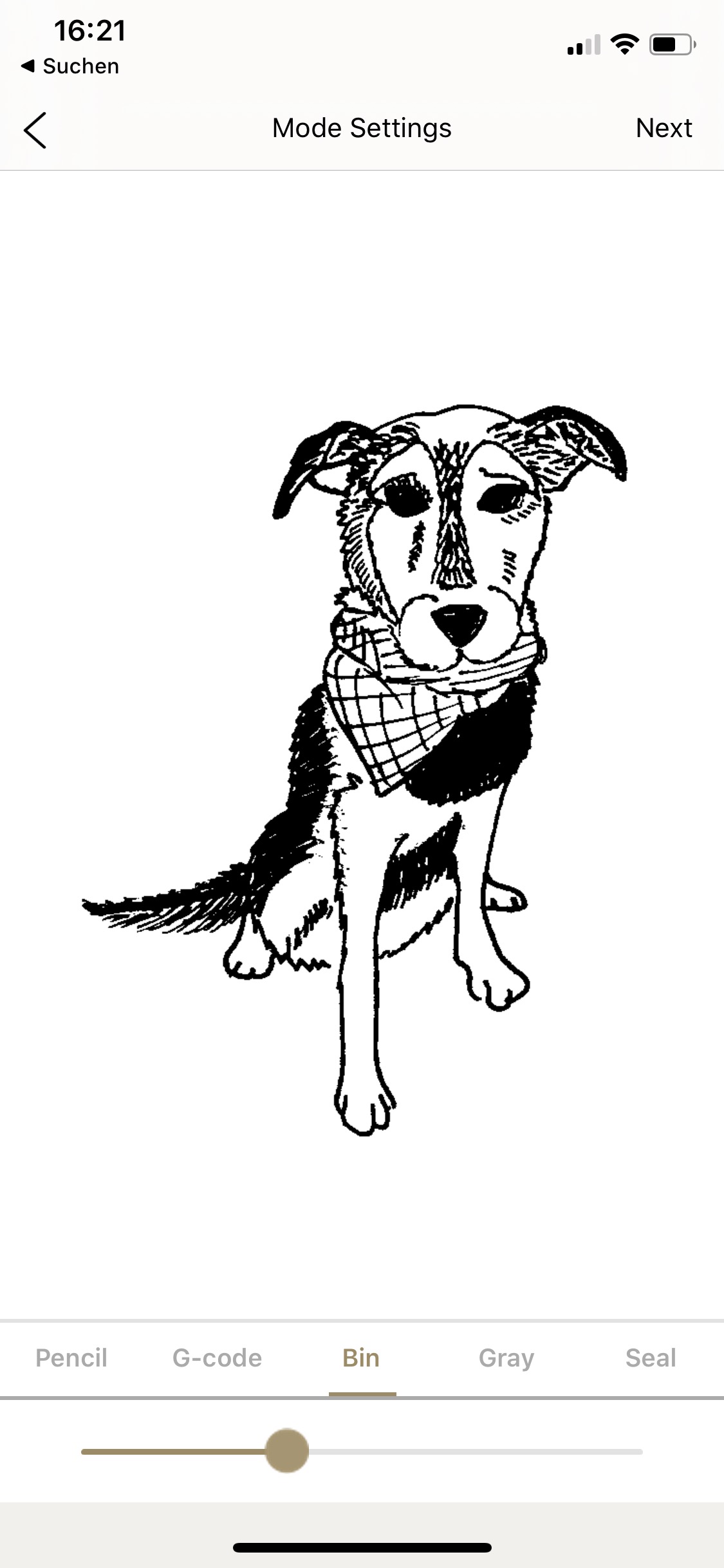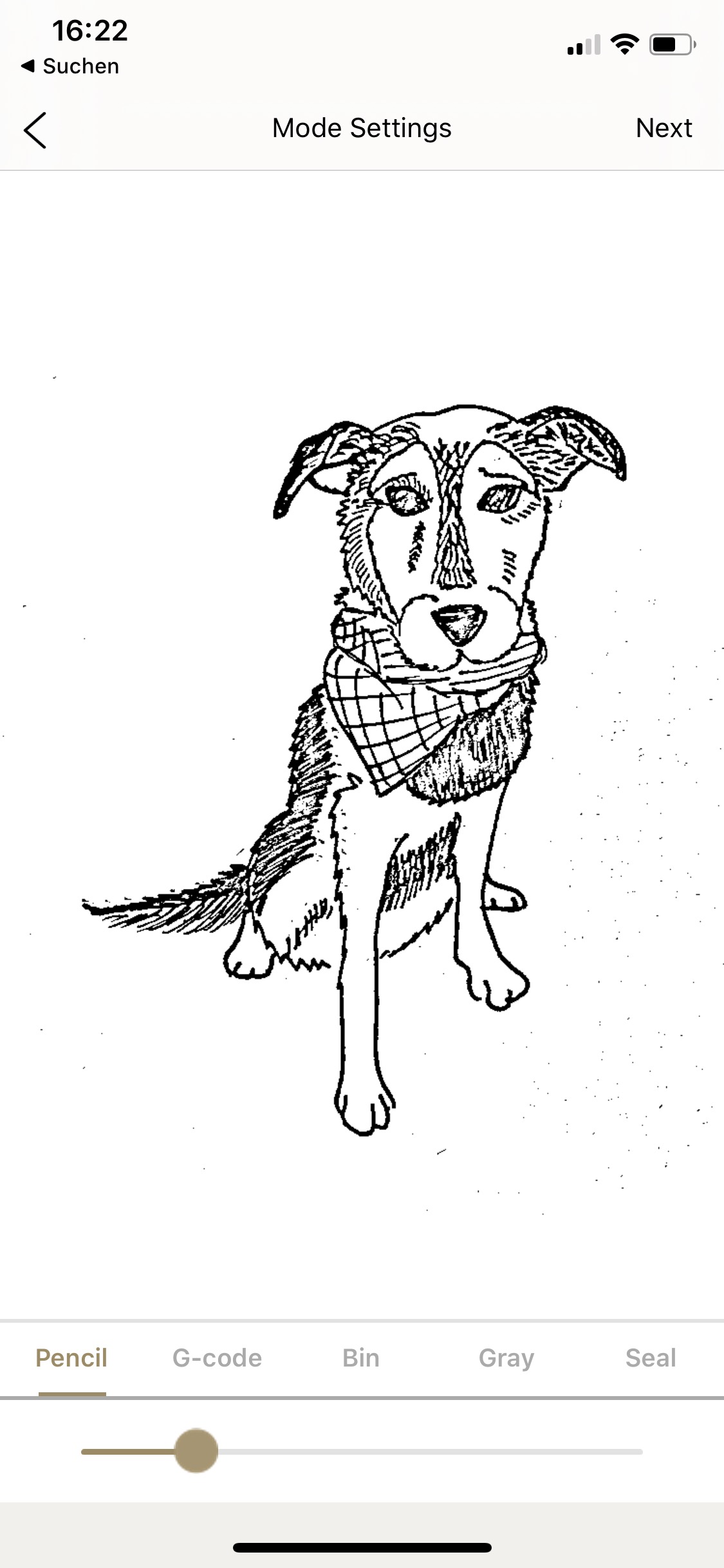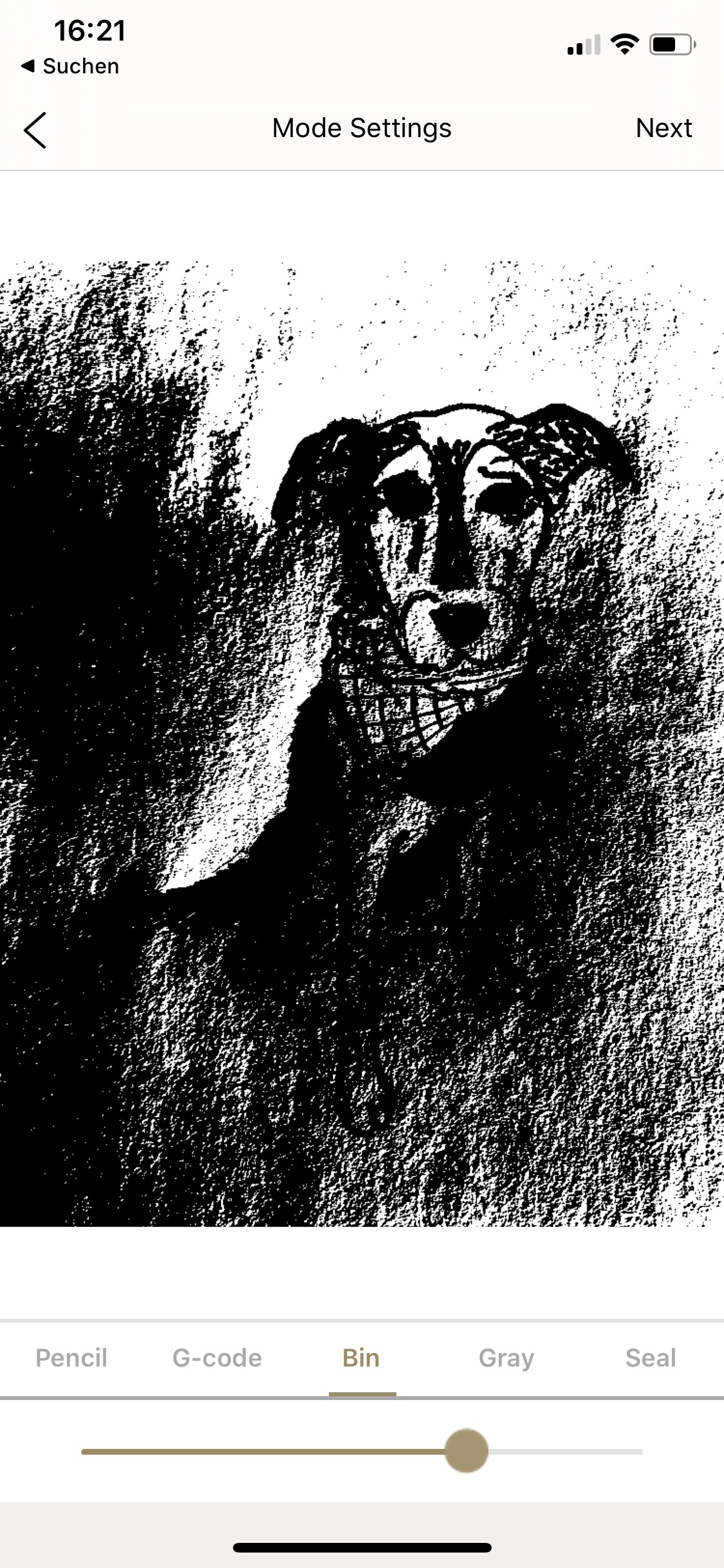 Dann kann's losgehen. Im Hauptmenü wählt man aus, ob man ein vorhandenes Bild vom Handy laden, die Kamera verwenden oder eine eigene Kreation aus Text und Bild basteln möchte; außerdem gibt es eine Handvoll Beispielgrafiken. Gute Ergebnisse gibt's mit Text und Schwarz-Weiß-Grafiken. Wer bei der Google-Bildersuche „svg“ an den gewünschten Begriff anhängt, findet tausende überwiegend rechtefreie Vectorgrafiken, die man direkt auf Kork, Holz & Co. brennen kann. Möchte man ein eigenes Foto umsetzen, muss man ein wenig mit den in der App angebotenen Schiebereglern für den Kontrast spielen, bis man ein schönes Ergebnis in der Vorschau sieht.