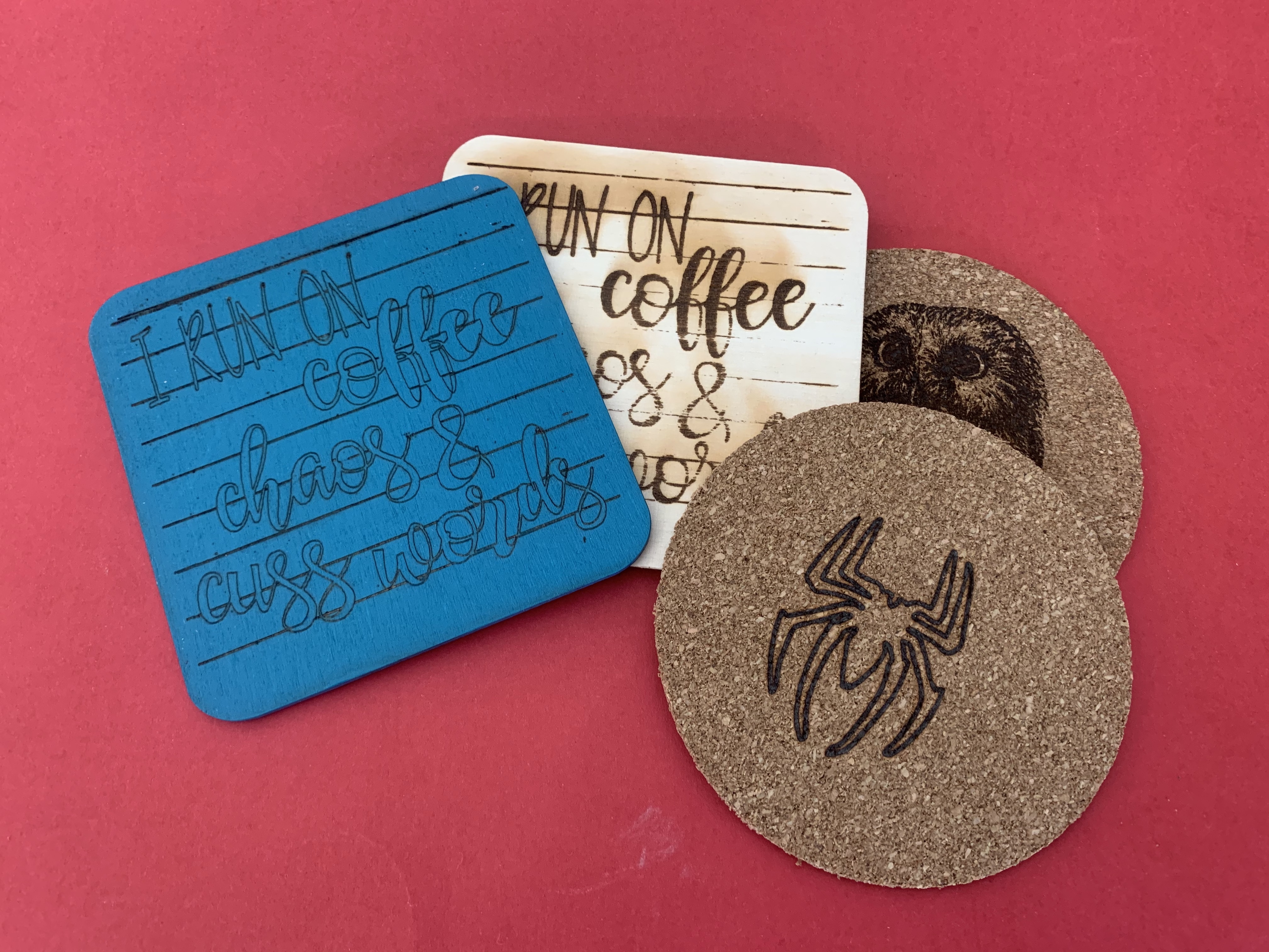 Im letzten Schritt wählt man das zu lasernde Material aus. Diverse Vorlagen für Stoff, Leder, Kork, Holz oder Pappe geben die passenden Daten für Laser-Stärke und Belichtungszeit schon vor, in der Praxis muss man aber etwas probieren. Wir haben einige Holz-Untersetzer gekauft, die mit der Standard-Belichtungszeit für Holz gerade mal minimale Spuren aufweisen, eine Holzkiste hingegen hat mit den gleichen Einstellungen schon millimetertiefe, verkohlte Gravuren. Mittels zweier Prozentregler kann man die richtigen Einstellungen für sein Material mit etwas Trial and Error selbst herausfinden. Die Zeit dafür – und den „Verschnitt“ im Material – muss man für ein gutes Ergebnis aber auf jeden Fall einplanen.