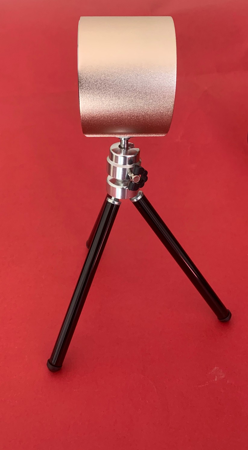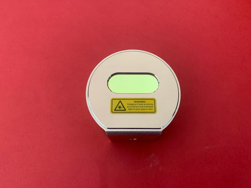 Während die meisten günstigen Laser-Gravurgeräte die Lichtquelle auf Schienen über dem Werkstück hin- und herfahren, ist der Laser Pecker ein kompaktes Gerät im Format eines kleinen Joghurtbechers. Statt grober Mechanik sitzen im Inneren motorgetriebene Spiegel, die den Laserstrahl durch ein Fenster auf der Unterseite lenken. Das Gehäuse ist aus Alu gefertigt und wirkt erfreulich hochwertig. Ein Akku ist nicht integriert, der Pecker arbeitet aber an einer USB-Powerbank, wenn sie die Stromaufnahme von 2 A unterstützt.