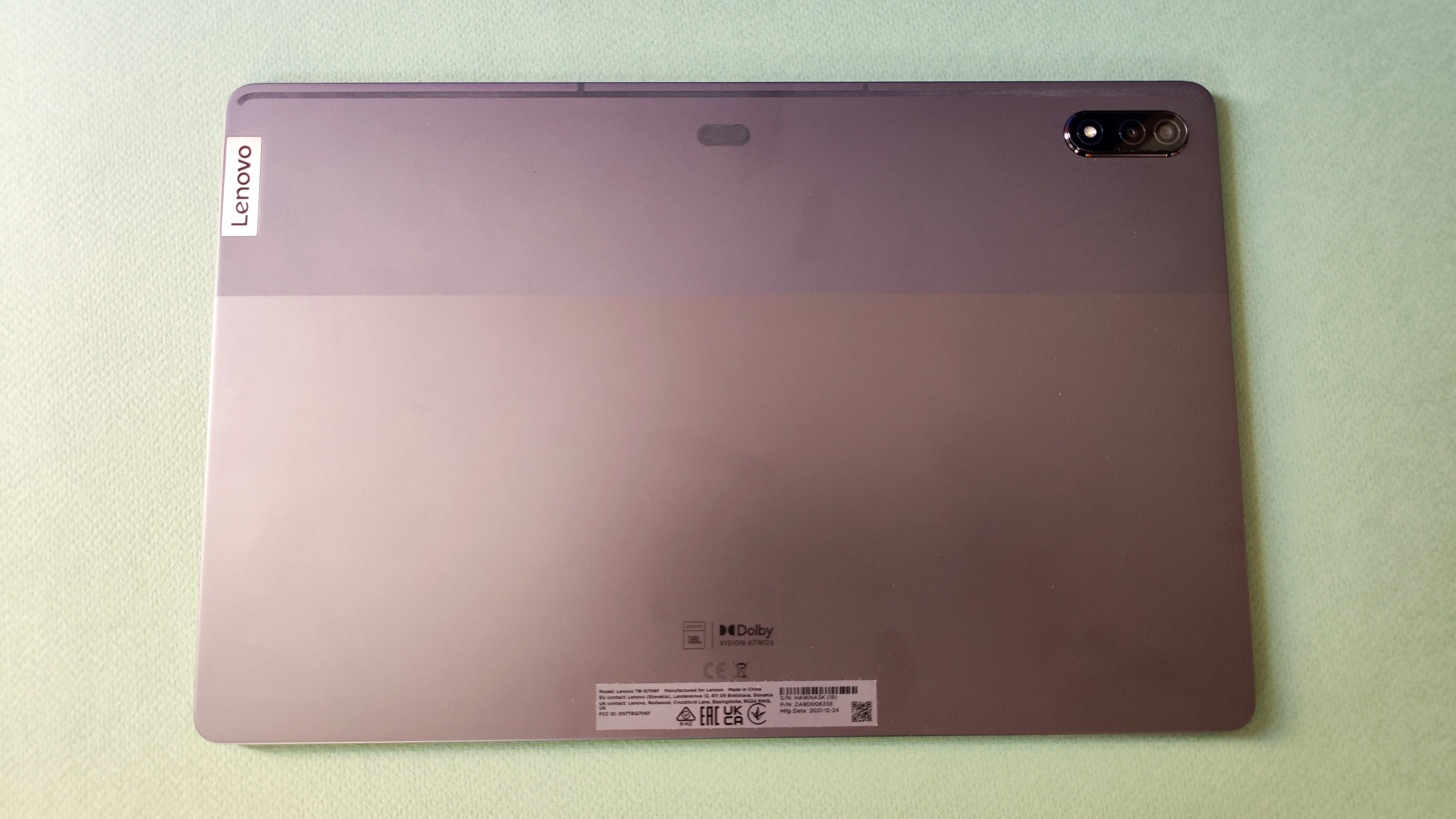 Das Kameraelement mit zwei Linsen und LED-Blitz auf der Rückseite befindet sich in einer glänzend schwarzen ovalen Erhebung, die nur minimal hervorragt. Typisch für Lenovo-Tablets: Das obere Drittel der Rückseite ist optisch mit einer matten Lackierung hervorgehoben, während der Rest in seidenmatt erstrahlt. Fingerabdrücke sind so gut wie gar nicht sichtbar auf der Rückseite. Die Webcam vorn ist mittig oben im schmalen Rahmen rund ums Display untergebracht.