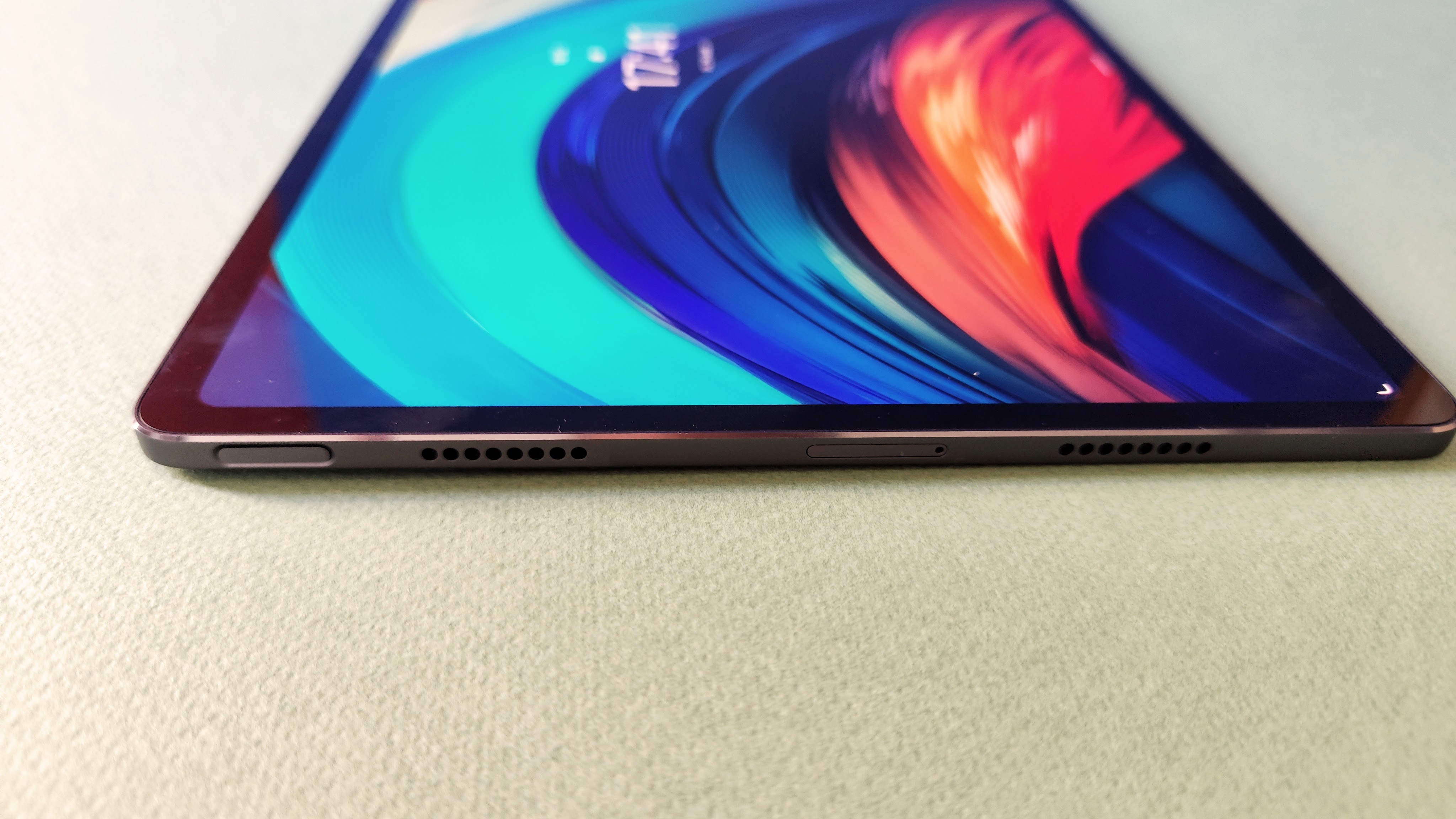 Das Lenovo Tab P12 Pro macht mit seiner dunkelgrauen Metallic-Lackierung gleich auf den ersten Blick einen äußerst hochwertigen und seriösen Eindruck. Das Gehäuse ist komplett aus Aluminium und wirkt stabil und verwindungssteif. Die Verarbeitung ist tadellos, so stören weder Spaltmaße noch wackelige Komponenten. Der Power-Button sitzt links eben auf der kurzen Seite, darin integriert ist der Fingerabdrucksensor. Für die Lautstärke kommen zwei Tasten auf der langen Oberkante zum Einsatz mit festem Druckpunkt. Einen Schutz vor Flüssigkeiten nach IP bietet das Tab 12 Pro allerdings nicht, diesen besitzt aber nahezu kein Tablet abgesehen vom Samsung Galaxy Tab Active 3 (Testbericht).