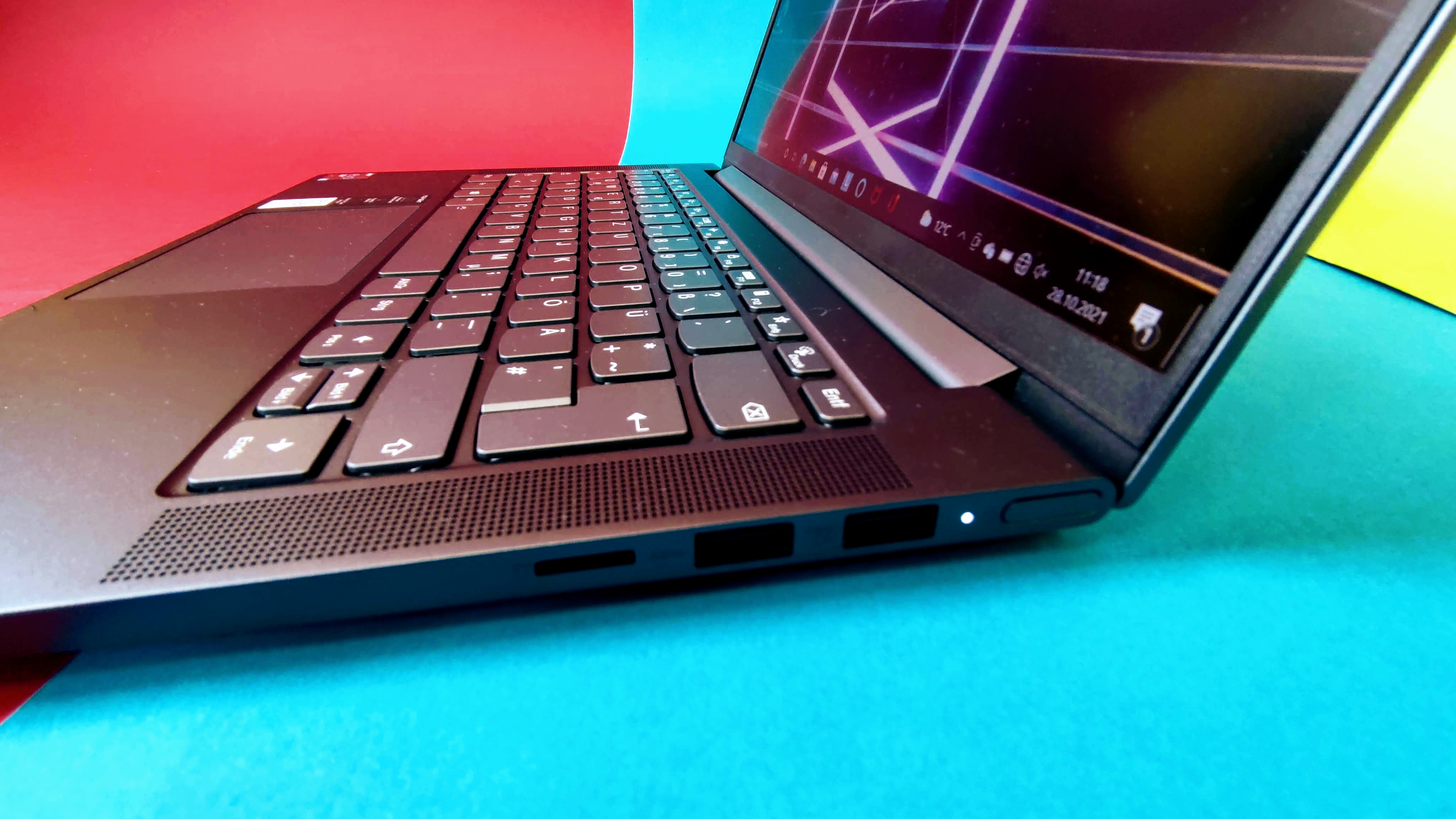 Für Leistung sorgt beim Yoga Slim 7 ein Intel Core i5 der elften Generation („Tiger Lake“). Der Prozessor sorgt für eine starke Leistungsfähigkeit für verschieden Aufgaben mit Fokus auf Produktivität. Beim Benchmark-Test von PCmark 10 erreichten wir damit durchschnittlich 4800 Punkte. Damit liegt das Notebook auf Augenhöhe mit dem Acer Swift 5 (Testbericht) und übertrumpft sogar leicht das Lenovo Yoga 7i Carbon (Testbericht). Mit dem Lenovo Yoga Slim 7 Pro (Testbericht) mit AMD-CPU kann es allerdings nicht mithalten. Der Lüfter ist bei hoher Belastung bemerkbar – der Lärm hält sich jedoch noch angenehm in Grenzen.