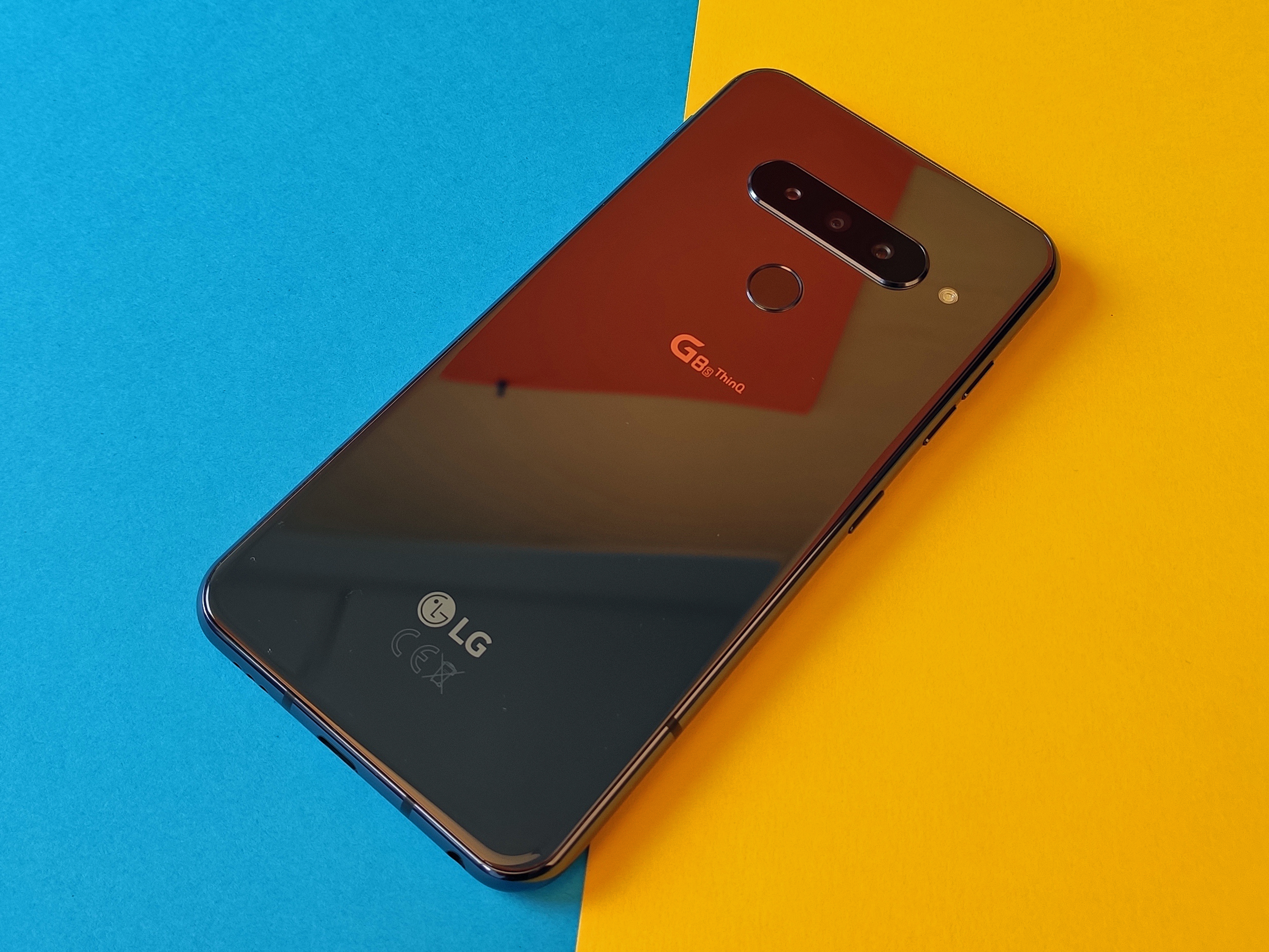 Die Rückseite besteht aus Glas und spiegelt stark. Auffällig ist vor allem die horizontal angeordnete Hauptkamera mit drei Linsen, die leicht aus dem Gehäuse hervorsteht. Bis auf den runden Fingerabdrucksensor und mehrere silberne Beschriftungen gibt es keine weiteren Elemente. Das Glas der Rückseite ist an den Rändern sanft abgerundet und geht fast nahtlos in den Rahmen über. Der ist ebenfalls abgerundet und insgesamt gut verarbeitet, besteht allerdings aus Kunststoff. Für ein Smartphone zum Preis von 770 Euro ist das unpassend. Ansonsten gibt es kaum Grund zur Kritik, das LG G8s ThinQ wirkt insgesamt hochwertig und ist mit 155,3 × 76,6 × 8 Millimeter und 181 Gramm Gewicht für ein Smartphone mit 6,2-Zoll-Display auch handlich genug. Der Schutz gegen Wasser und Staub nach IP68 ist vorbildlich, ebenfalls der Schutz gegen sonstige Einflüsse nach MIL-STD 810G. Da muss man sich trotz Glasrückseite wenig Sorgen um das Smartphone machen.