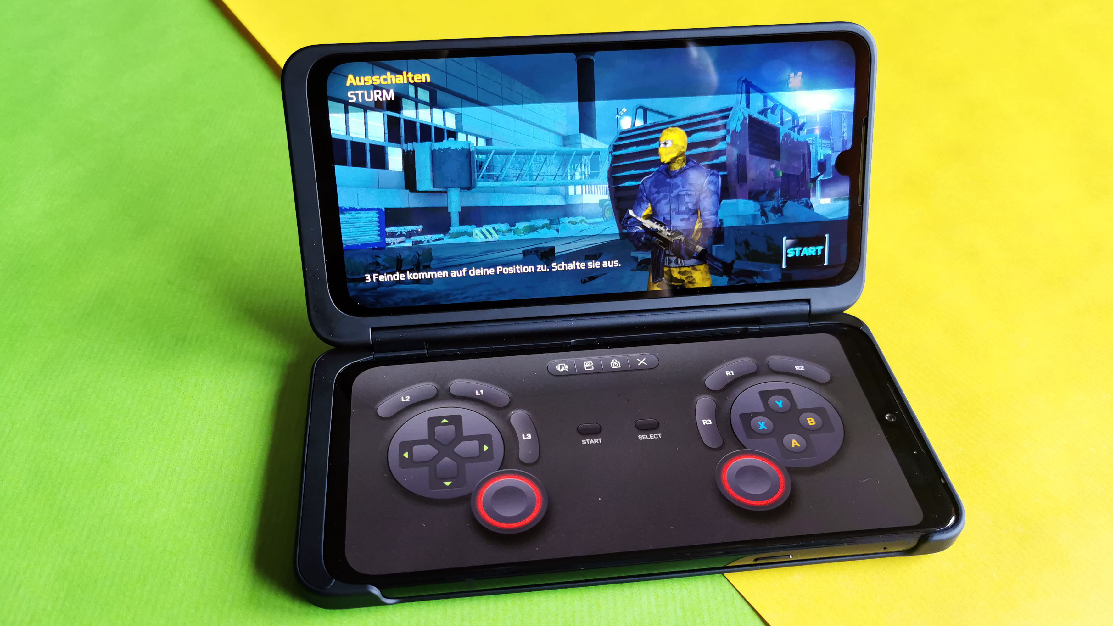 Für Spiele mit Controller-Unterstützung bietet LG außerdem ein virtuelles Gamepad an, das dann einen der beiden Bildschirme einnimmt, während der andere das Spiel darstellt. Das funktioniert klasse und lässt beinahe so etwas wie Konsolen-Feeling aufkommen. Eine ähnliche Aufteilung ist etwa auch bei Chatprogrammen und virtueller Volltastatur möglich. Besondere Komfortfunktionen gibt es darüber hinaus nicht. Über ein kleines, frei an einem beliebigen Bildschirmrand platzierbares Icon lässt sich zwar ein Menü mit Befehlen für den Doppelbildschirmbetrieb aufrufen. Dessen Inhalt beschränkt sich aber im Wesentlichen auf den Inhaltstausch der Displays. Per Drag&Drop etwa ist das nicht möglich. Auch die Verwendung von zwei mal der gleichen App gleichzeitig erlaubt das Smartphone nicht immer.