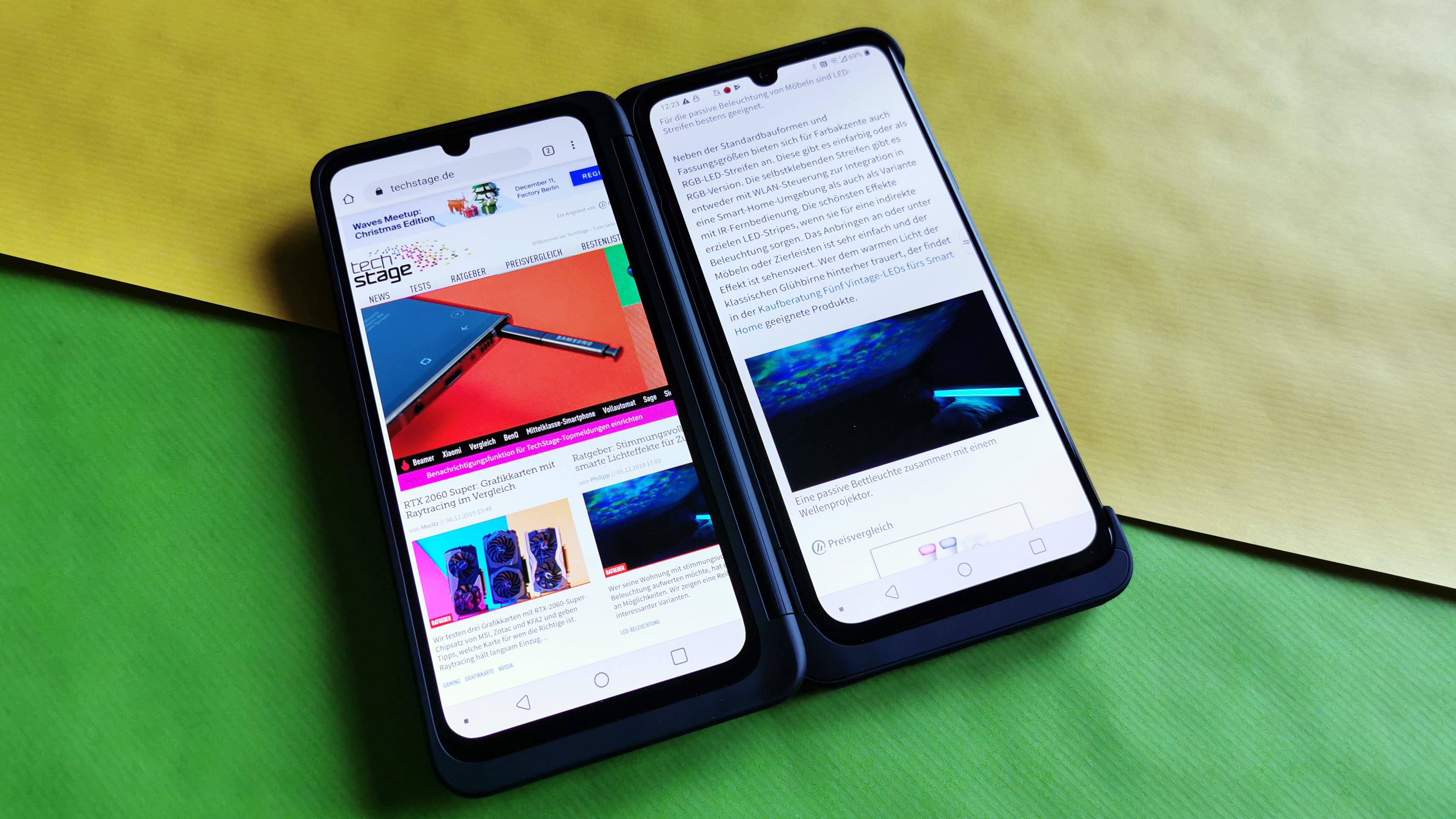 Neben seiner Funktion als Schutzhülle sind natürlich das zweite Haupt-Display und die damit verbundenen Funktionen des LG G8X interessant. Um es kurz zu machen: Auch wenn es möglich ist, einige Apps wie den Browser im Vollbild auf beiden Displays darstellen zu lassen, macht das wenig Spaß. Grund ist das mächtige Scharnier, das einen rund 1 Zentimeter breiten Spalt zwischen beiden Screens erzeugt. Das separiert beide Bildschirme derart, dass eine gemeinschaftliche Darstellung unsinnig ist. Stattdessen ist das zusätzliche Display eher als zusätzlicher Platz für eine parallel laufende zweite App zu sehen. Dann dürfen Nutzer etwa gleichzeitig Mails checken und nebenher ein Youtube-Video schauen, Nachrichten lesen und parallel mit Kumpels chatten oder ähnliches.