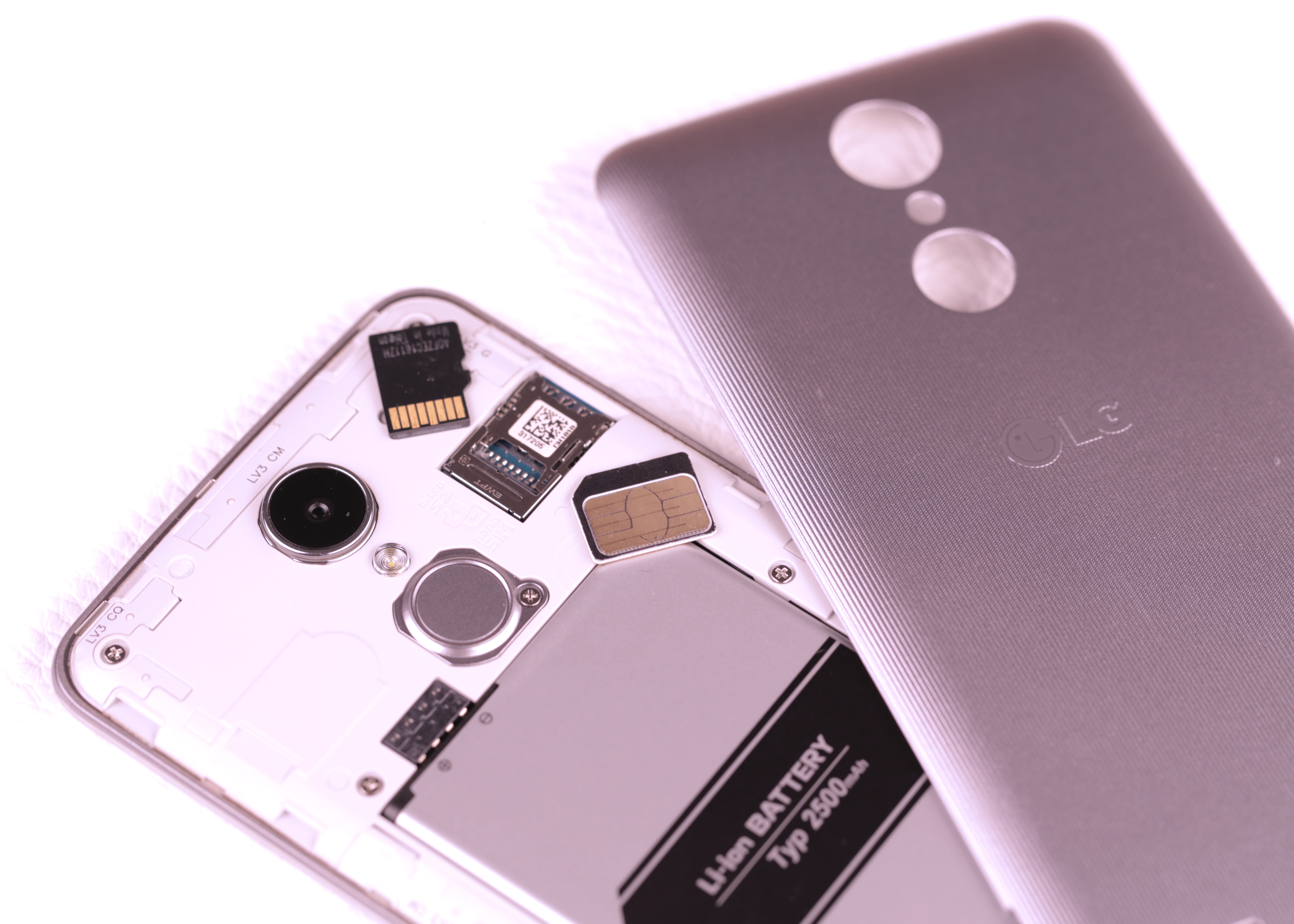 Zum Laden setzt das K8 auf microUSB statt USB-C. Zusätzlich ist noch ein klassischer Kopfhöreranschluss verbaut. Um den Speicher zu erweitern, gibt es die Möglichkeit, eine microSDHC-Karte mit bis zu 32 GByte einzusetzen. Die Slots für SIM- und Speicherkarte sind, genau wie der austauschbare 2125 mAH-Akku, nur nach dem Öffnen der Rückseite erreichbar.