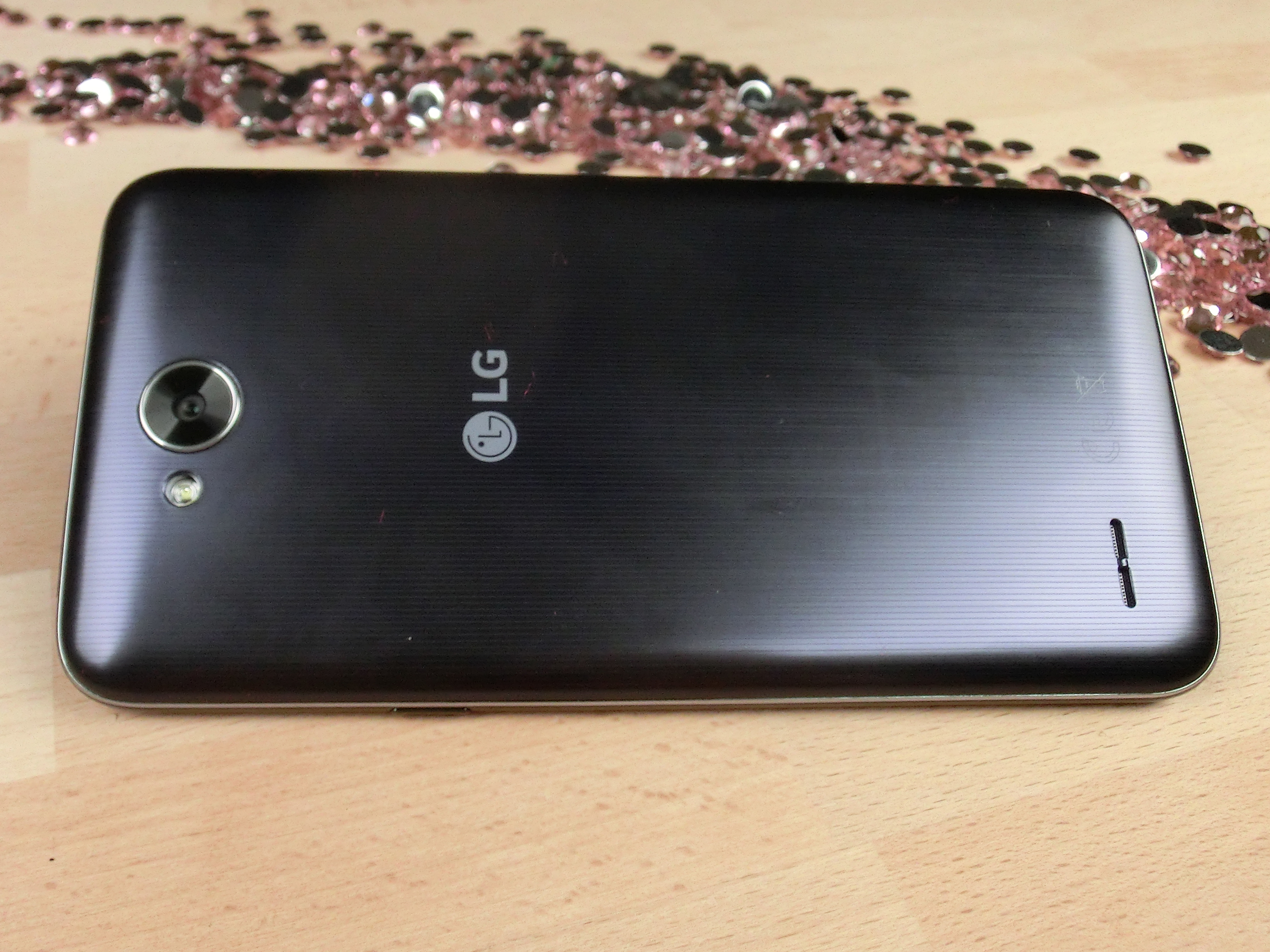 Die fest verbaute Rückseite aus Kunststoff fühlt sich nicht besonders hochwertig an. Zwar knarrt und knirscht das LG auch bei größerem Kraftaufwand nicht, aber die Haptik ist einfach nicht gut. Auch das Nadelstreifen-Design und die ordentliche Verarbeitung schaffen es nicht, den etwas billigen Eindruck wettzumachen. Die Rückseite unseres Testgerätes war zudem extrem anfällig für Schmierer und Fingerabdrücke.