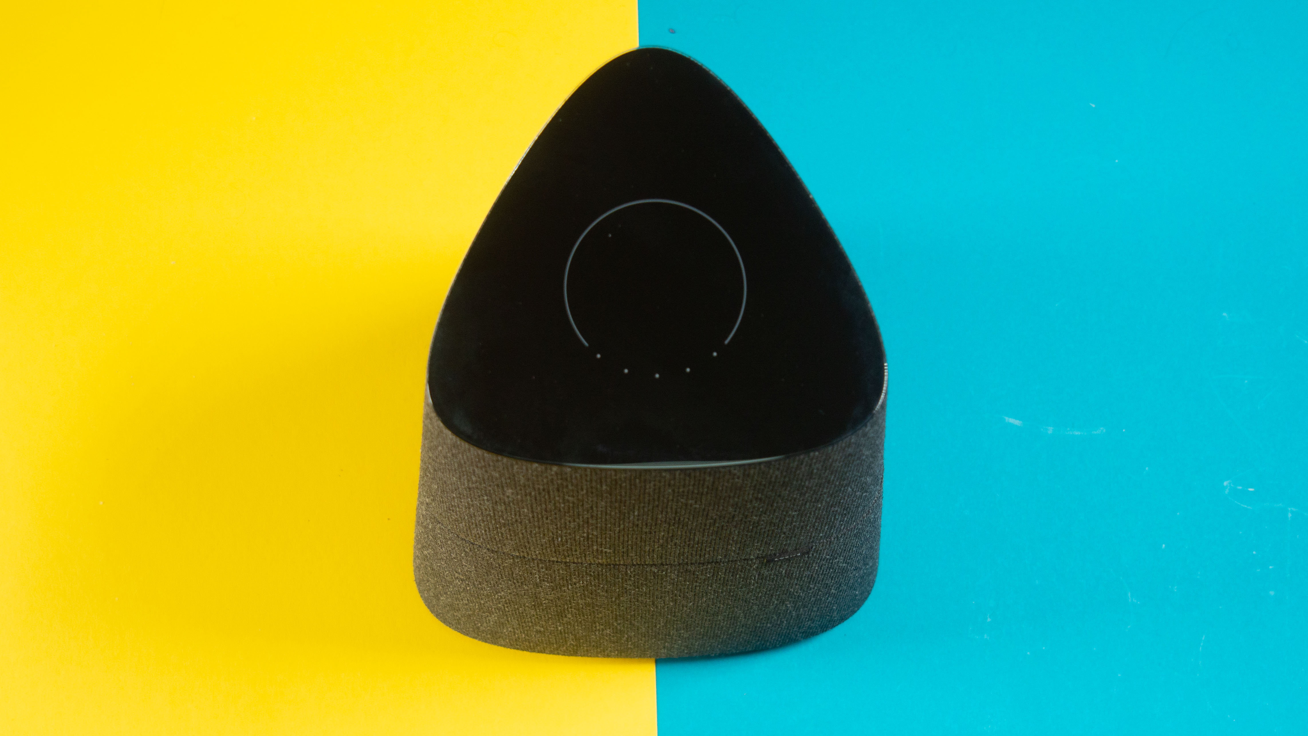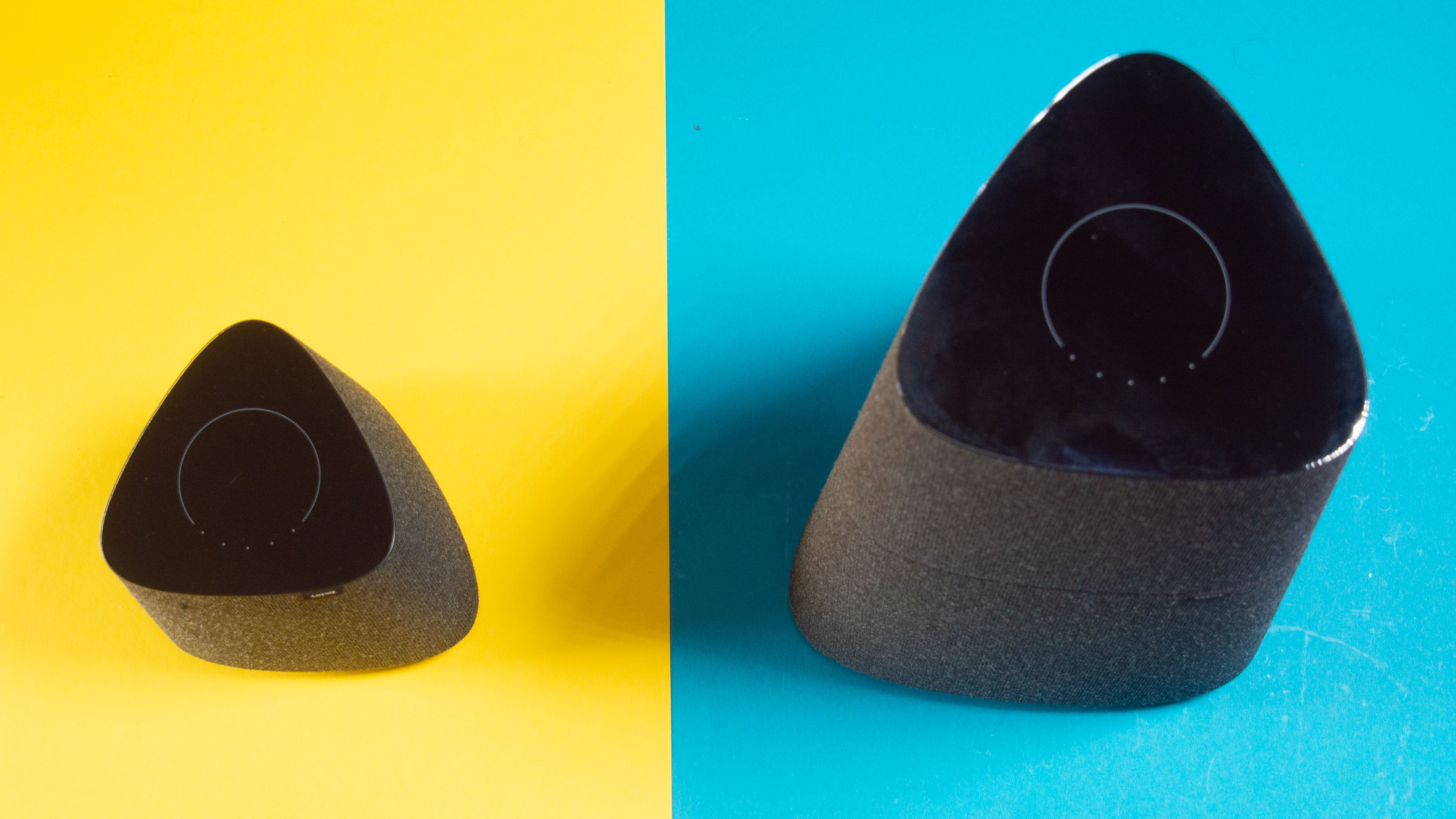 Nicht rund, nicht elliptisch, nicht quaderähnlich oder achteckig: Loewe liefert den Klang in dreieckigen, abgerundeten Pyramiden mit schwarzem, polierten Bedienteil oben und dunkelgrauer Akustikstoff-Bespannung. Der Klang MR5 ist mit 22,5 cm Breite, 21,5 cm Tiefe und 40,1 cm Höhe sowie 4,4 kg Masse das größte Modell und durchaus dafür bestimmt, im Wohnzimmer aufzuspielen – auch als Stereo-Pärchen.