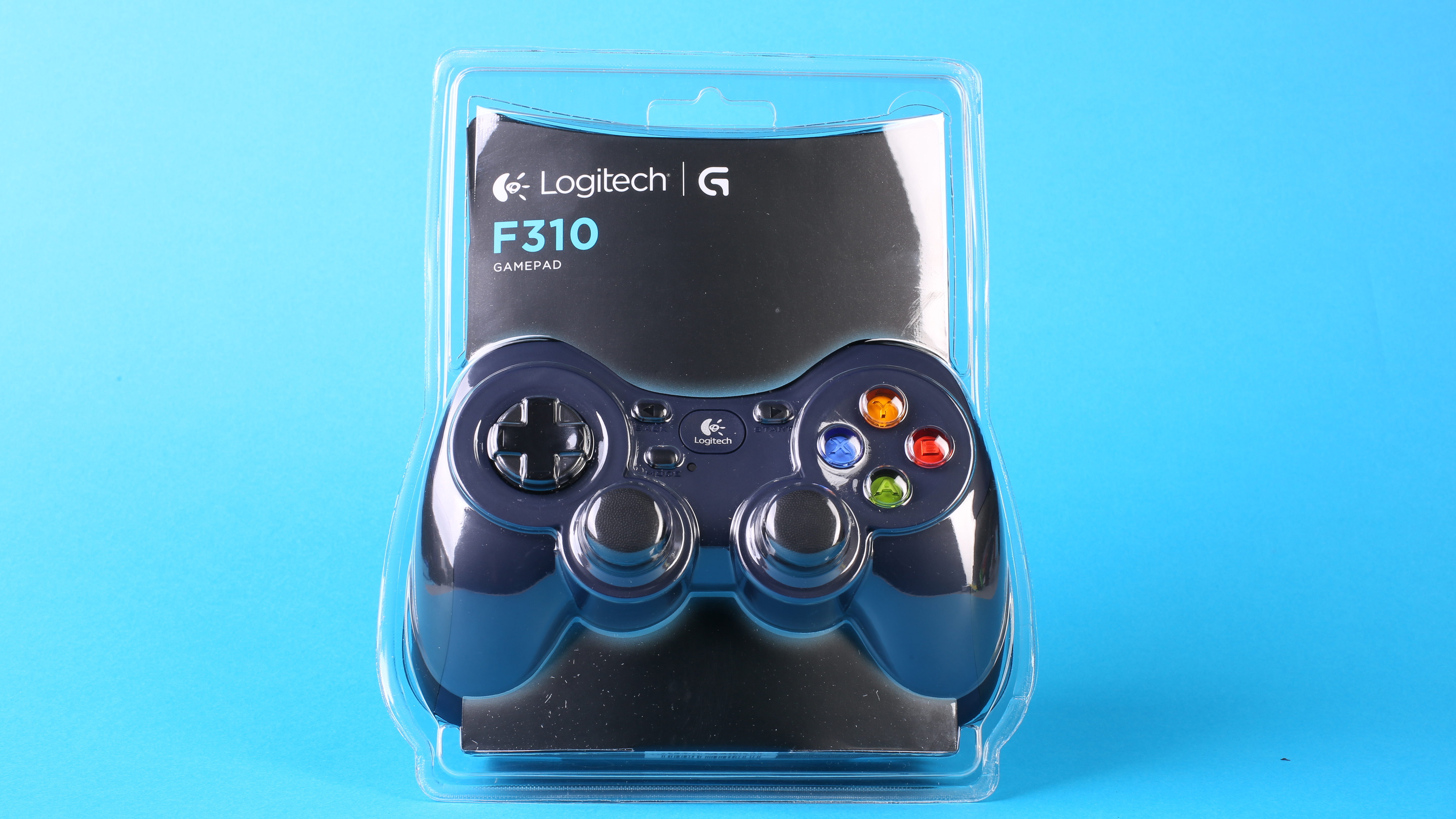 Das USB-Gamepad F310 gelangt in einer einfachen Blisterverpackung zu den Käufern. Das Design entspricht einer Mischung aus XBox-Controller und Playstation-Gamepad: Der Hersteller hat die beiden analogen Sticks nach Vorbild bei der Playstation angeordnet, die Farbe und Beschriftung der Aktions-Taster orientiert sich allerdings am XBox-Controller. Obwohl keine Vibrationsmotoren für haptisches Feedback verbaut sind, ist der F310 mit 213 Gramm recht schwer und wirkt damit nicht billig.