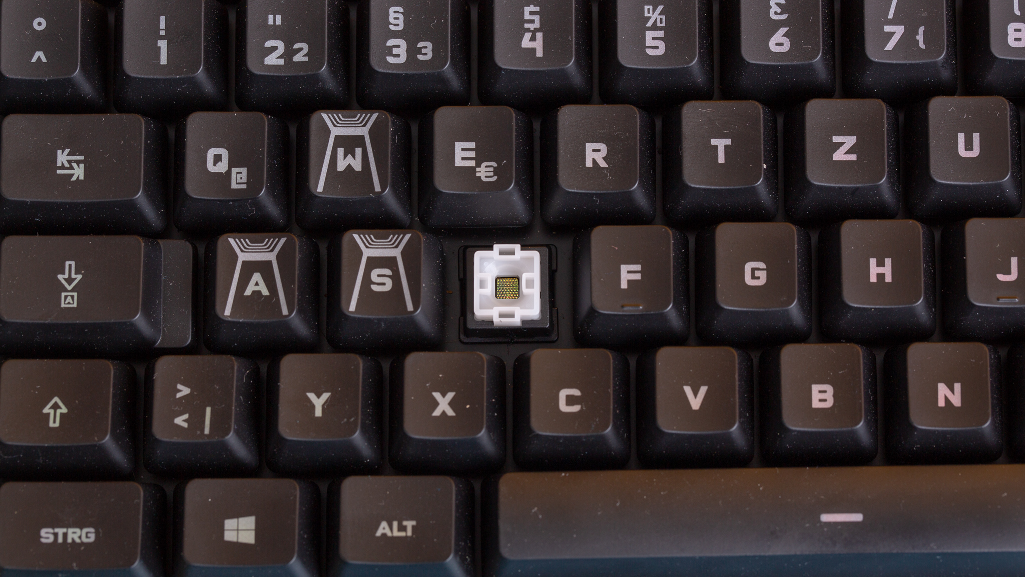 Ein großer Unterschied der Romer-G-Tasten ist die Platzierung der RGB-LEDs: Diese sitzen mittig im Schalter und strahlen direkt nach oben. Bei anderen Systemen, etwa den Yellow Switches von Razer, sitzen sie neben dem Taster und beleuchten die Kappen seitlich. Bis zu 16,5 Millionen Farben sind möglich — in der Realität nutzt man deutlich weniger.