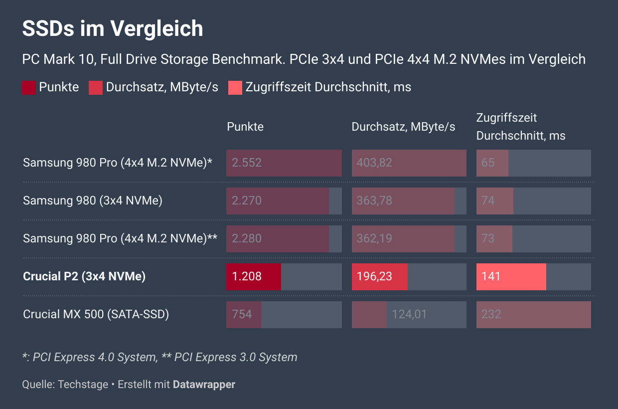 Die Crucial P2 bricht keine Geschwindigkeitsrekorde. Sie zeigt aber, wie günstig man die aktuelle Version von PCIe 3x4 NMVe SSDs bekommen kann. Preislich liegt sie oft unterhalb gleich großen SATA-SSDs. Da sie diese locker im Alltag schlägt, sollten alle, die günstig nach mehr Speicher suchen eher zur Crucial P2 als zu einer SATA-SSD greifen.