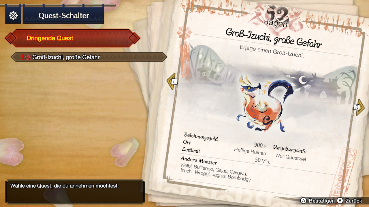 Die Aufträge für die Monsterjagd erhalten Spieler über verschiedene Auftragsgeber, die unterschiedliche Quests ausgeben. Die Dorf- und Stätte-Quests gleichen sich inhaltlich, wobei Stätte-Quests eine größere Herausforderung darstellen, die besonders für den lokalen oder online Mehrspielermodus mit bis zu drei weiteren Spielern vorgesehen sind. Wer sich bereits auf einen der fünf Jagdgründe befindet, kann zudem Nebenquests annehmen, die mit Materialien und anderen Belohnungen locken. Die Jagdgründe gestalten sich visuell sehr divers, mit feurigen Lavahöhlen, den schneebedeckten Frostinseln oder auch der Sandebene. Jeder der Jagdgründe ist nicht nur die Heimat mehrerer Monster, sondern bietet auch ganz eigene Ressourcen. Letztendlich verfolgen Spieler also stets das simple Ziel, das nächste Monster zu erlegen. Dank abwechslungsreicher Kulissen und verschiedenen Quest-Typen, bietet Capcom jedoch einige Nuancen und verhindert so, dass das Gameplay eintönig erscheint.