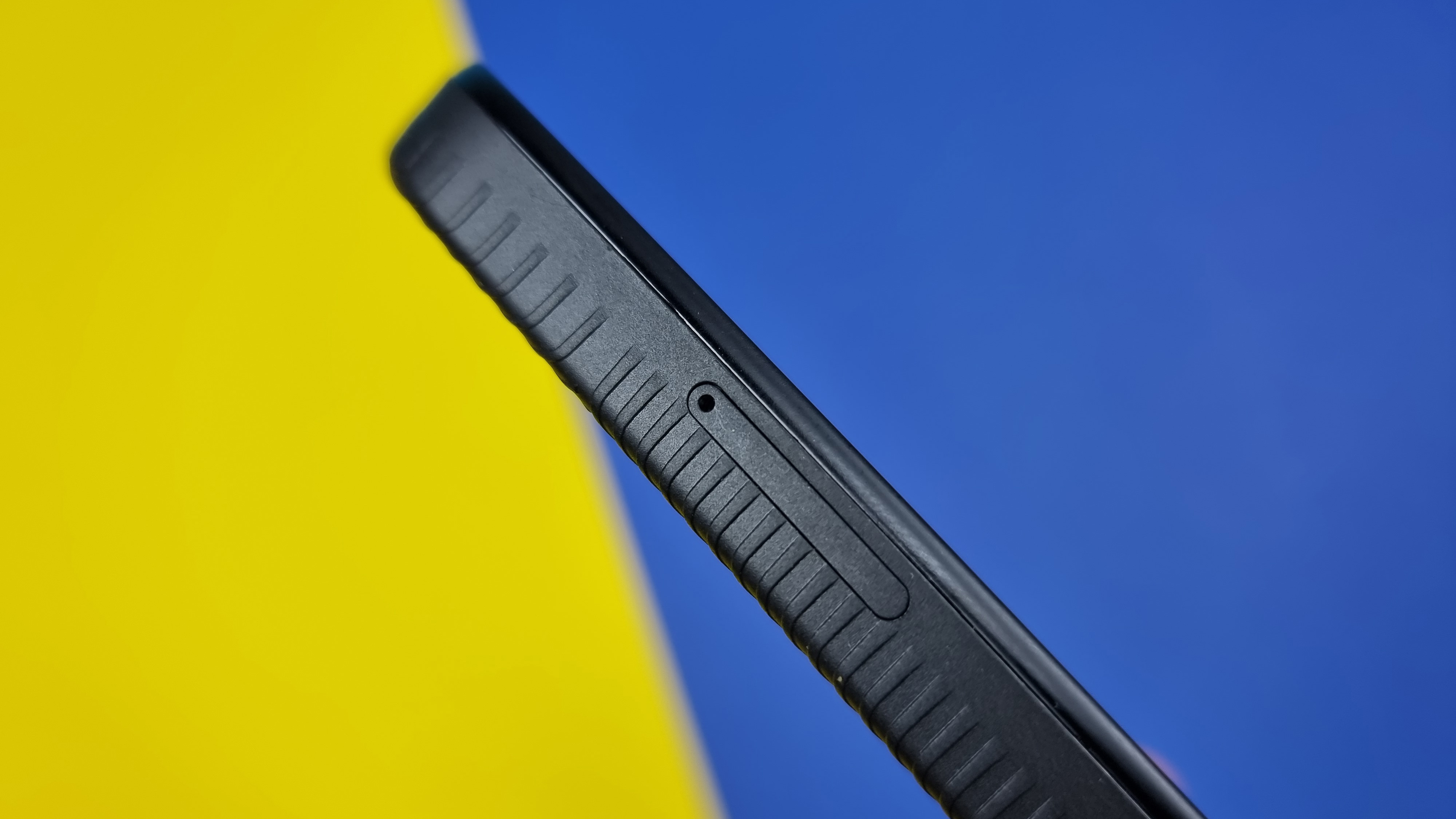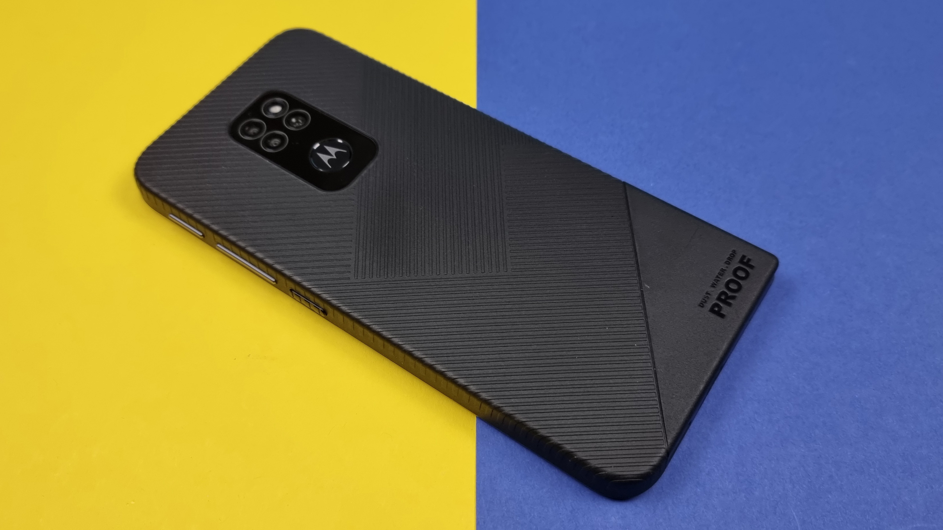 Bei genauerem Hinsehen werden dann aber doch Besonderheiten eines Outdoor-Handys sichtbar. So wiegt das Motorola Defy mit 232 Gramm mehr als normale Modelle, auch wenn das noch vergleichsweise harmlos für ein Ruggedphone ist. Außerdem ist das Gerät recht kantig und damit wenig handschmeichlerisch ausgelegt, wobei der Rahmen rings um den Bildschirm als schützender Wall beim Fall die Widerstandskraft des von Gorilla Glas Victus erhöhen soll. Zudem ist die untere linke Ecke kantiger ausgeprägt und bietet so Platz für einen Lanyard, also eine Handschlaufe, die solches Hinunterfallen ganz unterbinden soll. Dieses praktische Designmerkmal lässt das Gerät leicht asymmetrisch, aber auch interessant wirken. Auch auf der Rückseite hat man sich einiger Design-Elemente bedient, die bei einem Outdoor-Smartphone nicht unbedingt zu erwarten sind. Dort platziert der Hersteller einige grobe, in 90-Grad-Versatz zueinander positionierte Schraffuren, die diagonal aufgebracht sind. Etwas filigraner ausgeführt könnten sie auch jedes herkömmliche Modell aufhübschen.