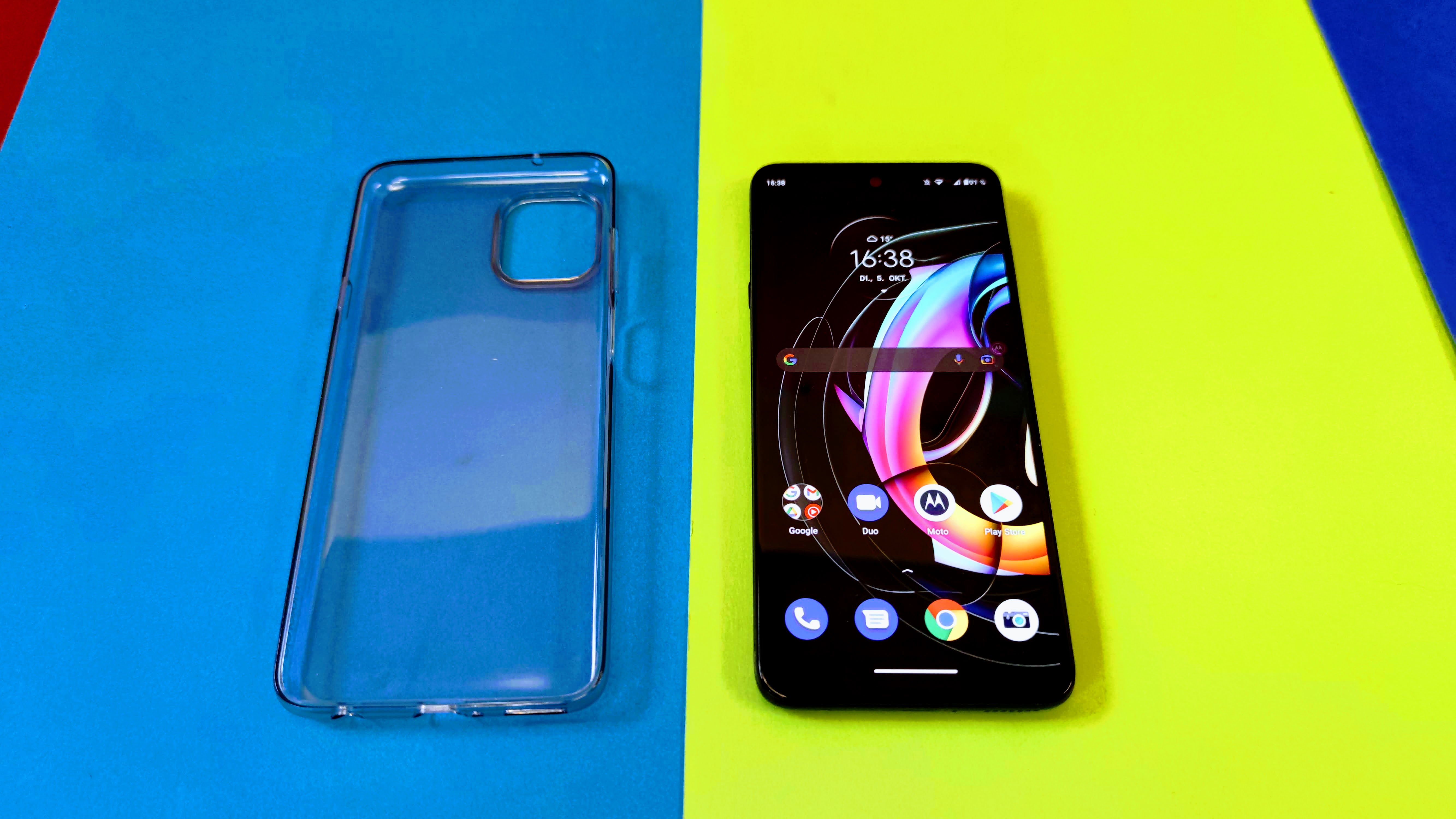 Die Verarbeitung ist tadellos. Es stören weder Spaltmaße noch wackelige Komponenten. Der Druckpunkt der Tasten ist solide. Die Rückseite und der Rahmen sind aus Kunststoff, machen aber aufgrund der effektvollen Färbung einen wertigen Eindruck. Allerdings ist die Oberfläche des Smartphones trotz matter Lackierung anfällig für Fingerabdrücke. Sehr praktisch: Motorola legt dem Smartphone eine transparente Schutzhülle bei, die bei kleineren Stürzen die Lebensdauer des Edge 20 Lite verlängern dürfte. Der Fingerabdrucksensor ist im Power-Button auf der rechten Seite integriert, wo sich zudem die Lautstärkewippe findet. Gegenüber bietet das Edge 20 Lite einen Knopf zum Aktiveren des Google Assistant.