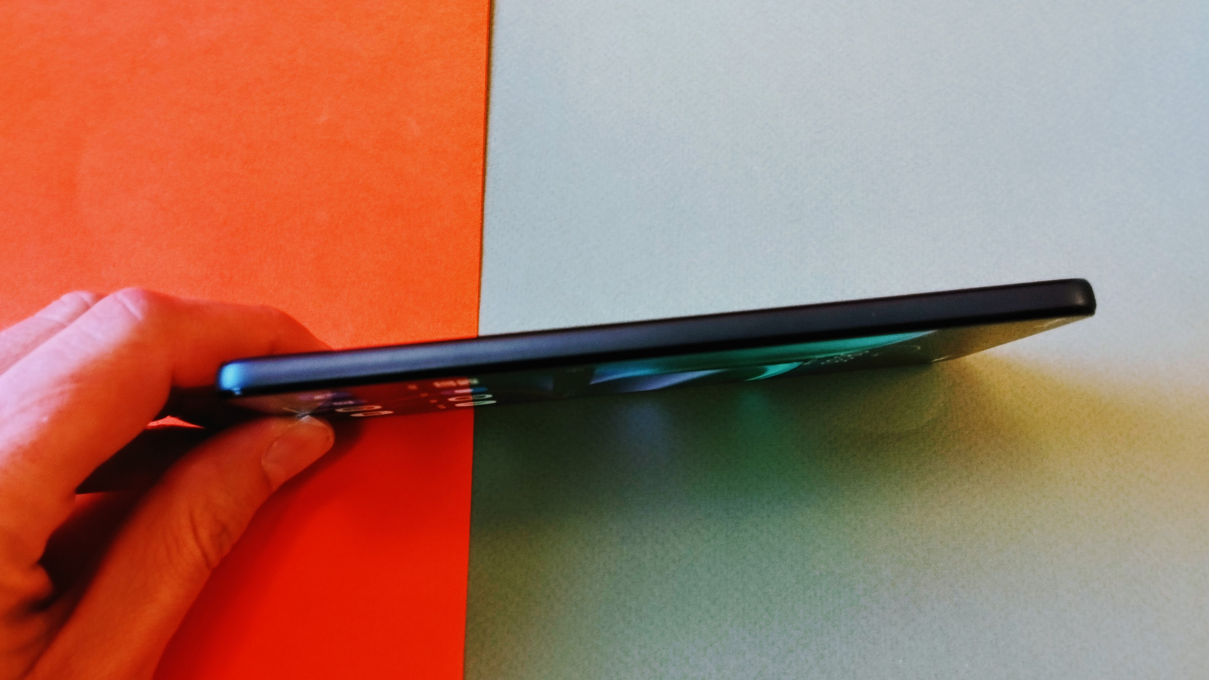 Die Verarbeitung des Gehäuses ist erstklassig. Spaltmaße gibt es keine, die Power-Taste wie auch die Lautstärkewippe auf der rechten Seite bieten einen soliden Druckpunkt. Die glatte Rückseite aus Kunststoff schimmert effektvoll im Licht. Allerdings ist sie auch empfänglich für Fingerabdrücke. Der Rahmen ist aus Metall. Für einen minimalen Schutz vor Tropfwasser sorgt die Zertifizierung nach IP52.