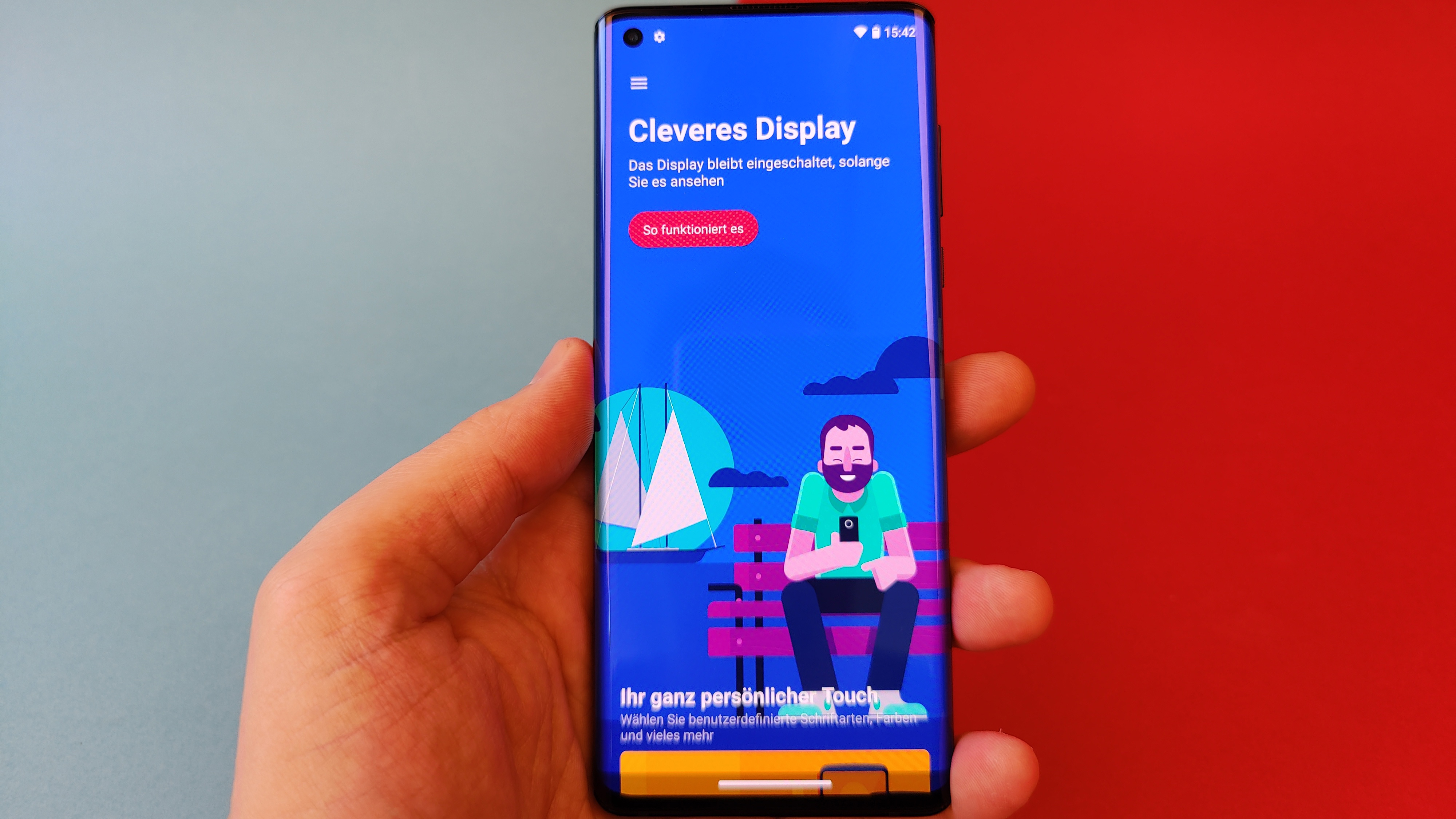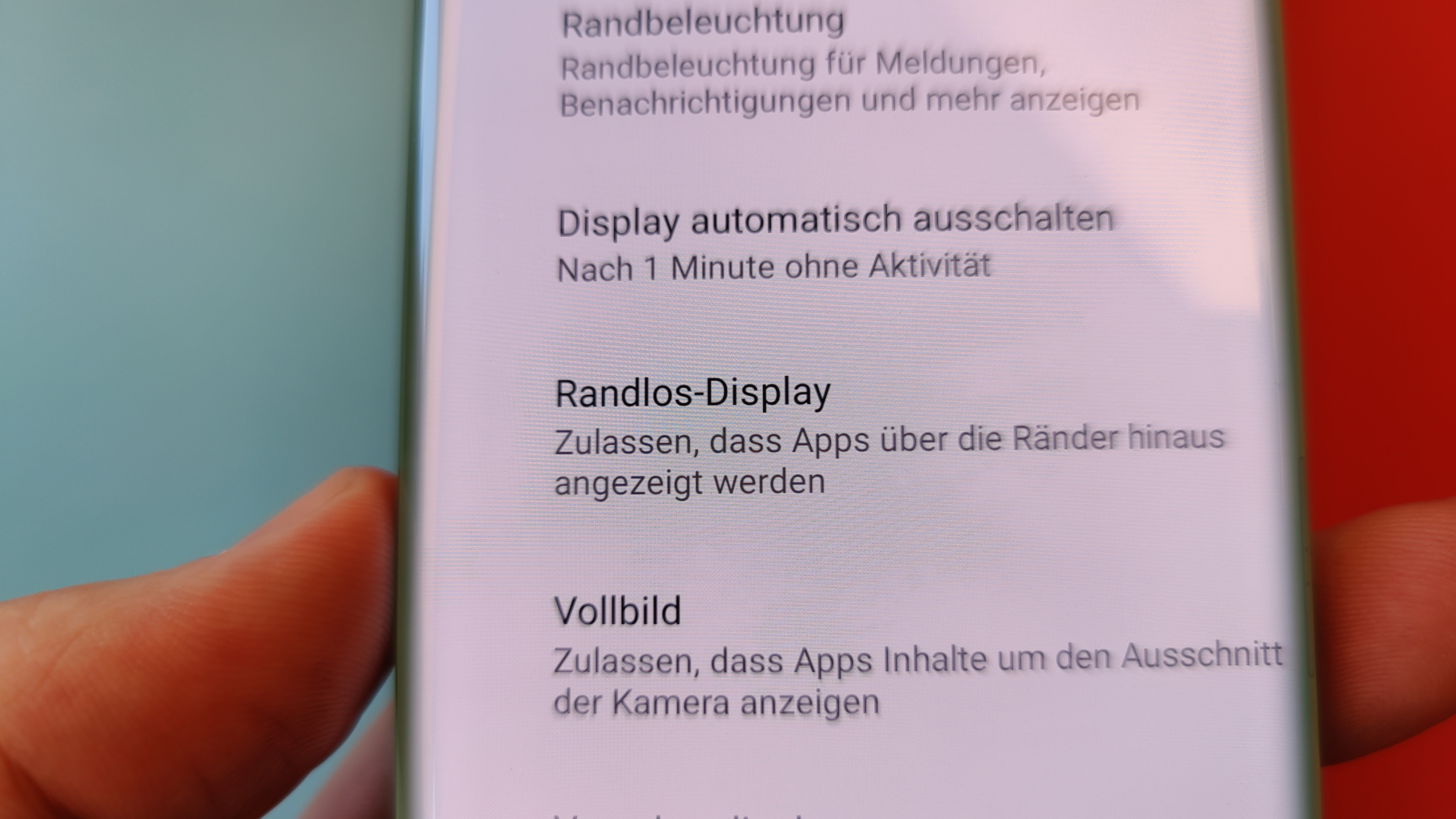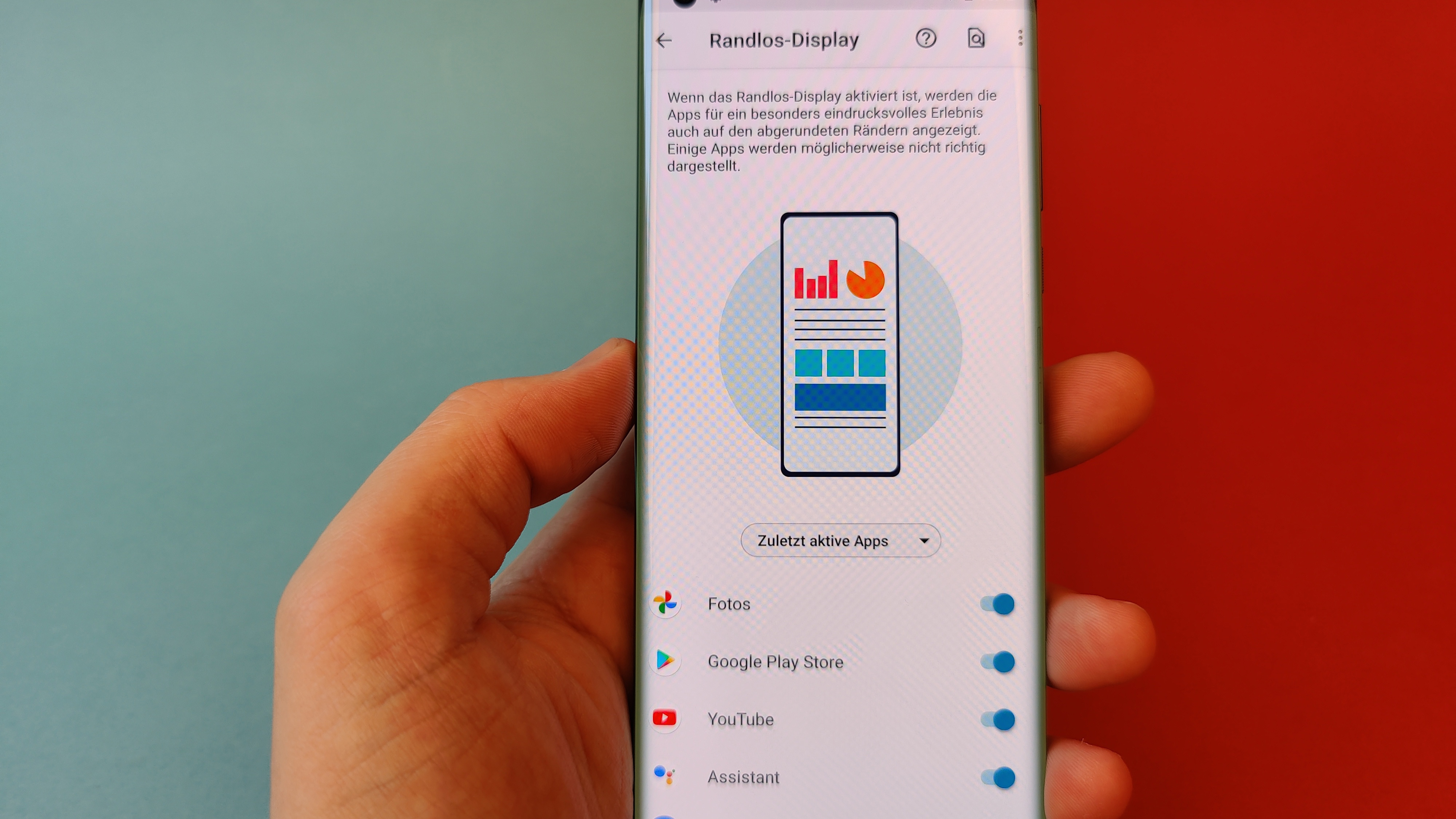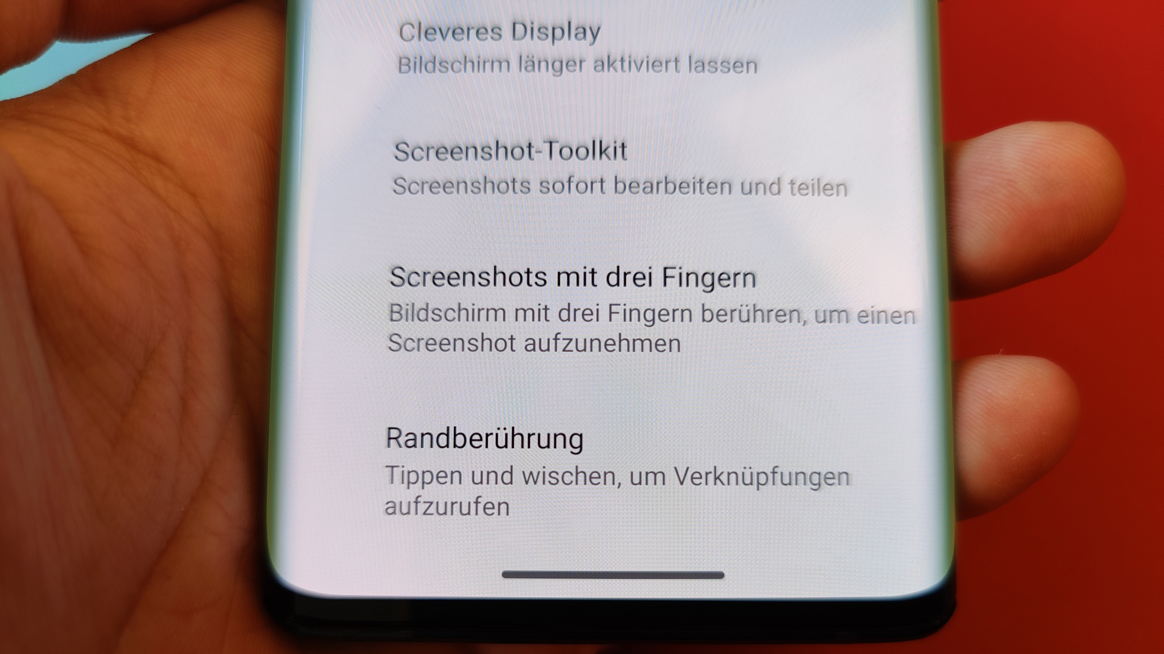 Das gilt auch für die restliche Darstellung – mit Ausnahme der Helligkeit. Denn während Kontraste, Schwarzwert und Blickwinkelstabilität wie fast immer bei OLED vorbildlich sind, könnte die Helligkeit – gemessen am Preis des Smartphones – ruhig etwas höher als die rund 420 cd/m² sein, die unser Messgerät ausgespuckt hat. Ein Beinbruch ist das aber nicht, auch wenn im Freien normalerweise zumindest bei direkter Sonneneinstrahlung eine Schattenspendende Hand parat sein sollte. Apropos Hand: Probleme mit ungewollten Berührungen des an den Seiten gebogenen Displays beim Halten in der Hand können wir nicht bestätigen. Wer dennoch auf Probleme stößt, sollte die im Lieferumfang befindliche Silikon-Schutzhülle ausprobieren, die sich recht weit um die seitlichen Kanten legt.