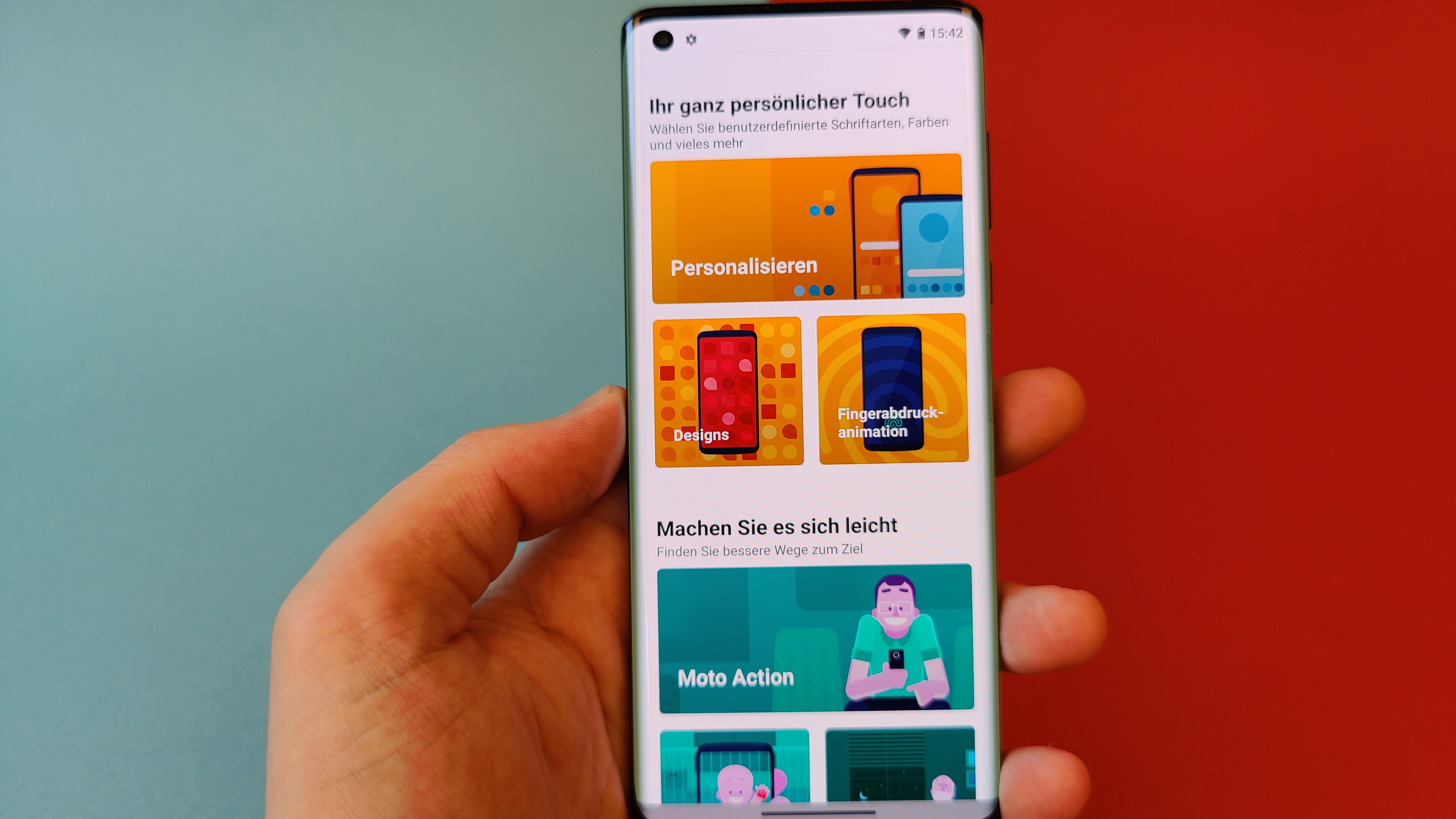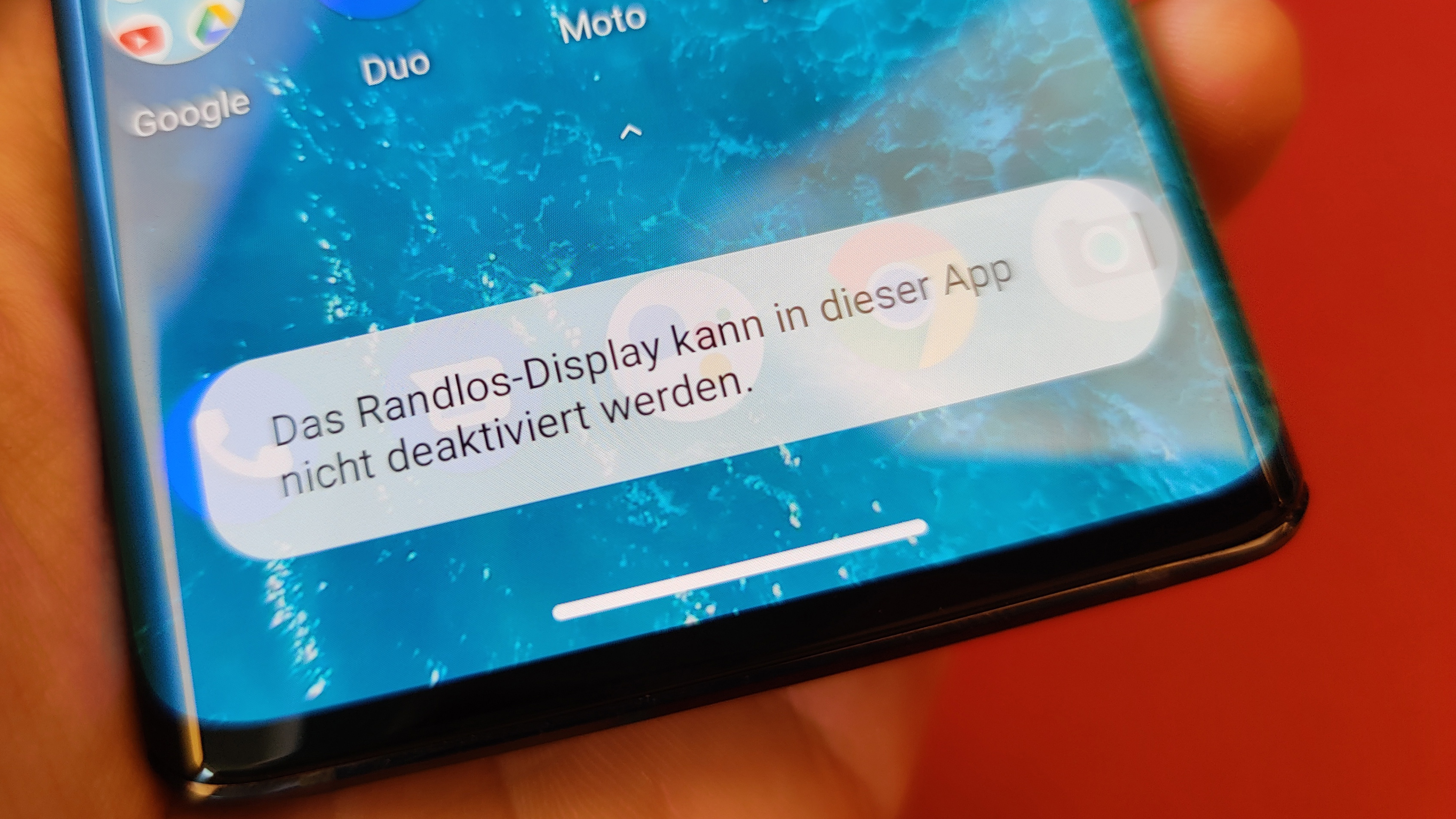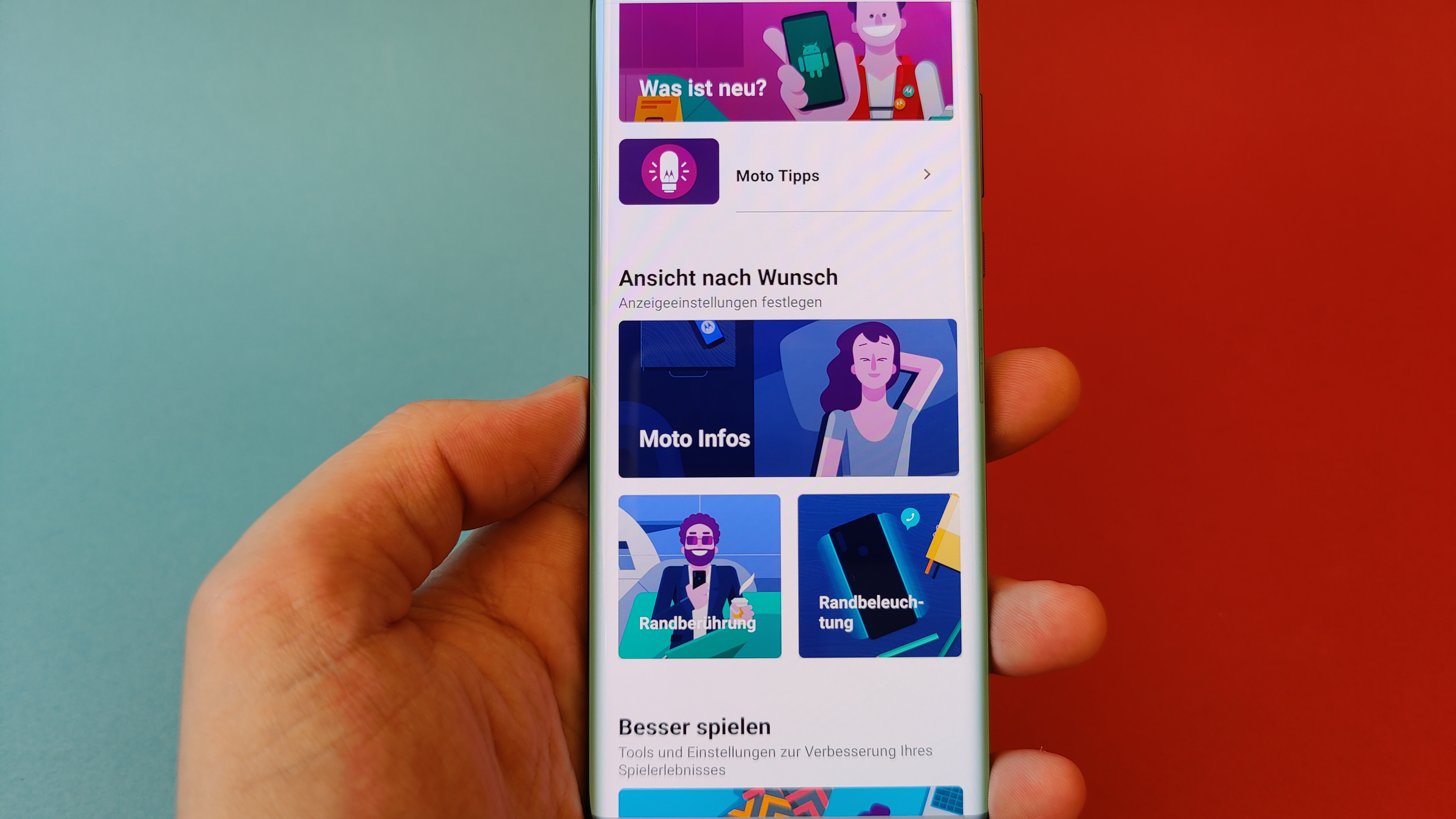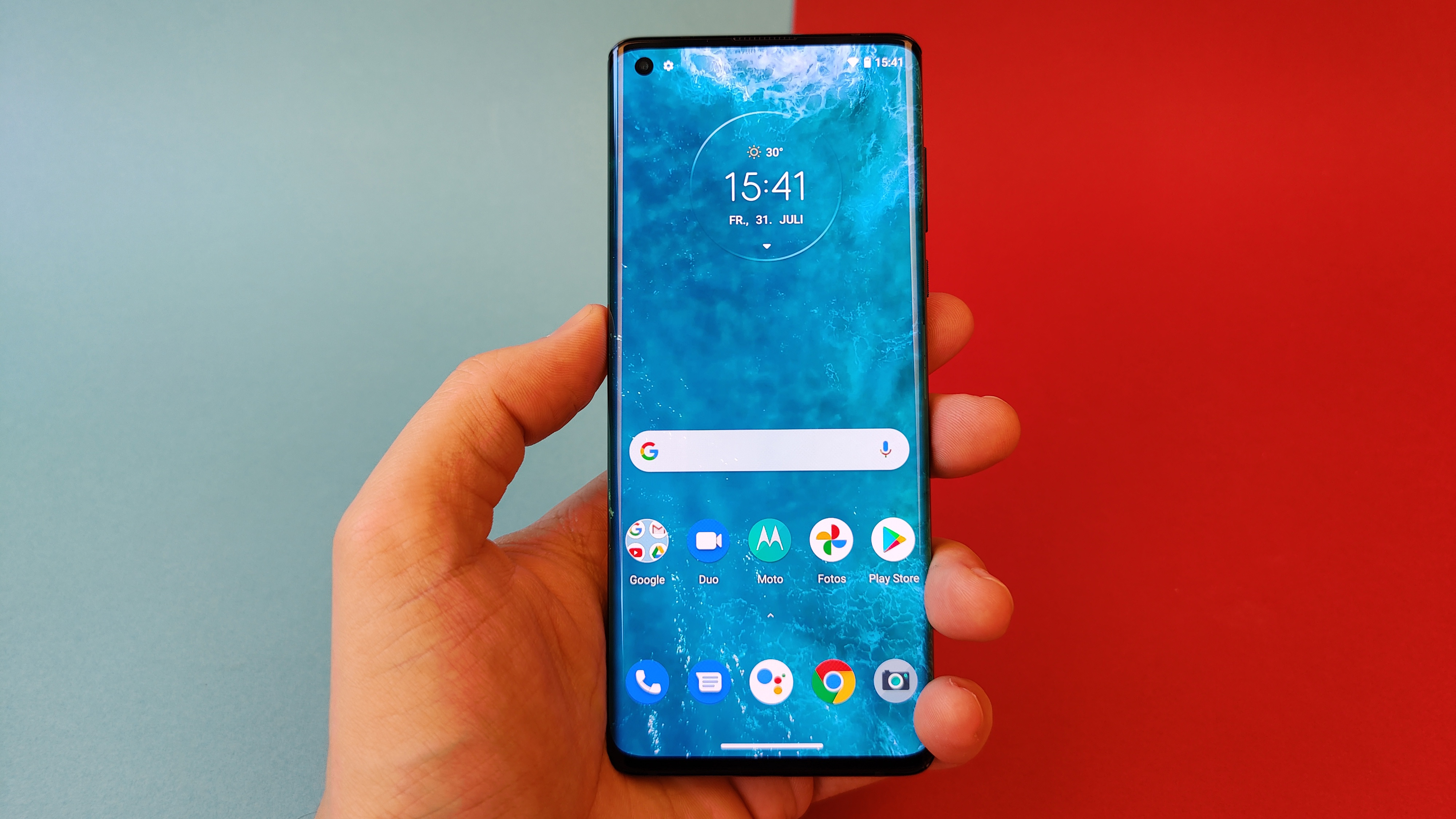 Wie inzwischen bei höherpreisigen Smartphones weitverbreitet spendiert auch Motorola seinem schicken Edge-Smartphone ein OLED-Display. Der Screen bietet eine Auflösung von 2340 × 1080 Pixel bei 6,7 Zoll Diagonale und kommt so auf eine Bildschärfe von nicht ganz 400 Pixel pro Zoll. Das reicht im Alltag allemal. Ein weiteres Highlight ist die 90-Hertz-Bildwiederholfrequenz, die bewegte Inhalte noch flüssiger wirken lässt. Dadurch sieht dann etwa das totschicke Live-Wallpaper, das je nach Streichrichtung Wellen von links oder rechts über den Bildschirm schwappen lässt, regelrecht beeindruckend aus.