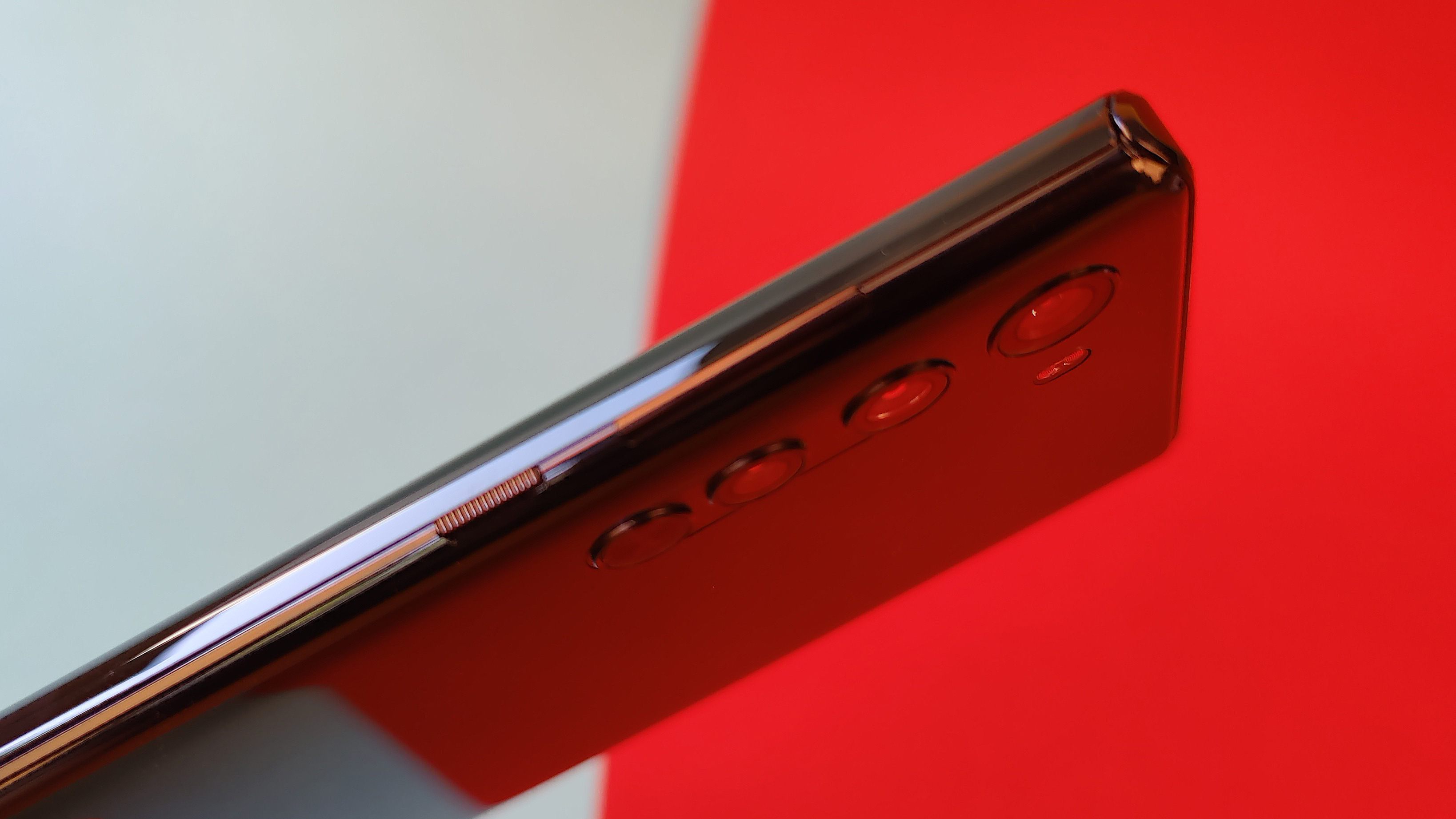Positiv hervorzuheben ist außerdem, dass fast nichts hervorgehoben ist – sprich: Die Kameralinsen auf der Rückseite sind fast plan ins Gehäuse integriert, auffällige Kameramodule wie bei Samsung oder Huawei gibt es nicht. Die Verarbeitung ist abgesehen von den genannten haptischen Einschränkungen hervorragend. Die nur beim genauen Hinsehen erkennbaren Antennenstreifen in Stirn- und Fußseite des Metallrahmens sind nicht fühlbar, auch sonst gibt es keine unregelmäßigen Spaltmaße. Insgesamt ist das Motorola Edge sehr verwindungssteif und wirkt daher solide. Die ausschließlich auf der rechten Seite platzierten Power- und Lautstärketasten sind ausreichend fest ins Gehäuse eingelassen und lassen sich sehr gut bedienen. Für unseren Geschmack ist allerdings der Powerbutton etwas zu weit oben platziert, sodass sich selbst Nutzer mit großen Händen immer leicht strecken müssen, um ihn mit dem Daumen erreichen zu können.