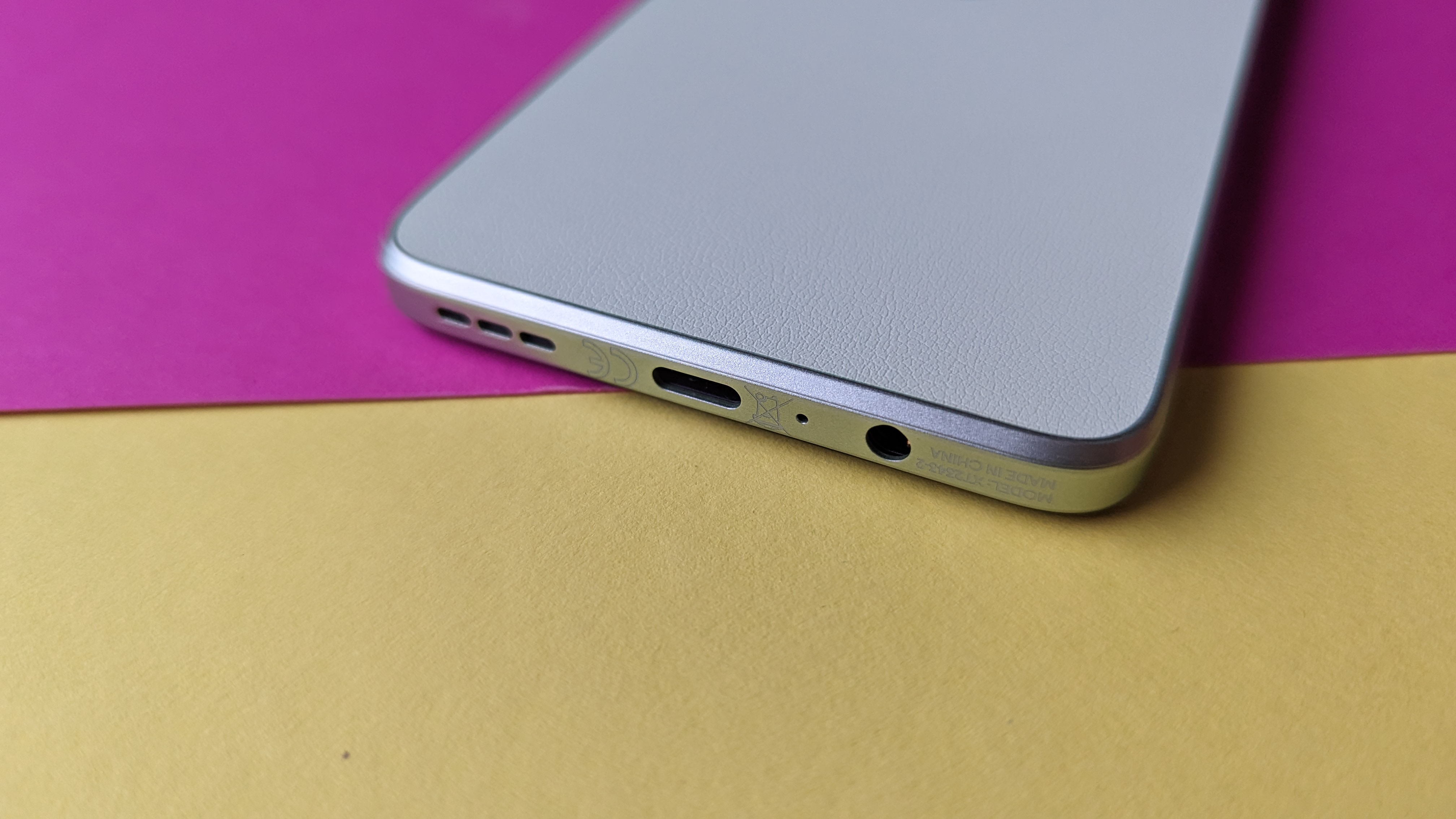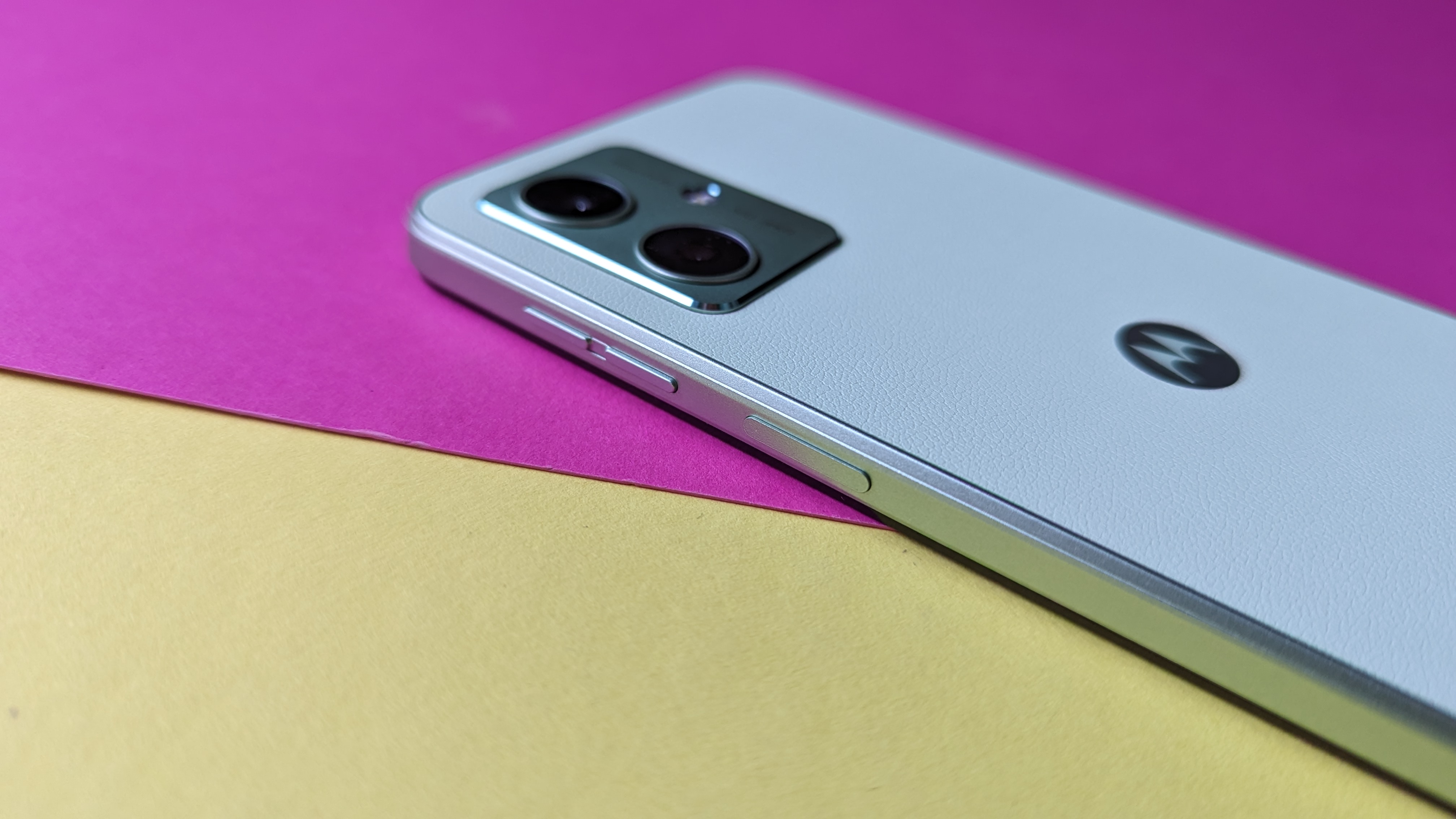 Motorola ist auf einem Kunstleder-Trip, und wir finden es grandios: Bereits beim neuen Motorola Edge 40 Neo kam als Material für die Rückseite ein griffiges, haptisch hochwertiges und angenehmes Kunstleder zum Einsatz. Auch beim Moto G54 ist es verbaut, bei unserem Testgerät in einem freundlich-fröhlichen Zitronengelb (Motorola selbst beschreibt es als Mint Green). Der matt lackierte Kunststoffrahmen ist farblich ebenfalls darauf abgestimmt, was für ein stimmiges Gesamtdesign sorgt.