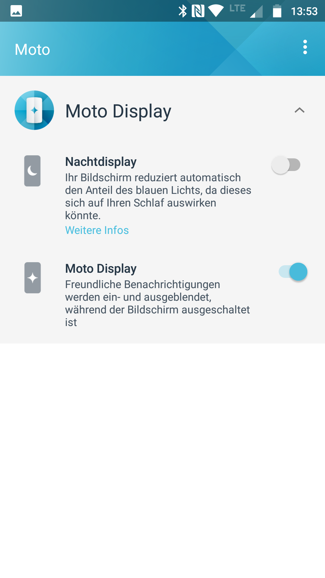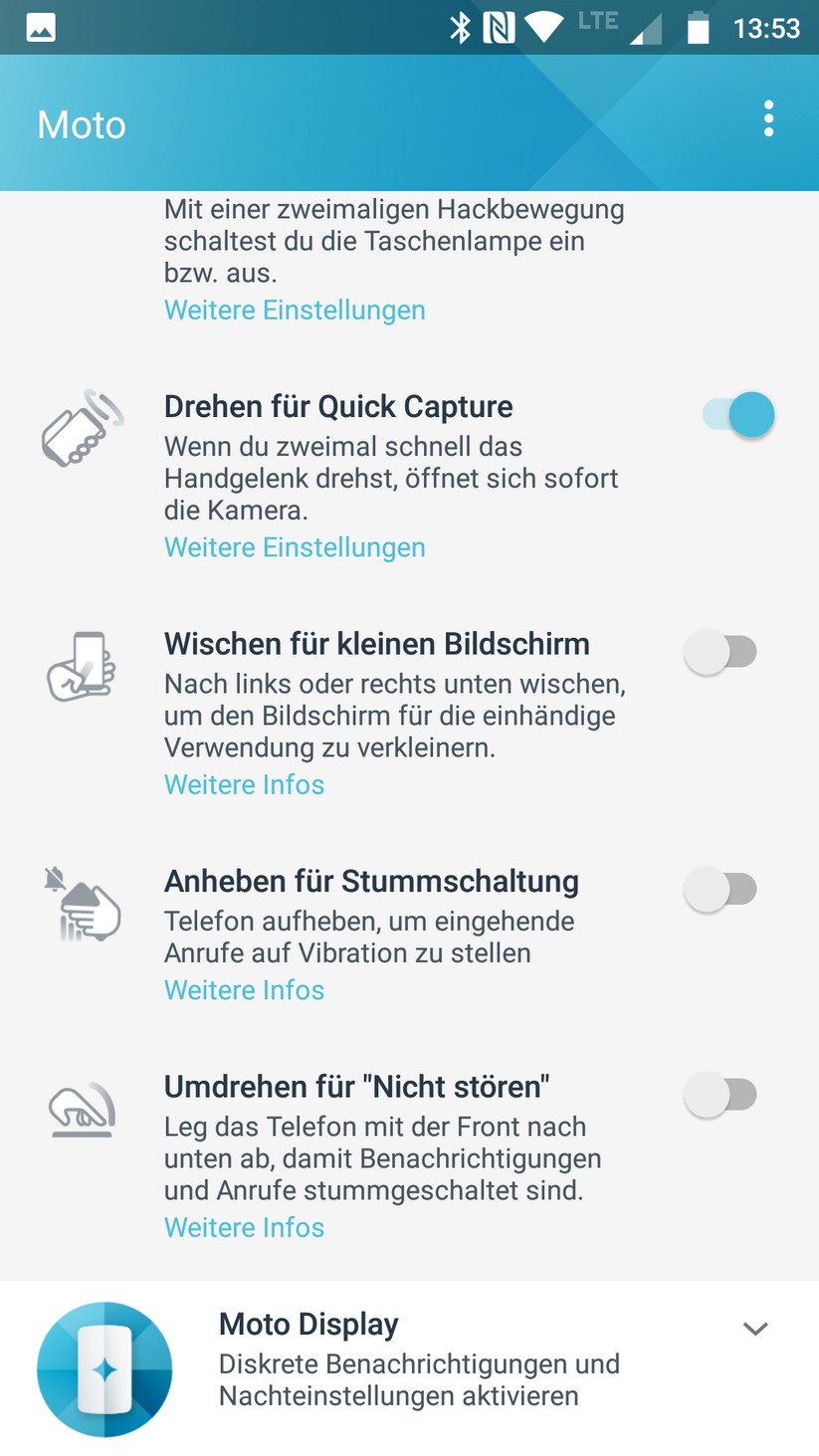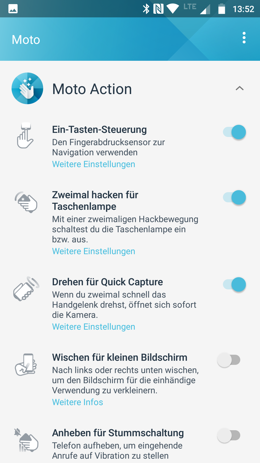 Bloatware ist erfreulicherweise keine installiert, nur eine App von Motorola, die sogar richtig Mehrwert bietet. Mit ihr lassen sich „Moto Actions“ konfigurieren, wie beispielsweise die Taschenlampe mit einer schnellen Schnickbewegung zu starten. Auch praktisch: Statt Onscreen-Buttons kann der Fingerabdruckscanner zur Navigation hergenommen werden. Die Sache nennt sich Ein-Tasten-Steuerung und funktioniert mit kurz Tippen für Home , von rechts nach links über den Sensor streichen für Zurück und von links nach rechts über den Sensor streichen zum Aufrufen der zuletzt genutzten Anwendungen. Weiterhin kann mit einem längeren Druck auf den Sensor das Gerät in den Standby geschickt oder Google Assistant gestartet werden. Hinter dem „Moto Display“ verbergen sich Optionen für das Einblenden von Benachrichtigungen bei ausgeschaltetem Display oder das Aktivieren eines Nachtdisplays mit reduziertem Anteil blauen Lichtes.