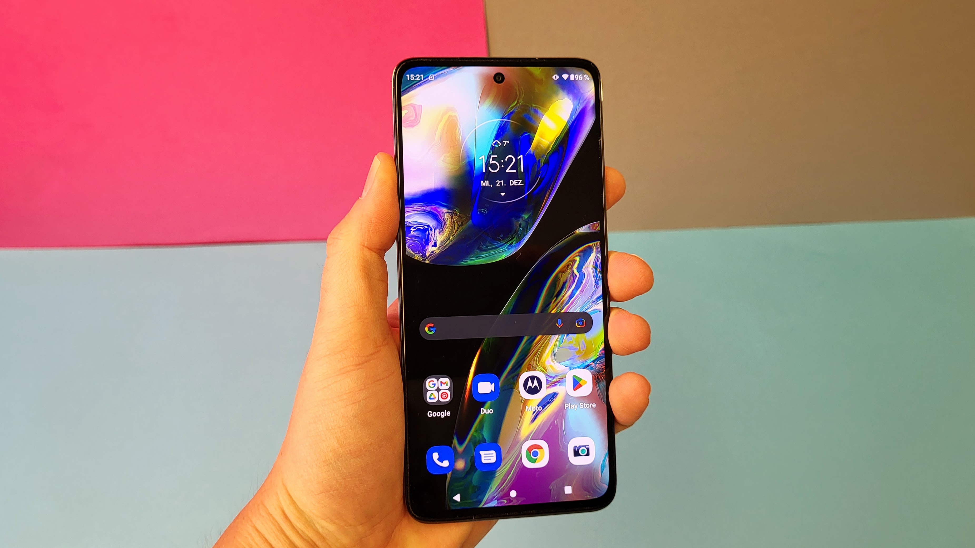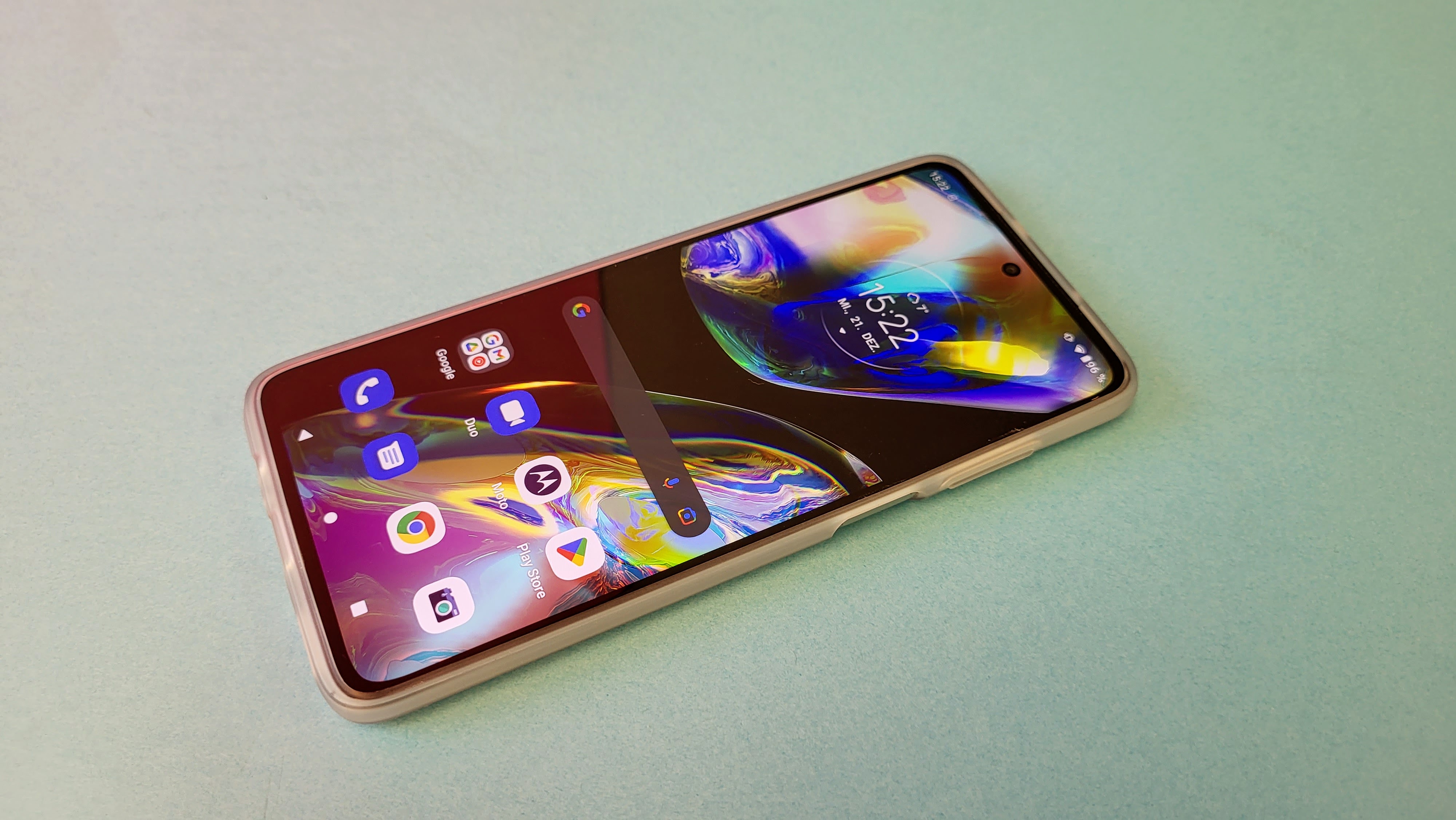 Ganz untätig ist Motorola nicht, so bietet das Gerät einige zusätzliche Gesten. Dreht man etwa zweimal schnell das Handgelenk mit dem Handy, dann startet die Kamera-App automatisch. Okay, bis diese Geste in Fleisch und Blut übergeht, braucht es Übung. Schüttelt man das Moto G82 zweimal schnell – als würde man etwas mit dem Gerät hacken – geht die Taschenlampe an. Dreht man das Smartphone um, aktiviert sich automatisch der Modus für „bitte nicht stören“. Weitere Gesten erklärt die Moto-App.