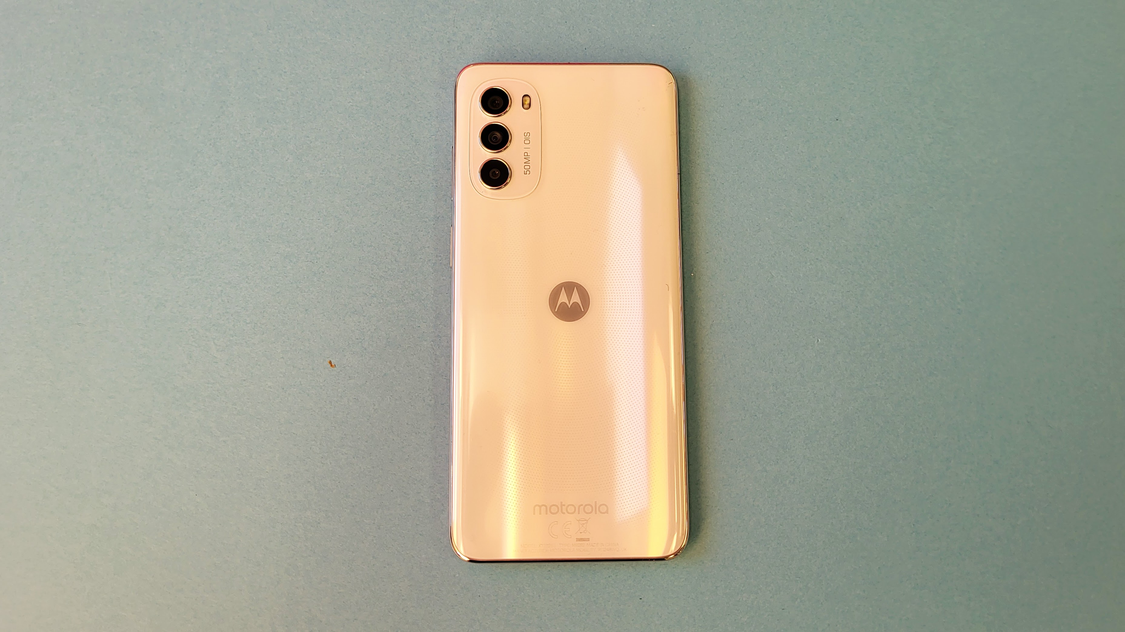 Das Moto G82 liegt gut in der Hand. Es ist angenehm flach und leicht. Das Gewicht fällt mit 173 g für die Größe von 160,9 x 74,5 x 8 mm recht niedrig aus. Ein silberner Rahmen aus Metall umschließt das Gehäuse. Unser Testgerät erstrahlt mit einer Kunststoff-Rückseite in Weiß, alternativ steht auch Schwarz zur Auswahl. Für den Preis geht die Materialwahl in Ordnung. Die Rückseite des Moto G82 sieht sehr schick aus, ist allerdings anfällig für Fingerabdrücke und ein wenig rutschig. Gut, dass Motorola eine transparente Schutzhülle beilegt. Diese empfehlen wir zu nutzen, denn das Moto G82 wirkt etwas fragil.