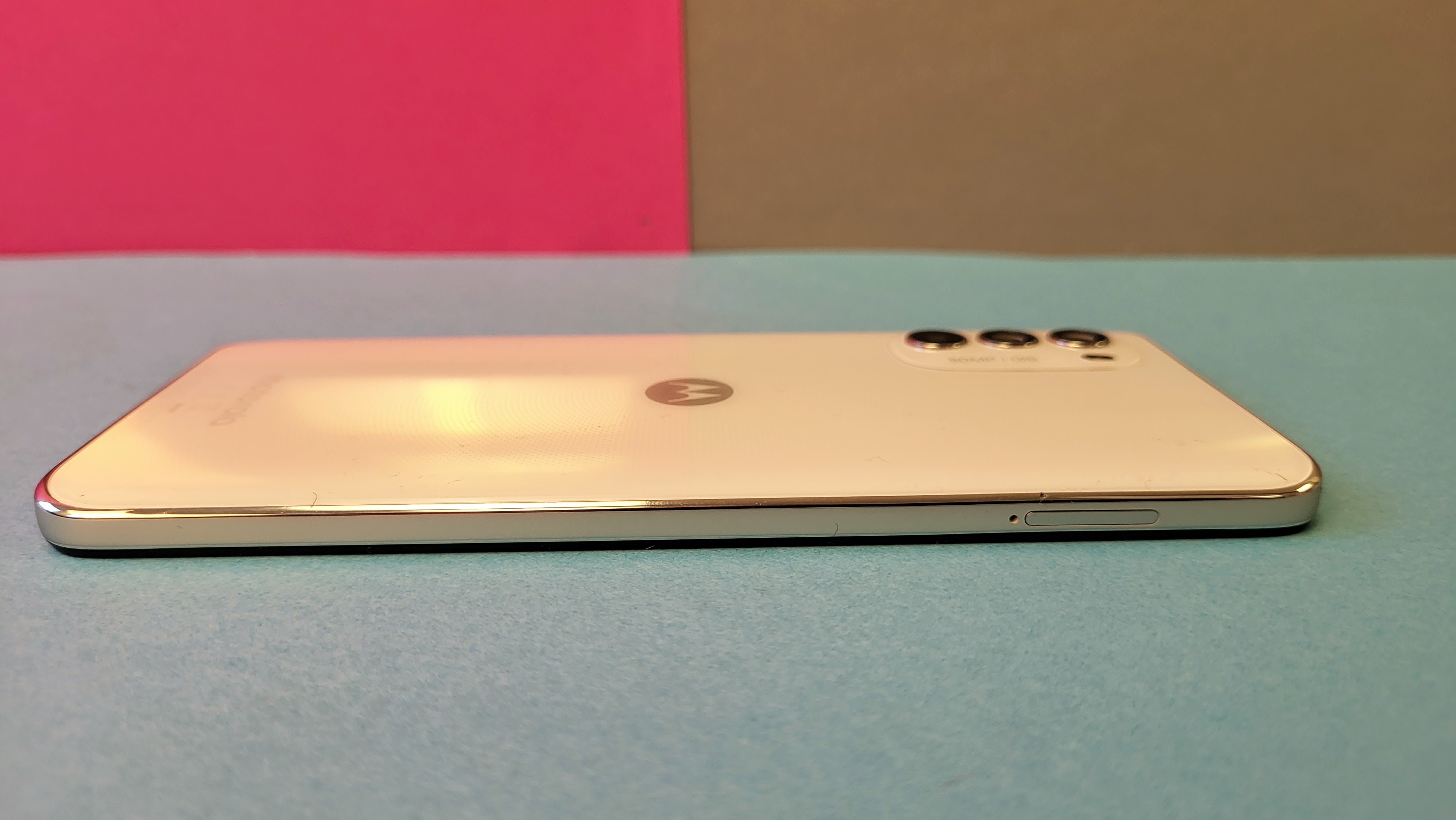 Die Verarbeitung ist tadellos, störende Spaltmaße gibt es keine. Einzig der Druckpunkt von Lautstärkewippe und Power-Button wirkt schwammiger, als wir es gewohnt sind. Der Display-Rand fällt angenehm dünn aus. Die vordere Kamera ist dezent in einer kleinen, mittig angeordneten Punch-Hole-Notch eingelassen. Wasserdicht ist das Moto G82 nicht, aber immerhin schützt die Zertifizierung nach IP52 das Handy vor schräg fallendem Tropfwasser. Einen leichten Regenschauer dürfte es also überstehen. In gewissem Umfang ist es damit auch gegen Staub geschützt.