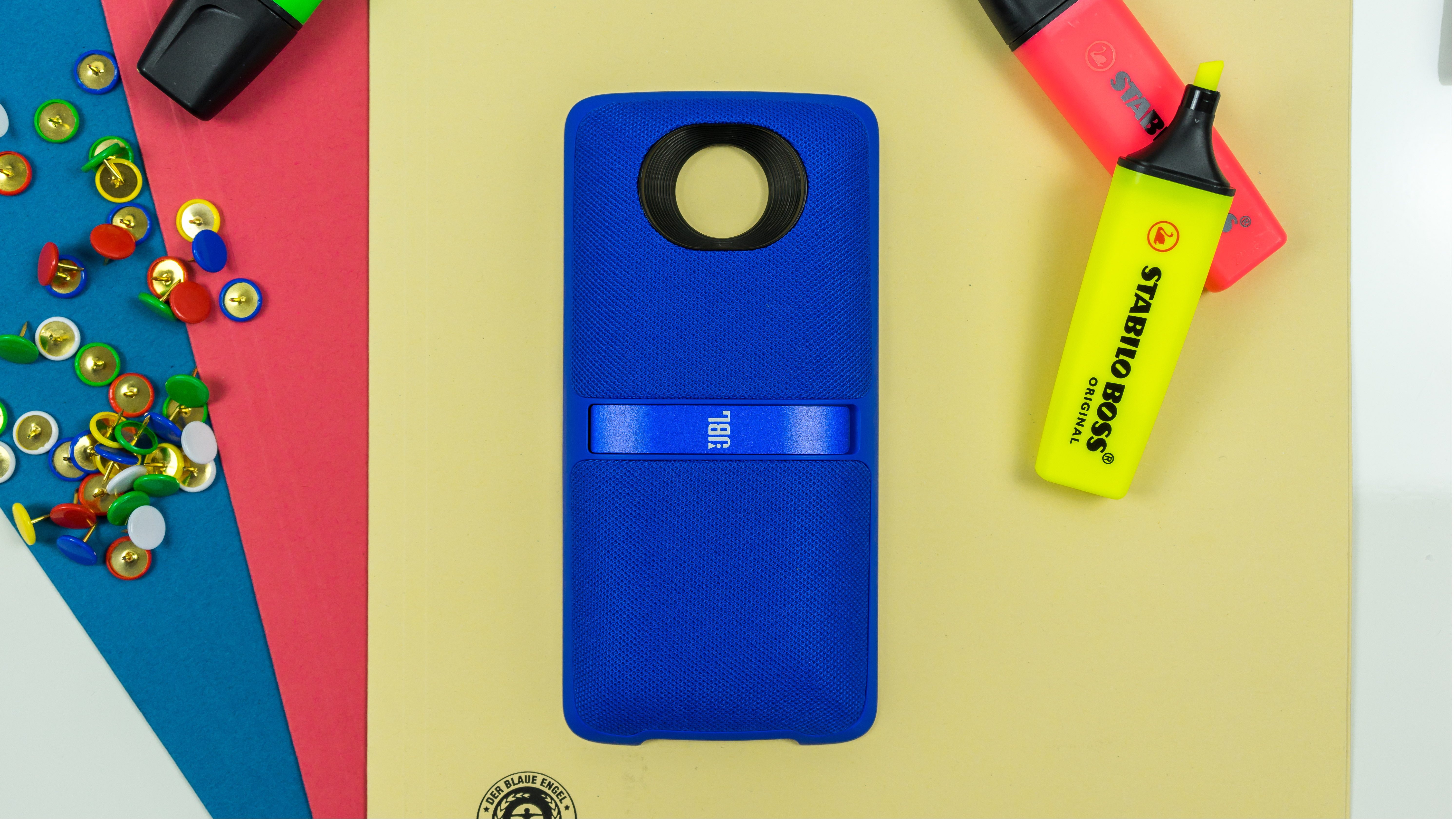 Kopfhörer sind im Lieferumfang nicht enthalten, dafür aber ein fetter Moto-Mod-Lautsprecher im Wert von 99 Euro zum Dranheften. Lenovo legt den 135 Gramm schweren SoundBoost 2 von JBL bei. Obwohl unser Testgerät ein blaues Gehäuse hat, wird der Kunde am Ende mit einer schwarzen Ausführung beliefert. Neben dem Lautsprecher besitzt der SoundBoost 2 auch einen integrierten Akku mit 1000 mAh, aufgeladen wird dieser ebenfalls über USB Type C. Die Leistung gleicht mit 6 Watt dem Vorgänger, der Klang ist besser geworden. Das liegt vermutlich an Verarbeitung: Die Membran wird nicht mehr von einem starren Metallgitter geschützt, sondern ist mit einem flexiblen Textil überzogen.