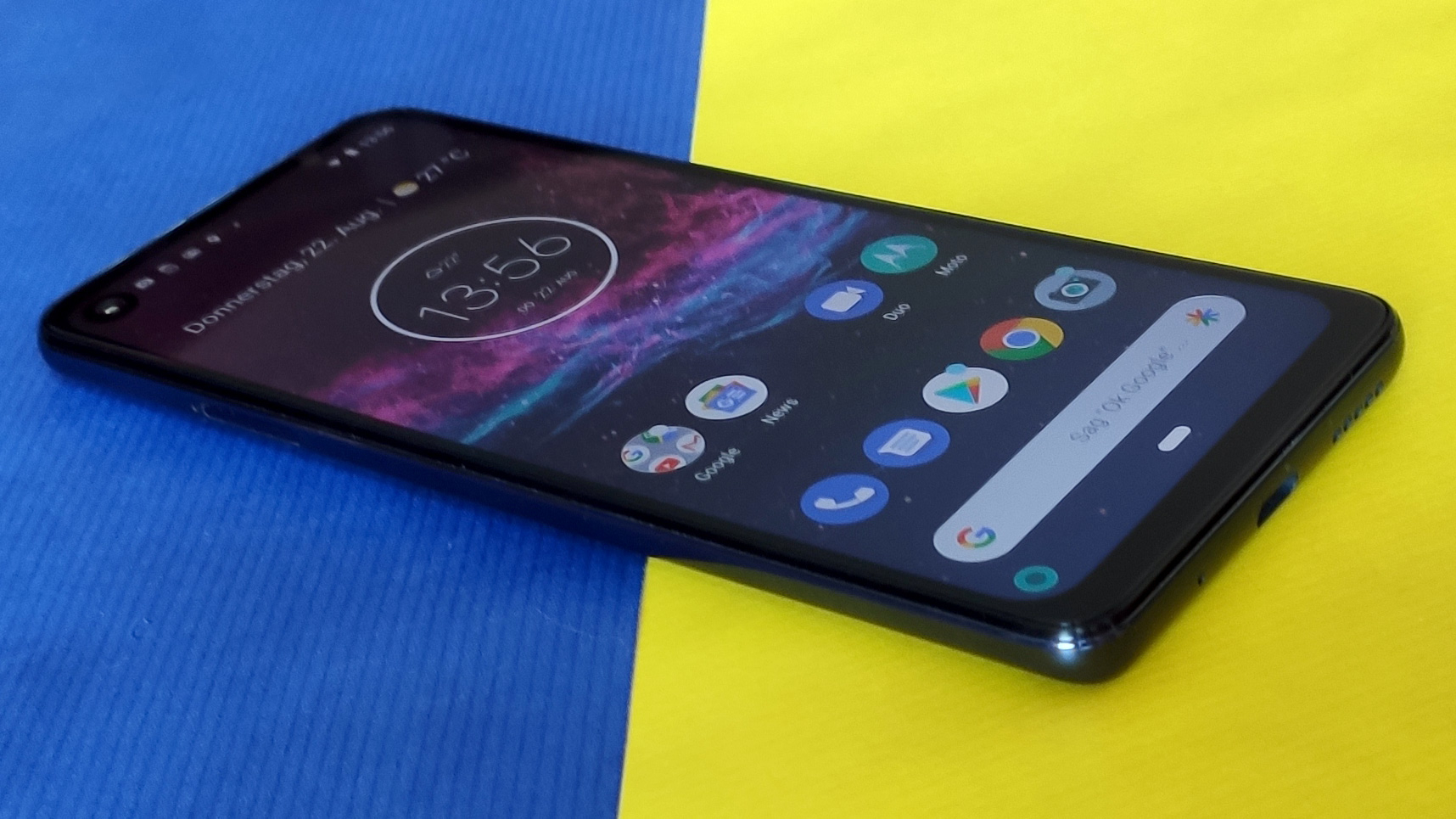 Motorola baut in das neue One Action das gleiche Display wie im One Vision ein. Highlight ist wie bereits angedeutet das langgestreckte 21:9-Format, das bei Kinofilmen theoretisch optimal ist und auch beim Surfen durch die Weiten des Internets im Hochformat Vorteile bietet. Es ist schlicht mehr Inhalt zu sehen als bei Smartphones im 16:9- oder 18:9-Format. Die Display-Auflösung liegt bei 2560 × 1080 Pixel, die sich auf stolze 6,3 Zoll verteilen. Damit liegt die Bildschärfe bei sehr guten 440 Pixel pro Zoll (PPI). An die Farbbrillanz und den Schwarzwert von OLED-Screens kommt das IPS-LCD des One Action nicht heran, dennoch überzeugt der Screen mit ausreichend intensiven Farben und guten Kontrasten. Die Helligkeit reicht aus, um auch im Freien noch Inhalte ablesen zu können. Positiv wirkt sich dabei auch die gute Blickwinkelstabilität aus.