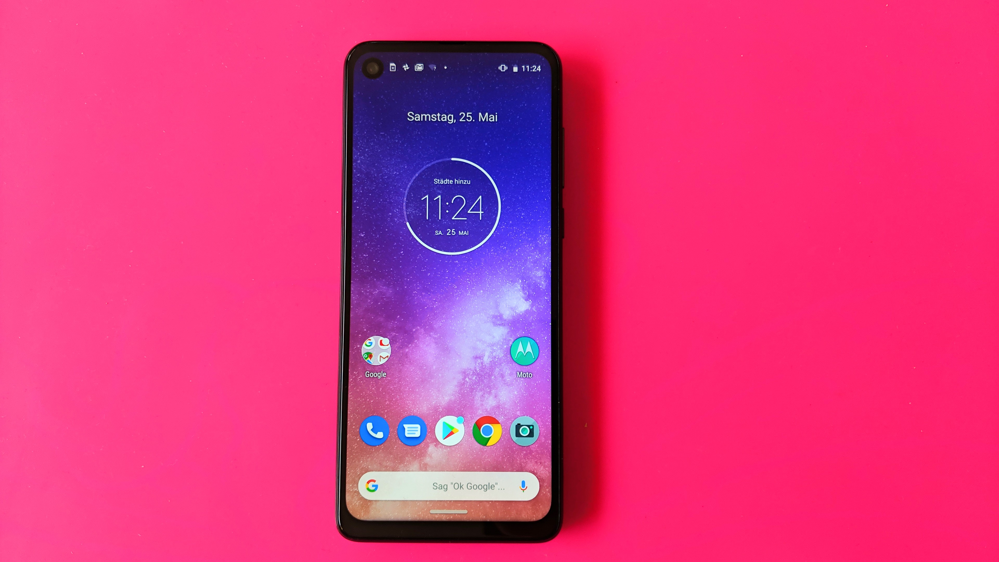 Womit Käufer des Motorola One Vision beim 6,3-Zoll-Display jedoch leben müssen, ist die Punch-Hole-Notch oben links. Dabei wurde pixelgenau ein Loch in das Display geschnitten, in dem sich die Frontkamera versteckt. Dieses Loch wirkt etwas größer als sonst üblich, stört aber bei der täglichen Nutzung schnell nicht mehr. Rechts neben der Punch-Hole-Notch zeigen Symbole Benachrichtigungen an, noch weiter rechts findet man die Android-typischen Symbole für den Akkuladestand, Uhrzeit und so weiter.