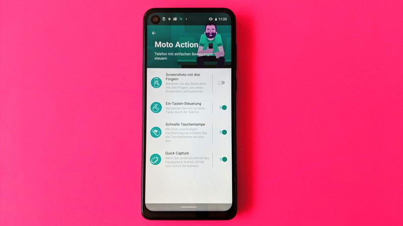 Motorola hat das Android auf den One Vision angenehm schlank gehalten. Doppelte Apps gibt es keine. Trotzdem finden sich Motorola-typische Funktionen wieder: Schnelles Drehen um die Achse öffnet die Kamera-App, eine schnelle Hackbewegung öffnet die Taschenlampen-App.