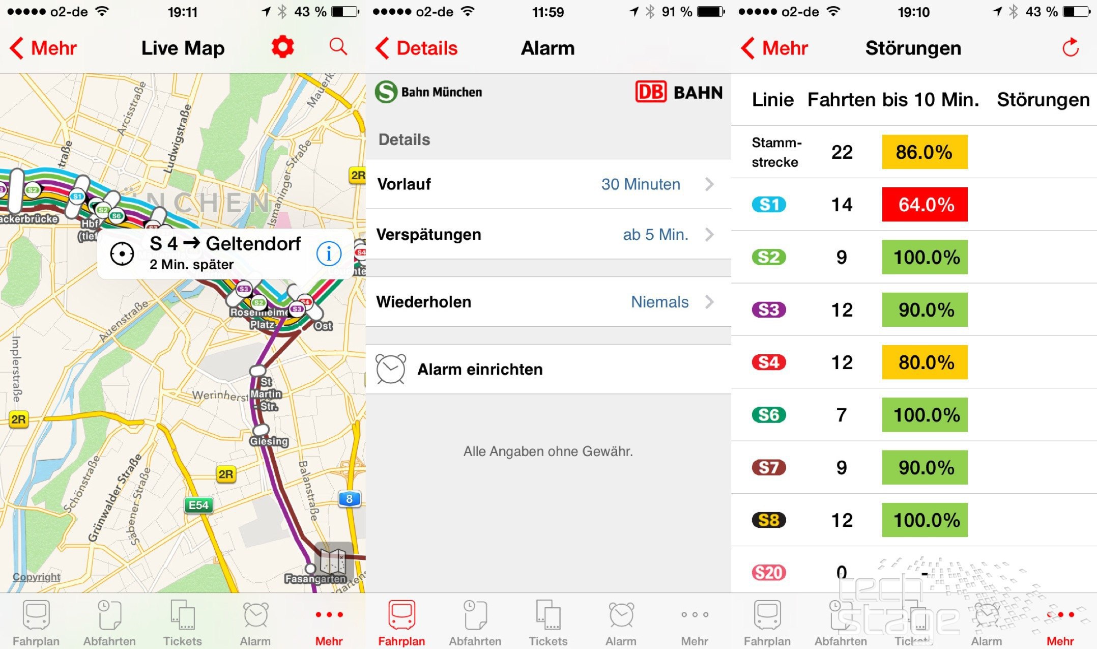 Auch die App der S-Bahn München ist für Android und iOS zu haben. Sie verfügt über die gleichen Fahrplan- und Abfahrten-Menüs wie die anderen beiden Programme, allerdings mit einem praktischen Extra: Wer seine typischen Verbindungen abfragt – etwa den Weg zur Schule oder ins Büro –, kann einen Alarm aktivieren. Dann meldet sich die App rechtzeitig vorher, wenn die gewünsche Verbindung eine Verspätung hat. Bei der S-Bahn dürfte das zuverlässig klappen. Eine Verspätungsmeldung der Buslinie 54, die in der MVG-Anwendung auftaucht, hat es allerdings nicht in die S-Bahn-App geschafft – daher wären wir bei anderen Verkehrsmitteln als der S-Bahn vorsichtig.