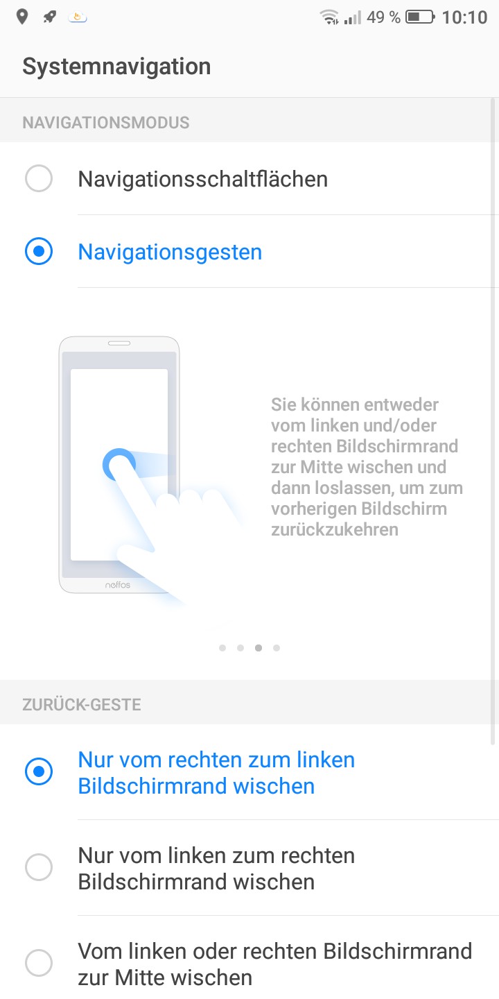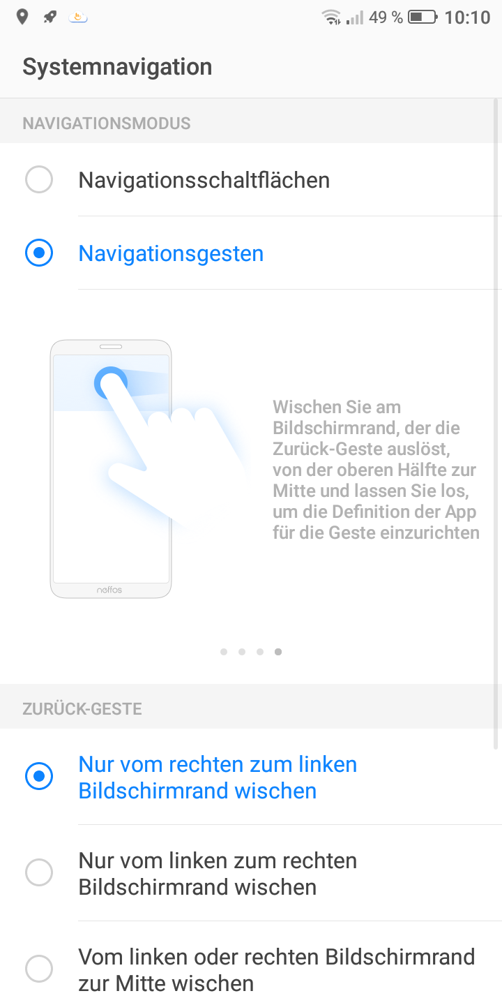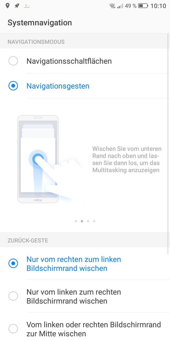 Auf dem Neffos C9A läuft Android in zum Testzeitpunkt recht aktueller Version 8.1.0 mit Google-Sicherheitspatch vom 05. Mai zum Testzeitraum. Der Hersteller nimmt optisch einige Änderungen am Google-Betriebssystem vor, implementiert einige Zusatzfeatures in die Systemeinstellungen und gibt der Software den Namen NFUI. Die softwareseitigen Änderungen beschränken sich auf die Optionen Gesten und intelligente Unterstützung und Systemnavigation . Unter Gesten und intelligente Unterstützung finden sich unter anderem Optionen wie die Möglichkeit, das Display mit einem Doppeltipp einzuschalten, oder Apps und Systemfunktionen durch das Zeichen von Buchstaben auf den Bildschirm zu starten. Das Optionsmenü Systemnavigation erlaubt das Tauschen der Navigationsschaltflächen und bietet alternativ Navigationsgesten, die die On-Screen-Buttons ersetzen.