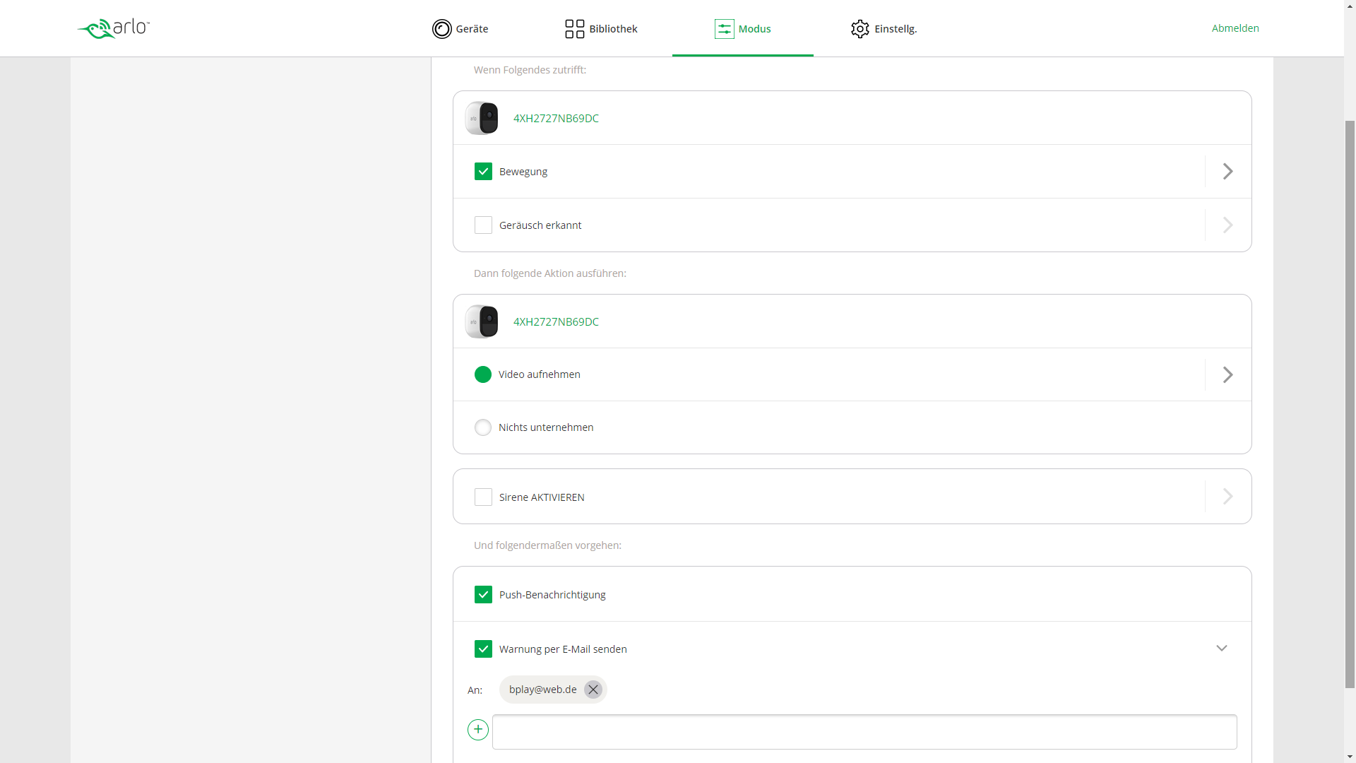 Nicht nur durch die spezielle Basisstation unterscheidet sich die Arlo Pro von der Konkurrenz, sie bietet bis ins Kleinste konfigurierbare Modi in beliebiger Anzahl, um für jede Situation das richtige Setting erstellen zu können. Dies beinhaltet nicht nur Zeitpläne und Verwaltung per Standort des Handys – es lässt sich auch festlegen, ob nur Bewegung oder nur Geräusch, oder aber beides erkannt werden soll. Außerdem welche Aktionen dann zum Tragen kommen (Video aufnehmen, nichts unternehmen, Sirene aktivieren) und welche Art der Benachrichtigung erfolgen soll.