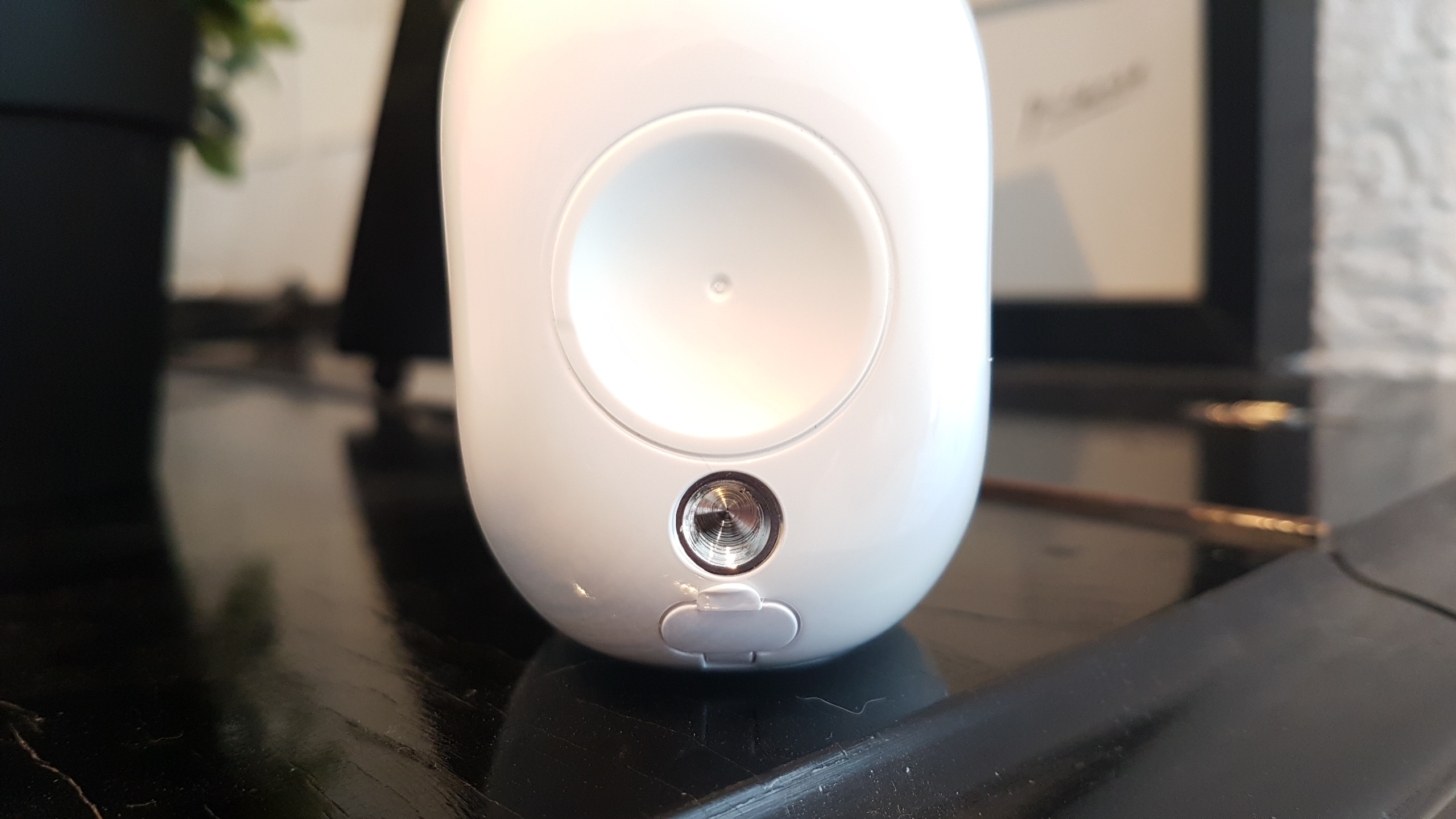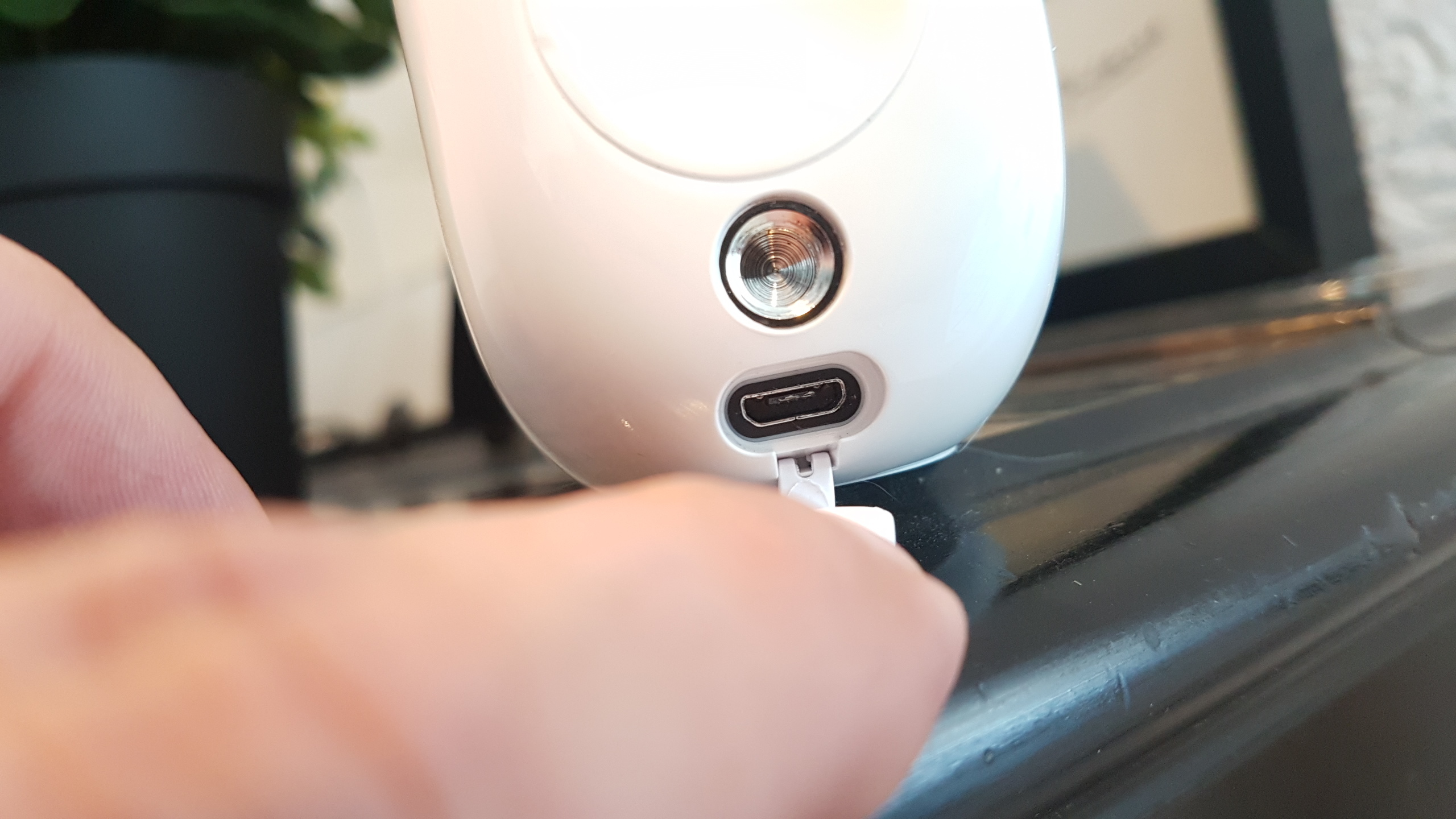 Zum Einsetzen des Akkus wird die Kamera einfach aufgeklappt, zum Aufladen gibt es hinten unten einen microUSB-Anschluss. Auf der Oberseite ist ein Sync-Taster zum Verbinden mit einer Basisstation. Diese stellt die Verbindung zum Internet her und sorgt für die Kommunikation zwischen Nutzer und Kamera oder aber Kameras, wenn mehrere Geräte im System laufen.