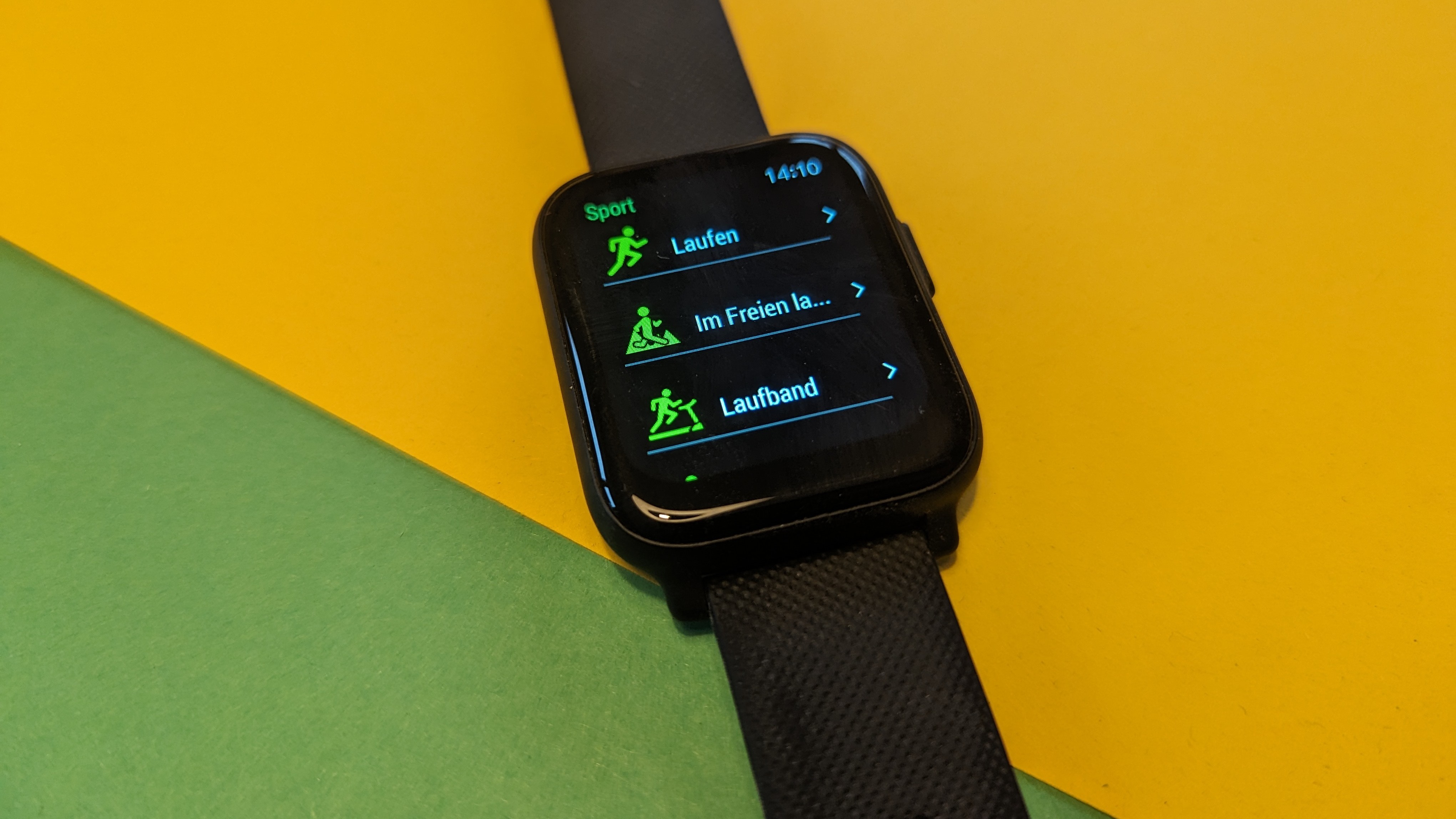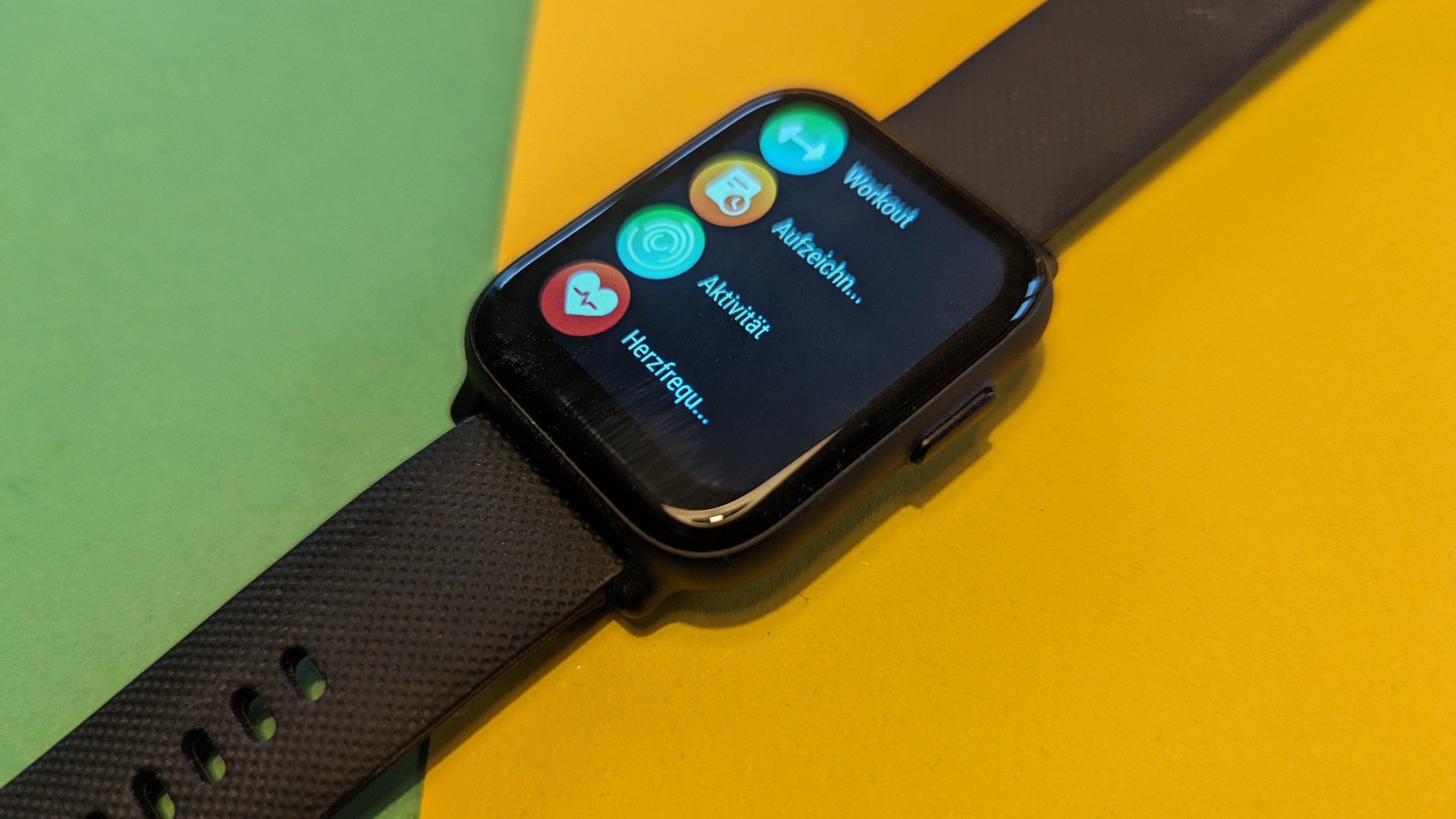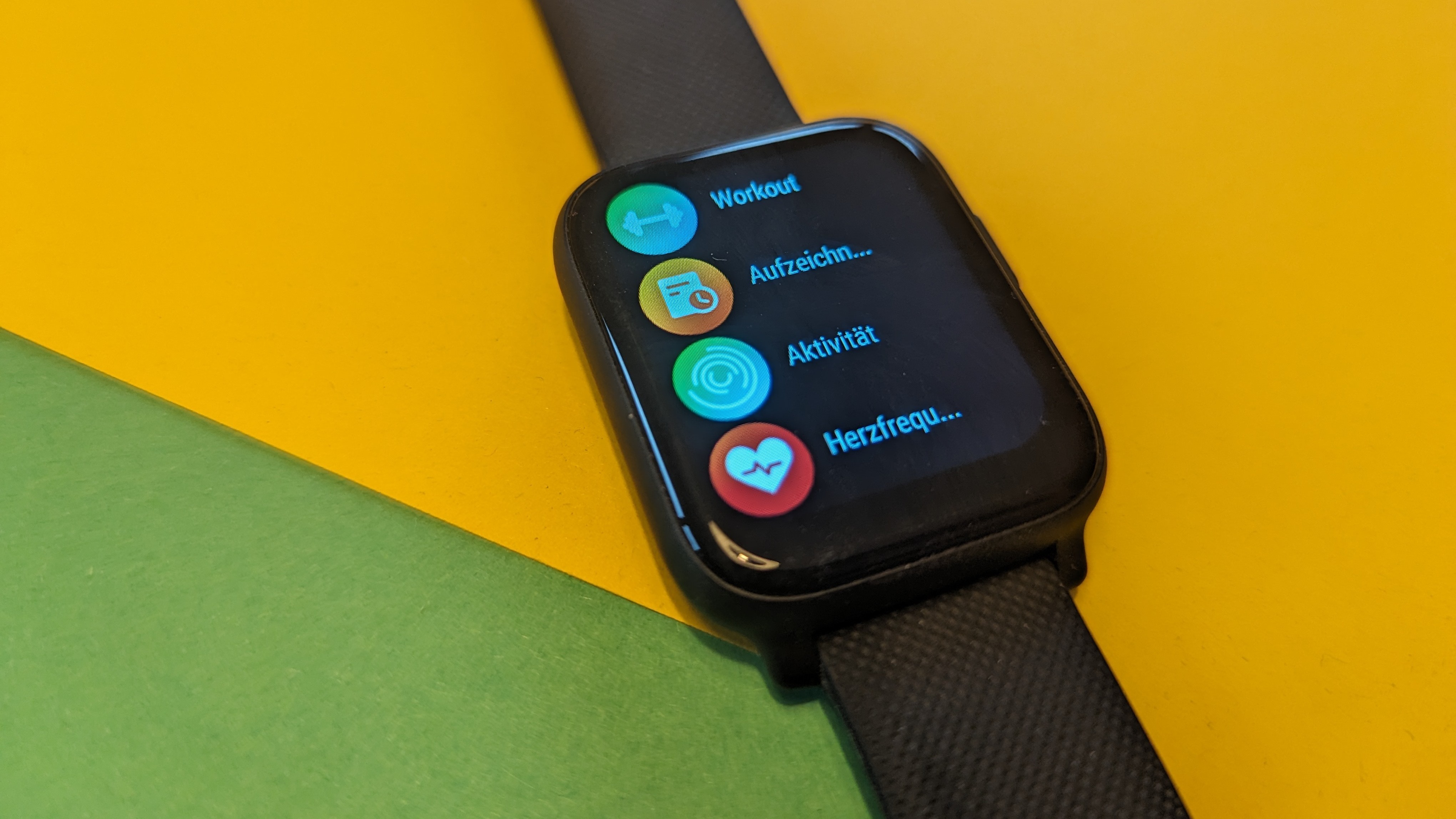 Dafür ist der Rest der App aber immerhin recht logisch und übersichtlich aufgebaut. Neben der Hauptübersicht gibt es ein Menü, über das wir Trainingseinheiten starten, sowie eine mit der seltsamen Überschrift „Fitness-Rekord“ versehene Kachelansicht, über die wir uns Gesundheits- und Fitnessdaten sehen. Zu guter Letzt gibt es ein Einstellungsmenü, über das wir unter anderem die Benachrichtigungen konfigurieren oder die Zifferblätter ändern.