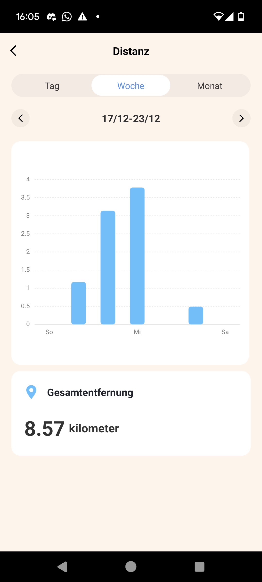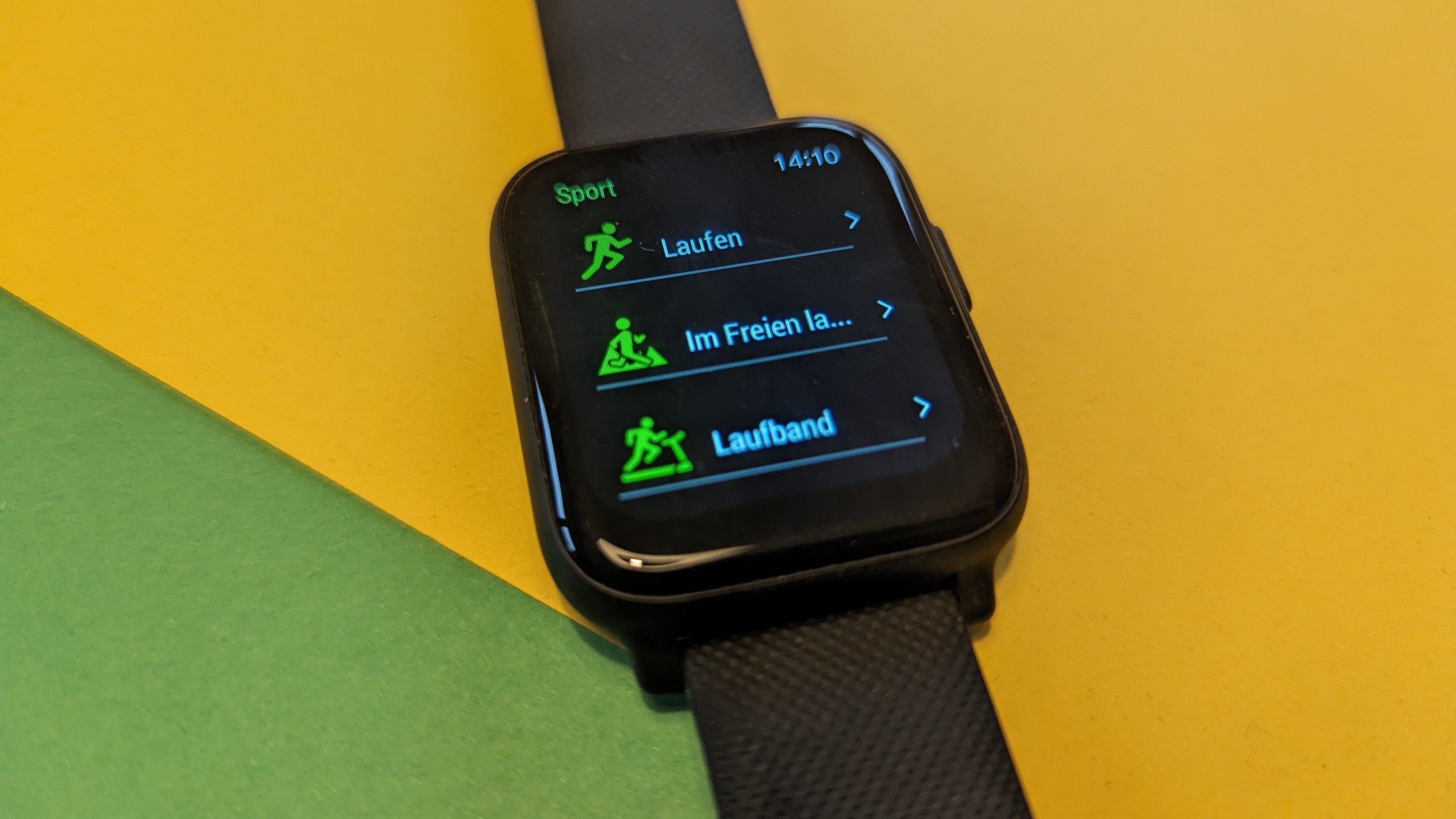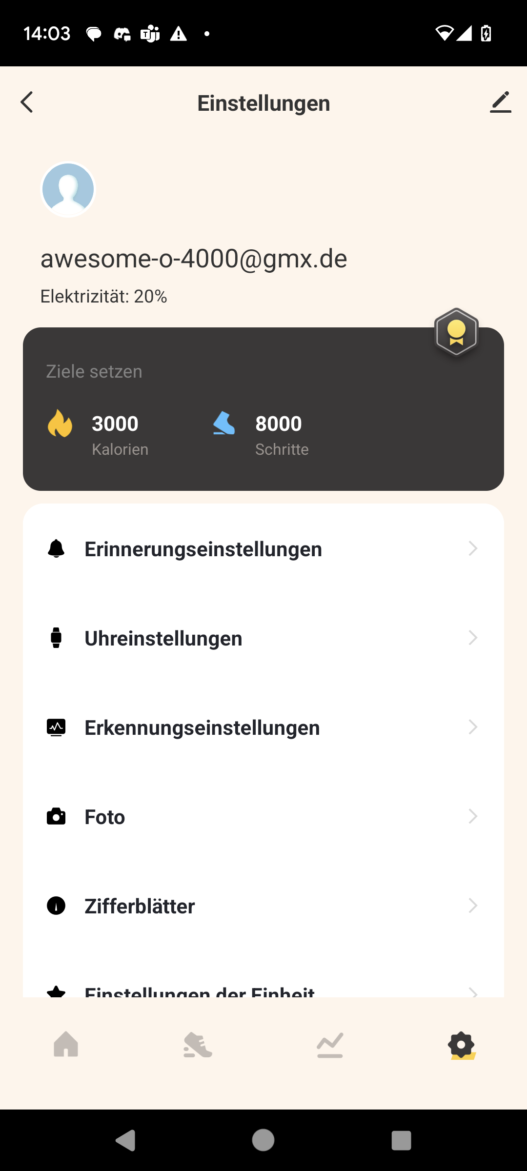 Dafür ist der Rest der App aber immerhin recht logisch und übersichtlich aufgebaut. Neben der Hauptübersicht gibt es ein Menü, über das wir Trainingseinheiten starten, sowie eine mit der seltsamen Überschrift „Fitness-Rekord“ versehene Kachelansicht, über die wir uns Gesundheits- und Fitnessdaten sehen. Zu guter Letzt gibt es ein Einstellungsmenü, über das wir unter anderem die Benachrichtigungen konfigurieren oder die Zifferblätter ändern.