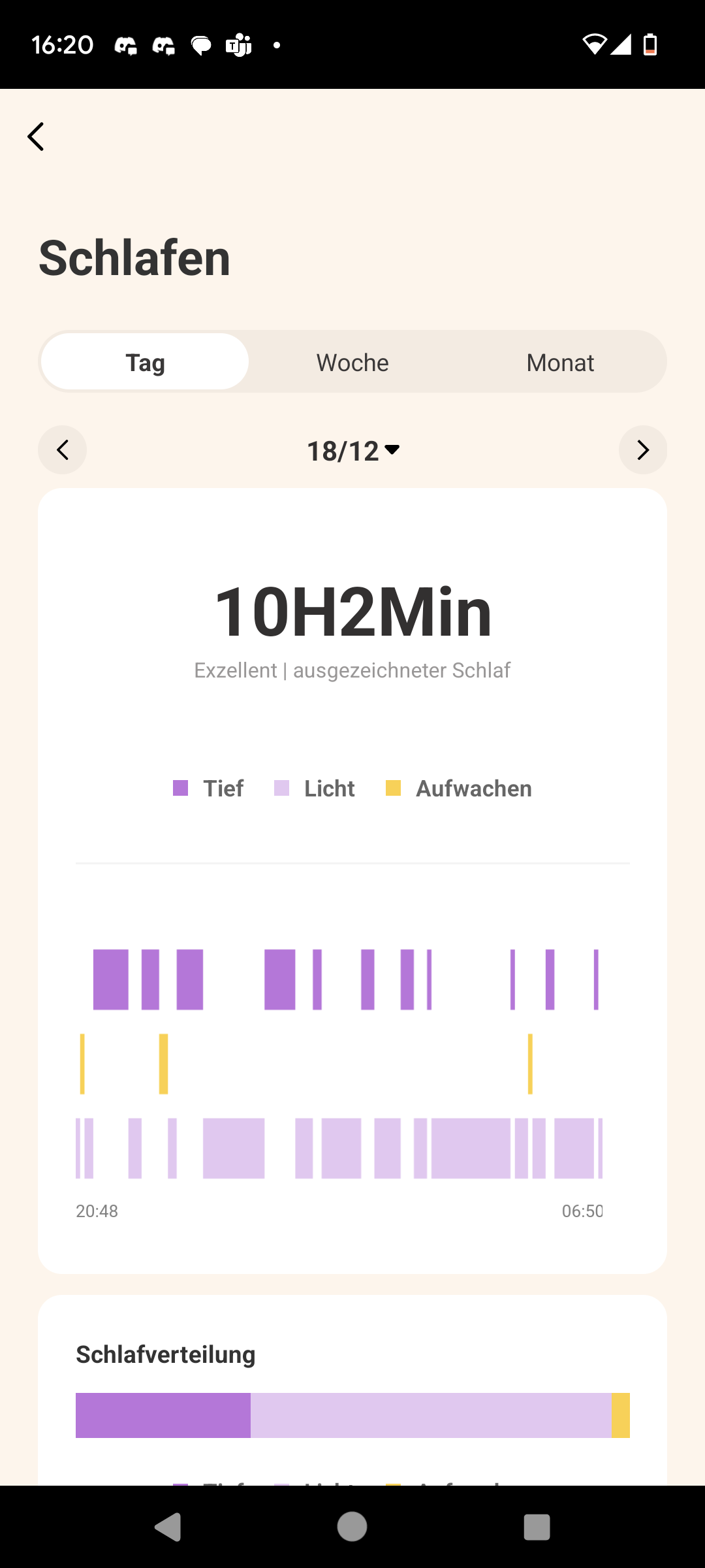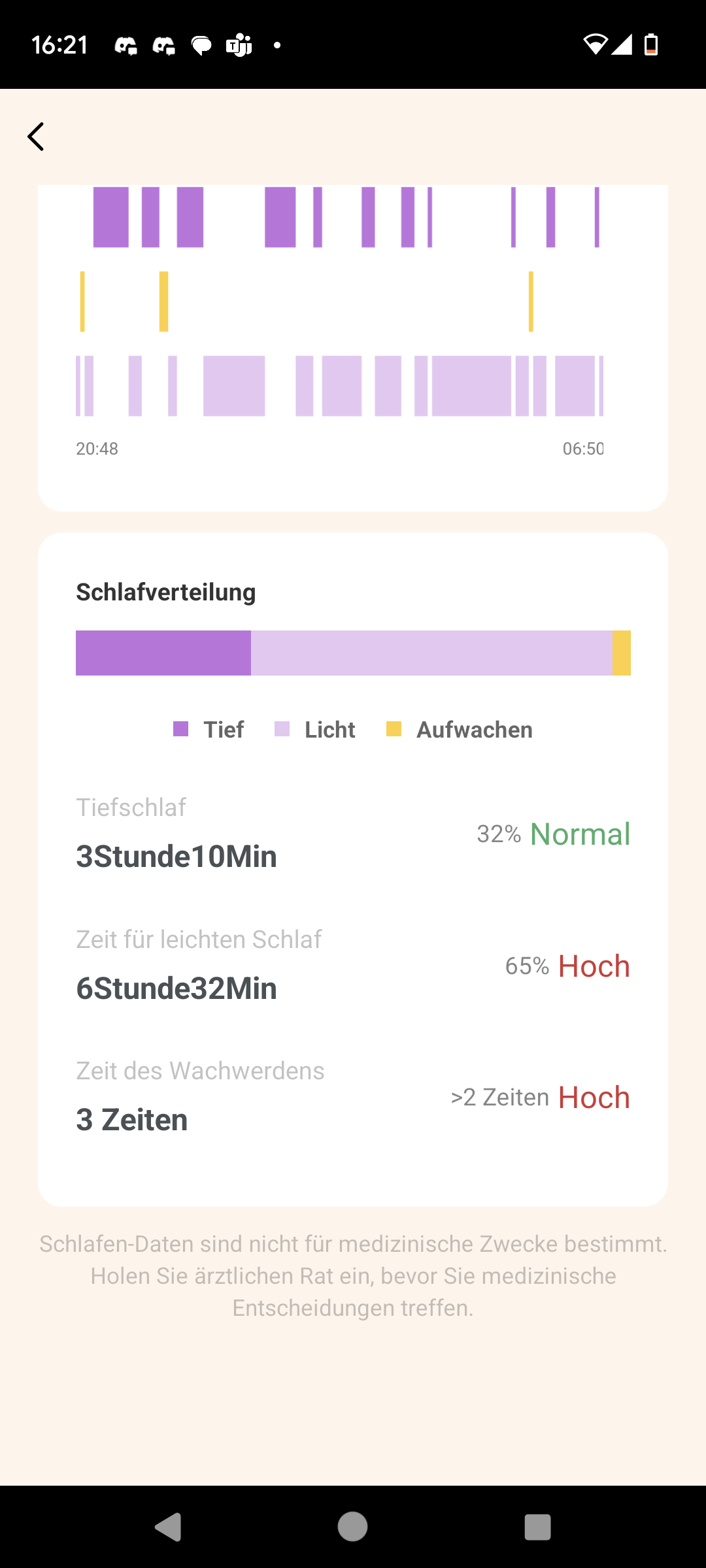 Beim Schlaf-Tracking erwarten Nutzer grundlegende Funktionen wie die Aufzeichnung der einzelnen Schlaf- und Wachphasen, des Einschlaf- und Aufwachzeitpunktes sowie eine grundlegende Bewertung der Schlafqualität. Anhand welcher Kriterien die Schlafqualität genau bestimmt wird, erfahren wir allerdings nicht. Auch sonst bleibt die Schlafanalyse recht rudimentär. Wir bekommen die Dauer unseres Tiefschlafs und leichten Schlafs angezeigt, REM-Phasen werden nicht berücksichtigt. Atmung oder Herzfrequenz fehlen ebenfalls.