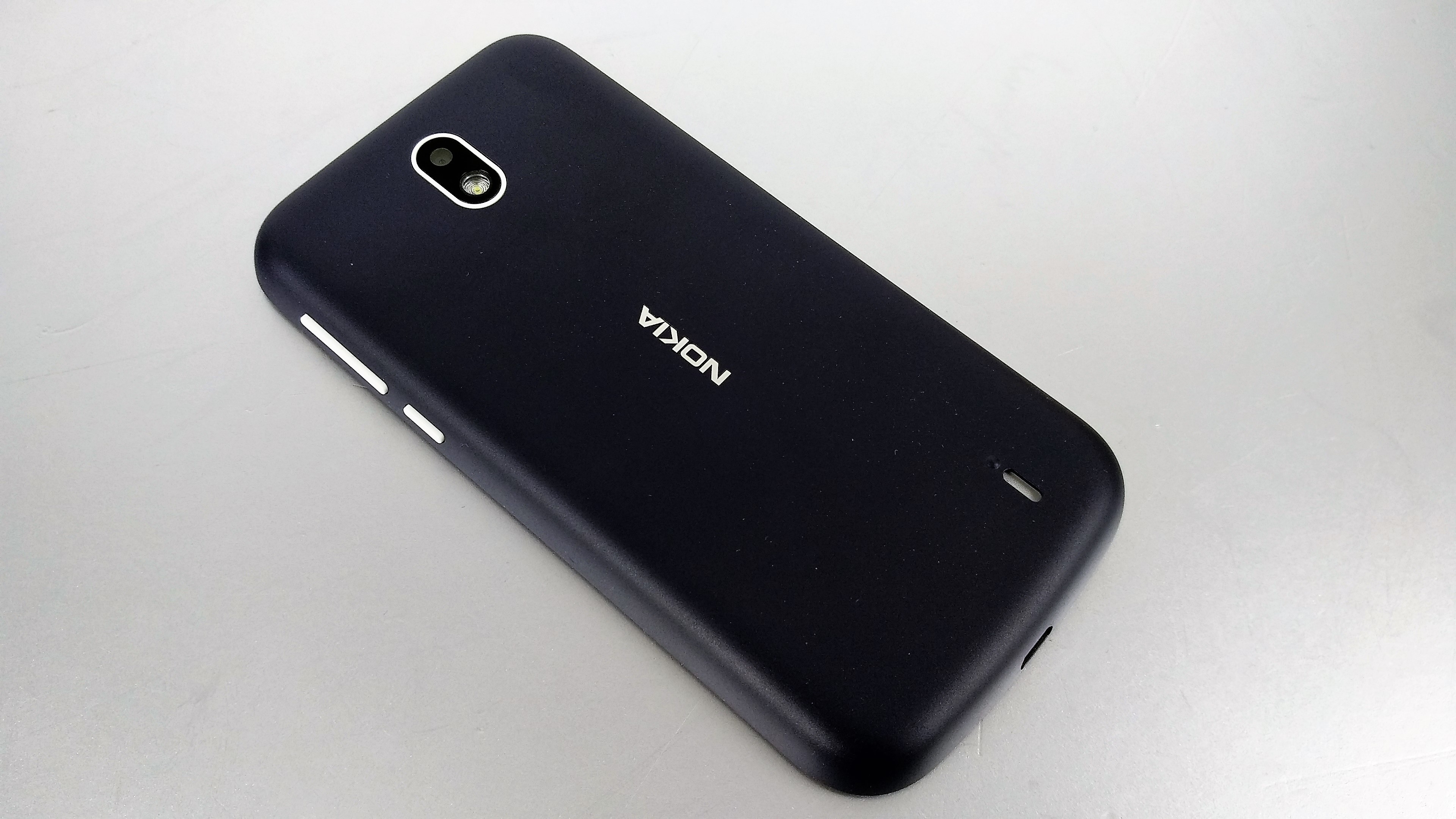 Rein optisch ist das Nokia 1 ein schickes Handy. Rund um das Display zieht sich ebenso wie um die Kamera mit LED-Blitz auf der Rückseite ein schmaler, weißer Rahmen. Power-Button und Lautstärkewippe unseres blauen Test-Gerätes sind ebenfalls weiß und stechen wie die Kamera optisch heraus. Auf der Rückseite ist mittig das Nokia-Logo, in der unteren rechten Ecke der Lautsprecher angebracht.