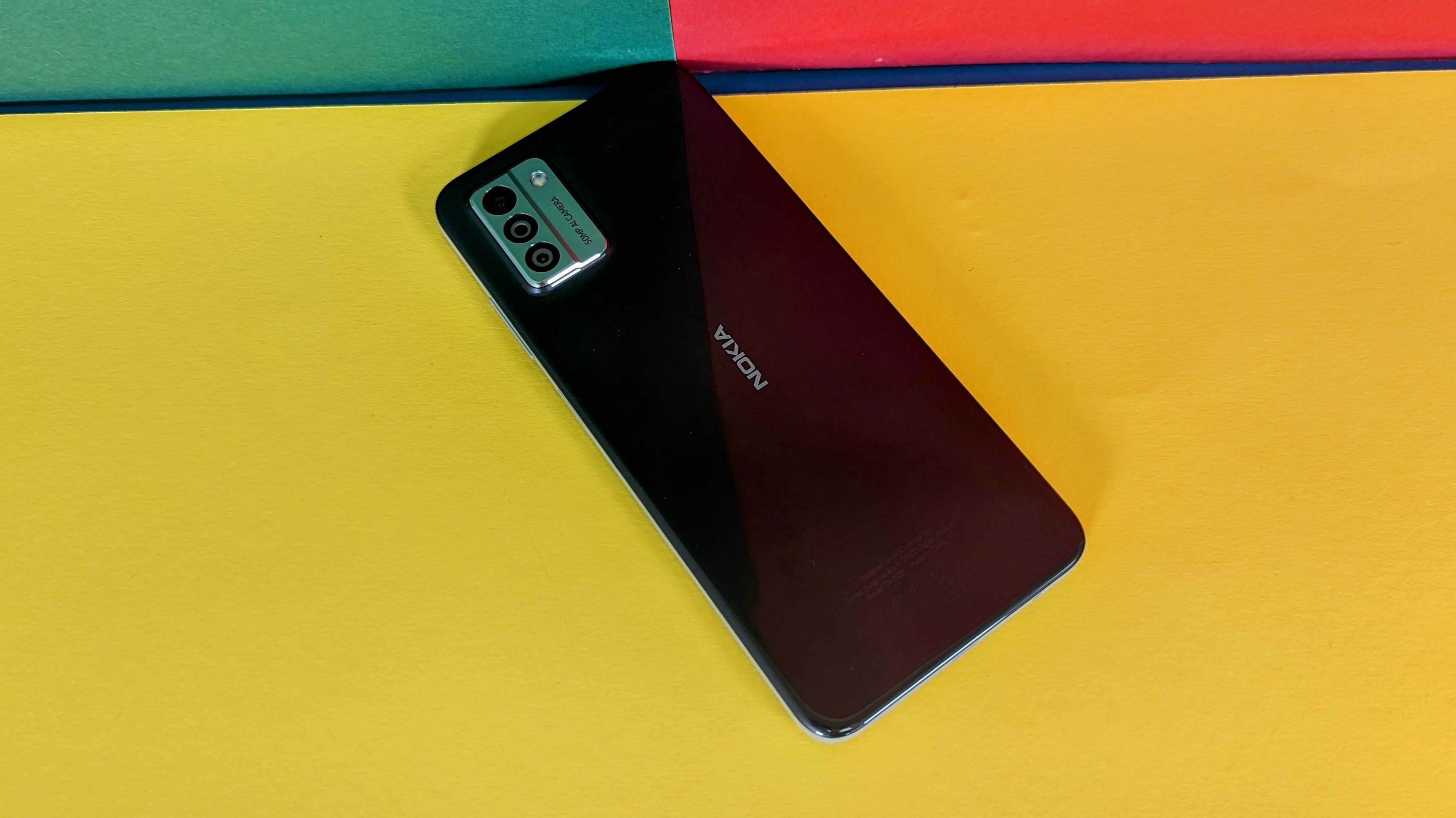 Das Kameramodul oben links ist grau und die drei Kameralinsen sind leicht erhöht positioniert. Daneben findet sich noch eine LED-Leuchte und der Schriftzug „50MP AI Camera“, der direkt schon ein wenig über die Kameraausstattung preisgibt. Das Modul ähnelt in seiner Aufteilung dem Vorgänger Nokia G21 (Testbericht), ist aber jetzt weniger abgerundet. Auch damals waren die Linsen noch etwas abgesetzt. Dadurch wackelt das Handy auf dem Tisch beim Tippen etwas – wenn man keine Hülle nutzt.
