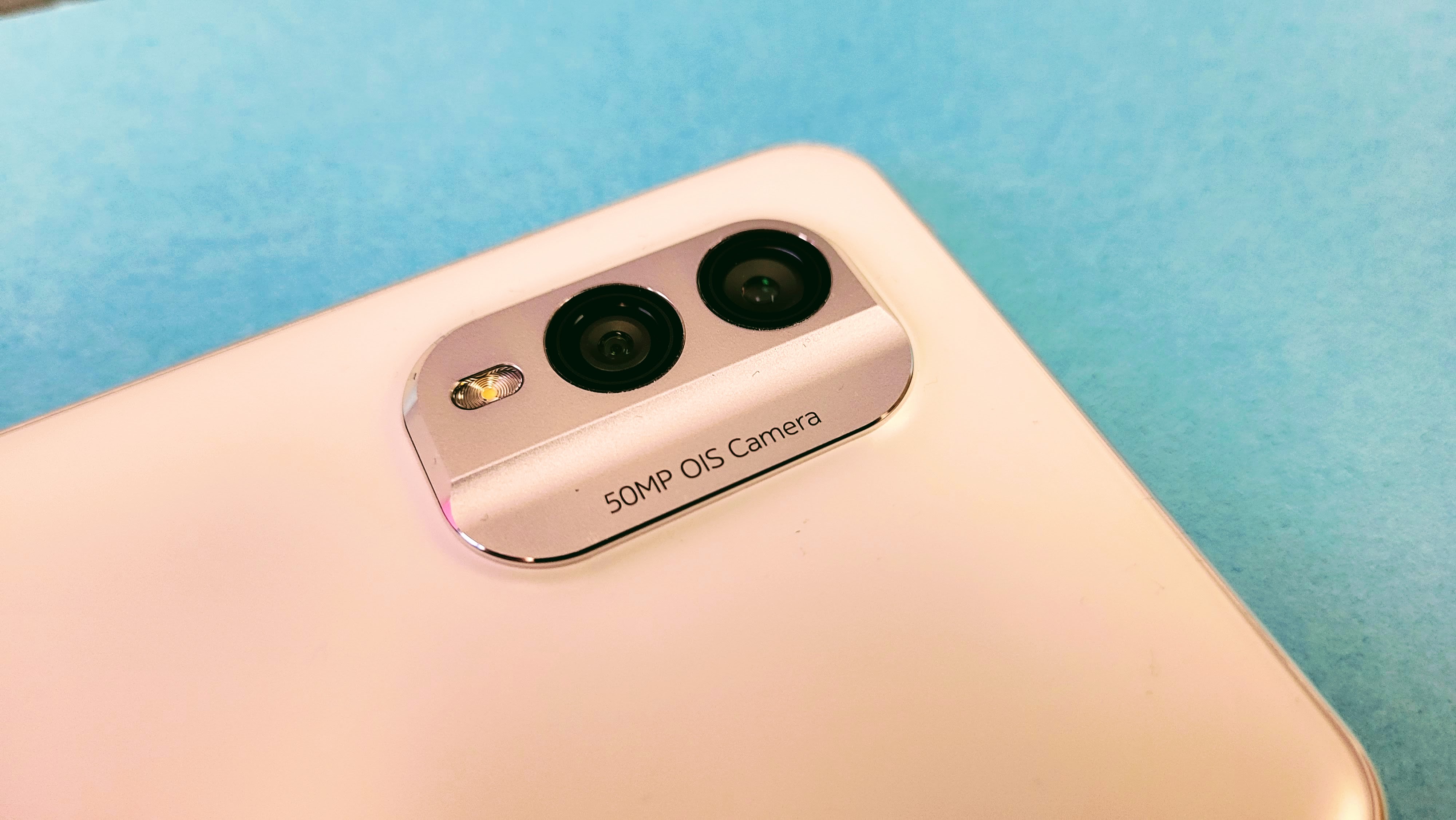 Sehr spannend ist der Wechsel aus kantigen Formen und rundlichen, organischen Elementen. So ist die Rückseite leicht gewölbt, während die Kanten mit dem Metallrahmen rechteckig abschließen. Sehr ansprechend sieht zudem die Kamera auf der Rückseite aus. Diese ist in einem ovalen Element aus Metall eingefasst, das etwa 3 mm herausragt. Dadurch kippelt das Handy ein wenig, wenn es auf der Rückseite liegt – vielleicht der einzige Störfaktor des Designs. LED-Blitz und die beiden Linsen sind in einer Linie angeordnet, unterhalb davon befindet sich eine stark abgerundete Einkerbung mit dem Schriftzug „50 MP OIS Camera“.