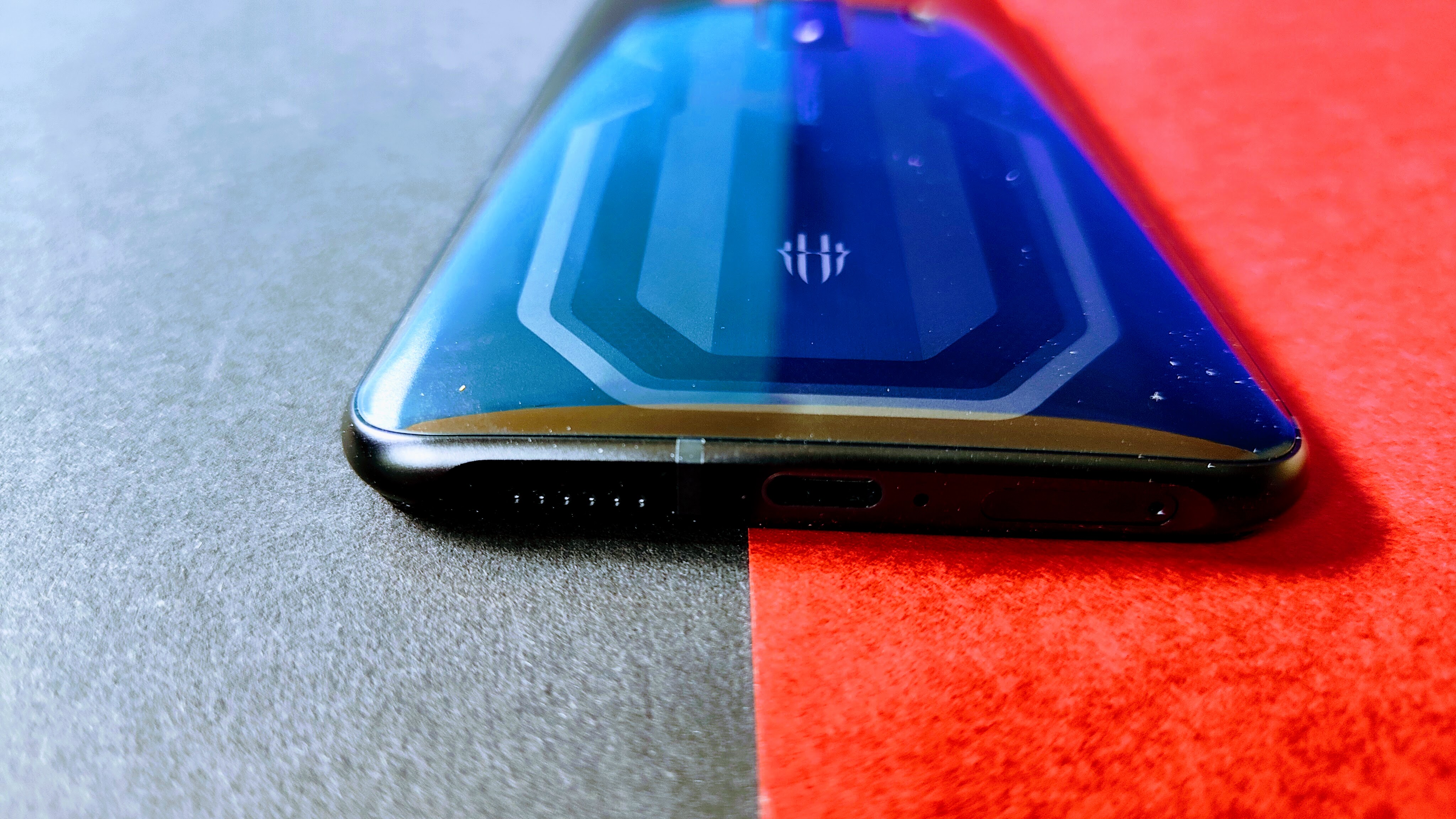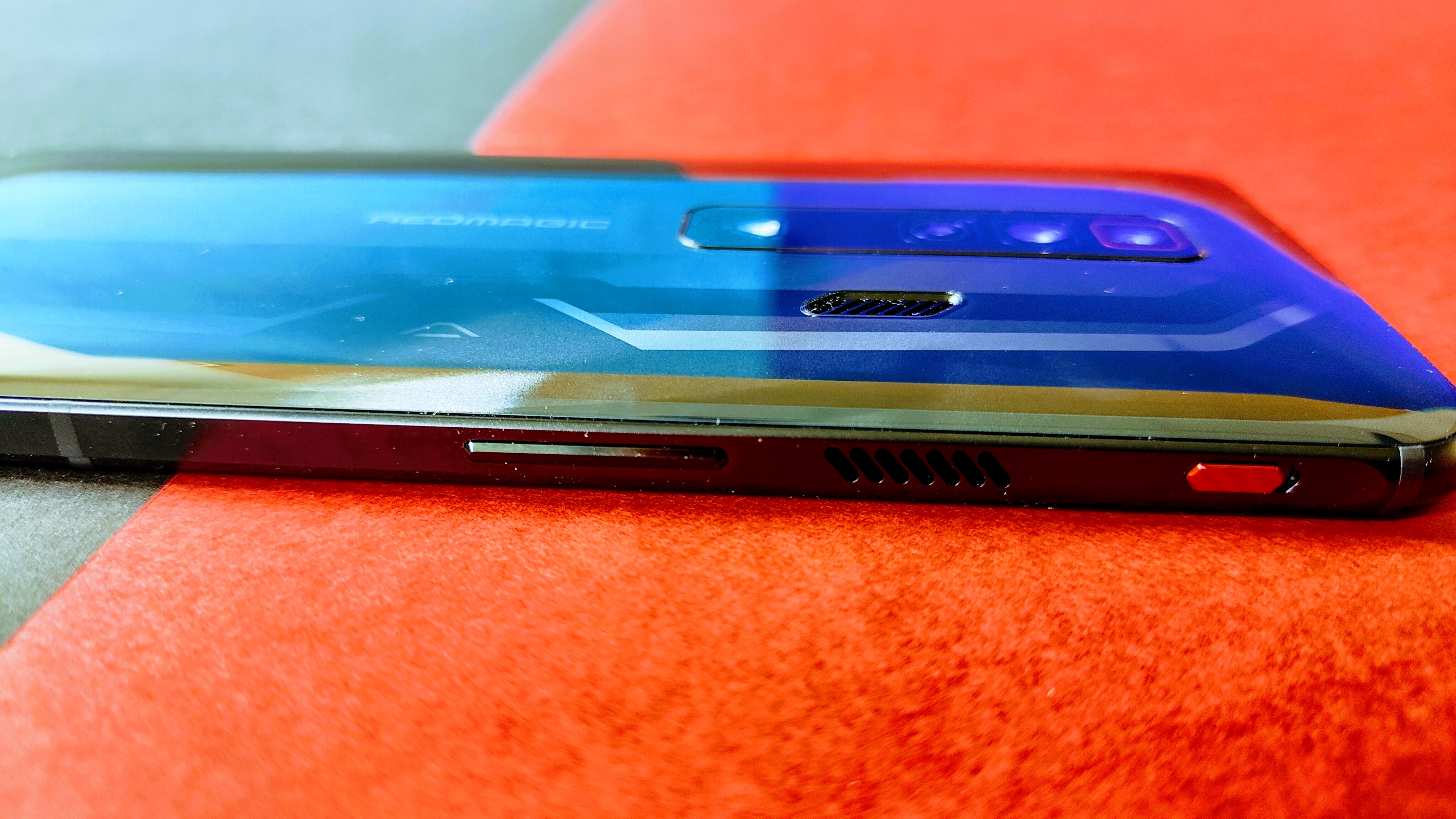 Schlitze für den Lüfter finden sich auf der Rückseite sowie seitlich im Rahmen auf beiden Seiten. Eher untypisch ist die vordere Kamera: Diese findet man nicht in einer Punch-Hole-Notch, sondern im Rand oberhalb des Displays. Das bietet Vorteile beim Spielen: Inhalte auf dem Bildschirm werden durch die Linse nicht unterbrochen und so gestört. Allerdings fällt dadurch der Rahmen etwas dicker aus.