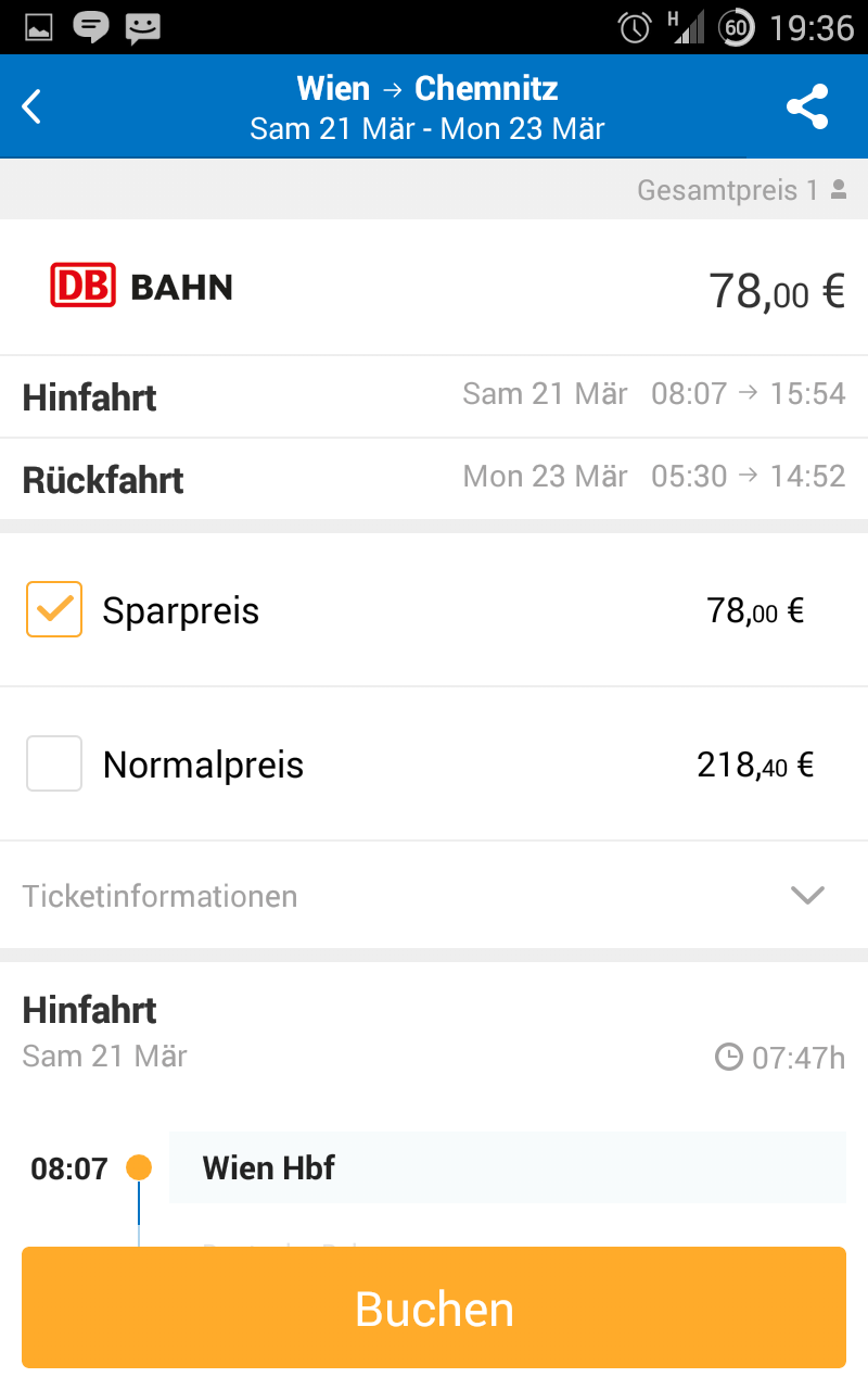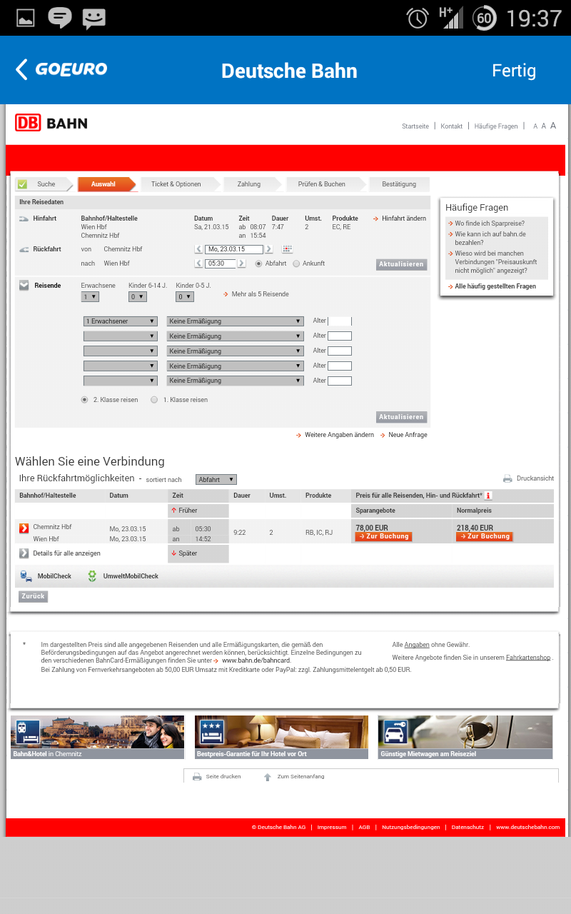Bei der eigentlichen Buchung geht das Programm einen Eigenweg. Es öffnet ein WebView, also eine Browser-Darstellung, in der Ihr direkt auf die Webseite des Anbieters gelenkt werdet. Das Herumhantieren mit den diversen Vergleichsseiten und Buchungsengines bleibt Euch erspart.