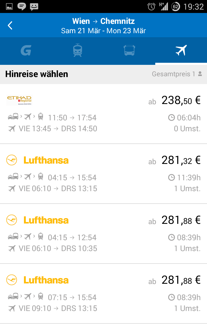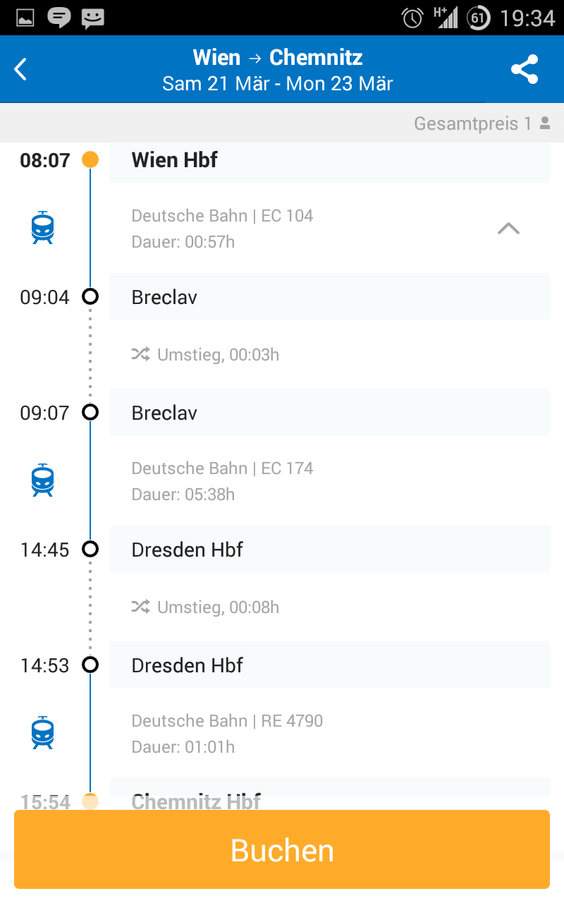 Omio gruppiert die anzuzeigenden Resultate nach dem Verkehrsmittel. Flüge, Busreisen und Bahnfahrten erscheinen in eigenen Tabs. Das Antippen einer Verbindung blendet weitere Informationen über Route und Gesamtpreis ein – ein sehr übersichtliches Feature, dass Ihr bei anderen Vergleichsportalen mitunter vergeblich sucht.