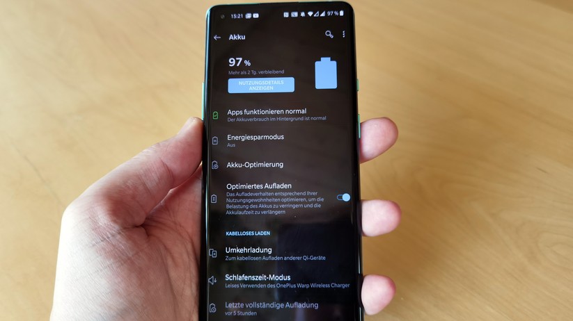 An den Laufzeiten hätte das natürlich auch nichts geändert, ist aber auch nicht nötig. Zumindest nicht, wenn man auf 120 Hertz bei der Wiedergabe von Inhalten verzichtet. Denn mit 120 Hz kam unser Testgerät mit aktualisierter Firmware im Battery Test von PCmark auf knapp unter 8 Stunden, mit 60 Hz auf knapp über 10 Stunden. Bedeutet hochgerechnet: Wer die volle Leistung des Gerätes und seine Vorzüge voll ausnutzen will, sollte sich eher auf allabendliches, nur bei wenig Nutzung auf Laden alle zwei Tage einstellen. Gute bis 20 Prozent mehr Laufzeit erreichen Nutzer des Oneplus 8 Pro, wenn sie die Bildwiederholungsrate beschränken. Dann steigt die Laufzeit von „okay“ auf „gut“.