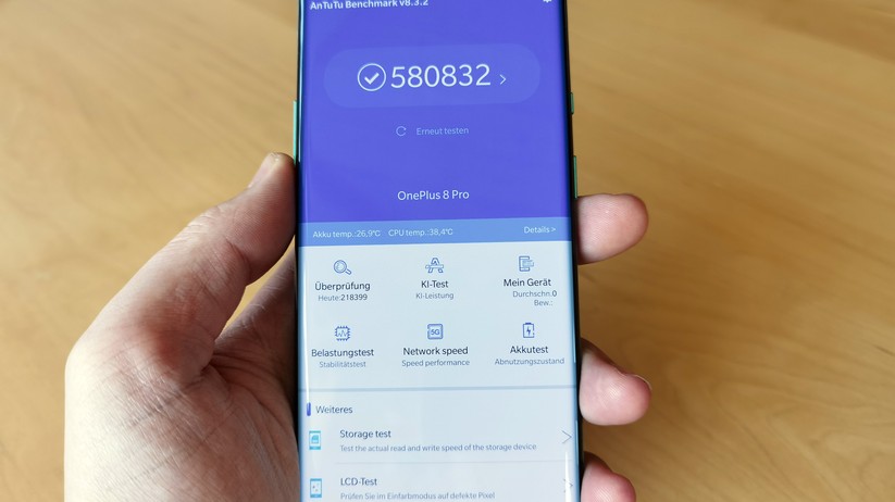 Beim Thema Hardware mischt das Oneplus 8 Pro ganz weit vorne mit. Als Antrieb dient der neue Qualcomm-Spitzenchipsatz Snapdragon 865, der je nach Version von 8/128 oder sogar 12/256 GByte Speicher unterstützt wird. Das sorgt im Antutu-Benchmark für atemberaubende 580.000 Punkte und macht das Oneplus-Smartphone schneller, als den Großteil aller anderen verfügbarer Smartphones auf dem Markt. Das merkt man auch in der alltäglichen Nutzung. Zusammen mit der 120-Hz-Wiedergabe des Displays wirkt das Pro-Modell in jeder Situation performant, Ruckler haben wir im Test nicht feststellen können. Der UFS-3.0-Speicher ist wie von Oneplus gewohnt nicht erweiterbar.