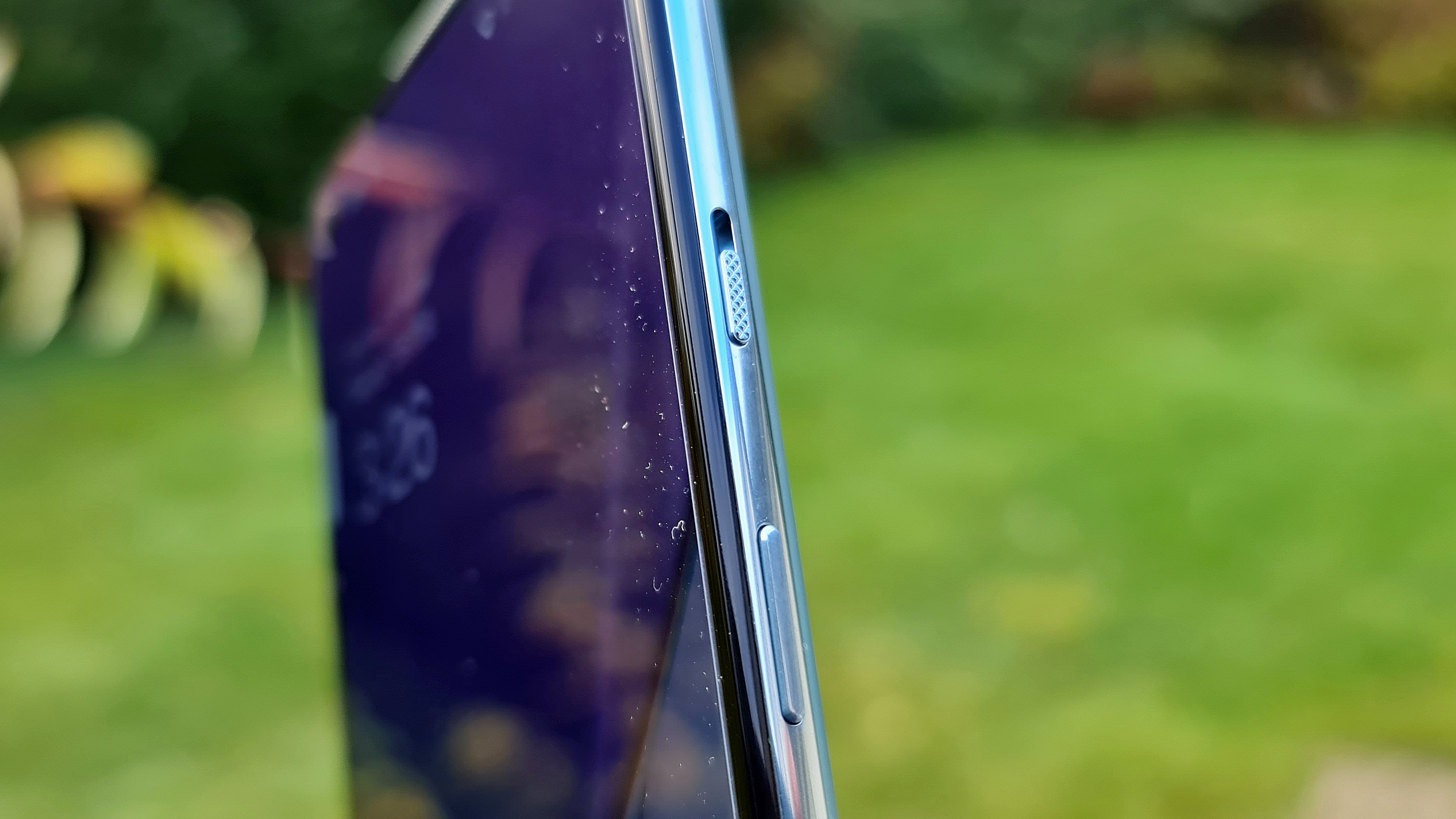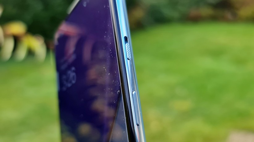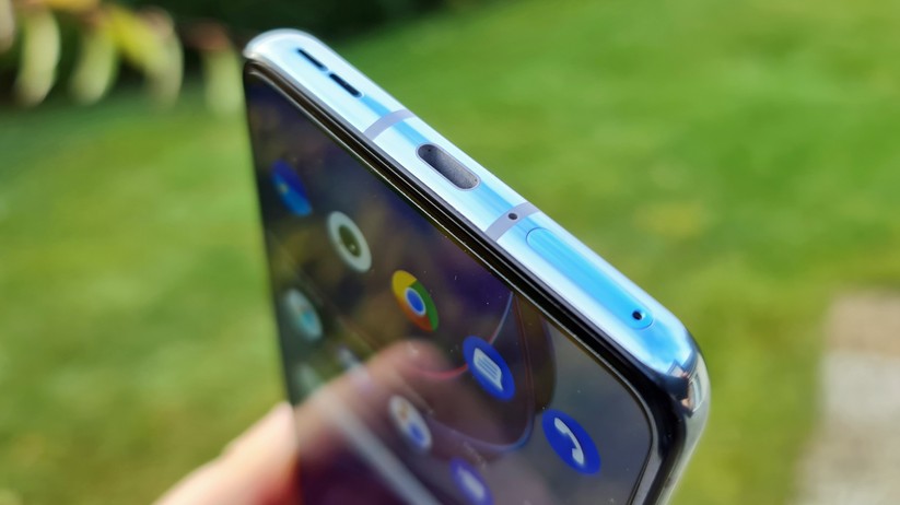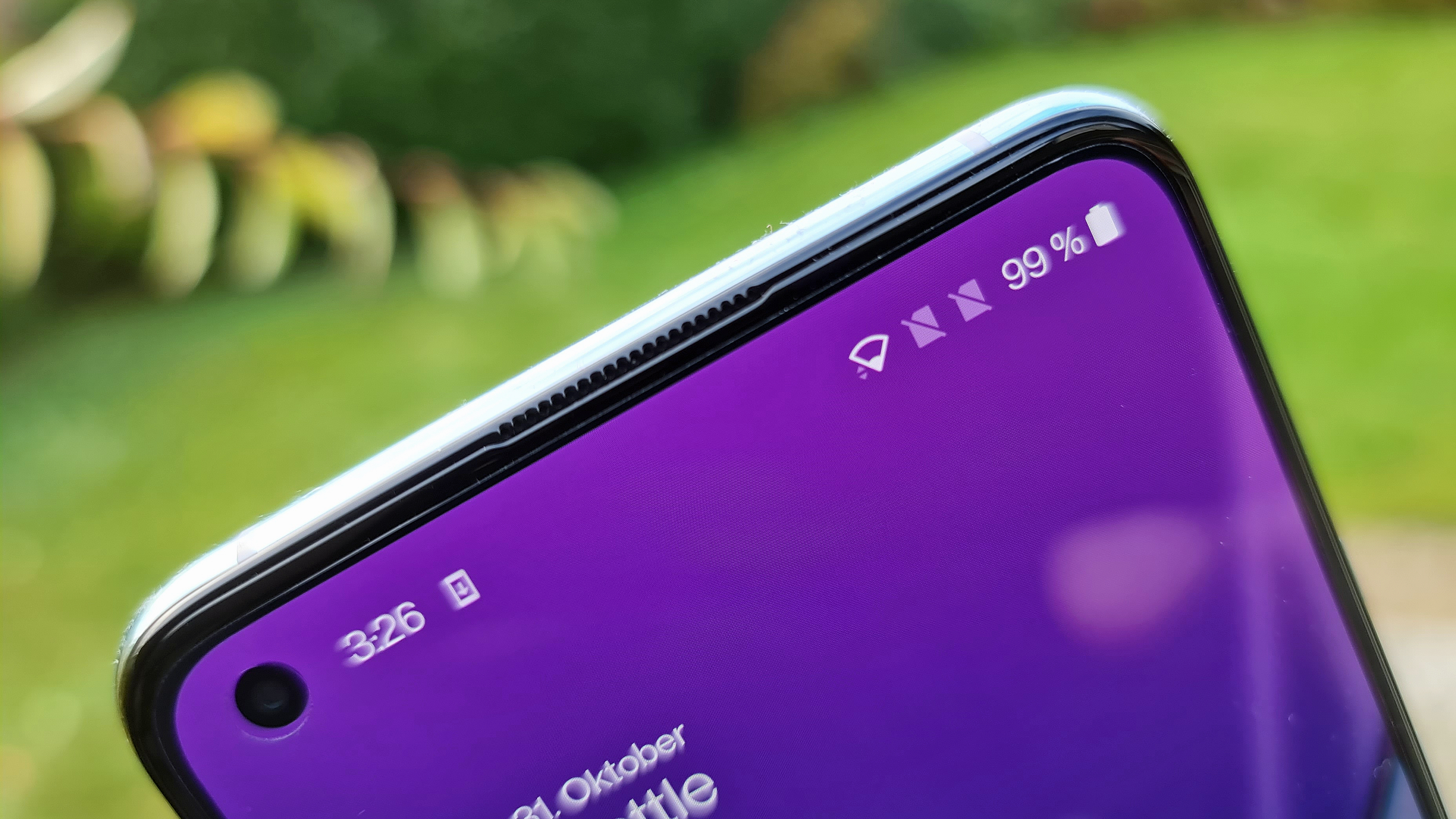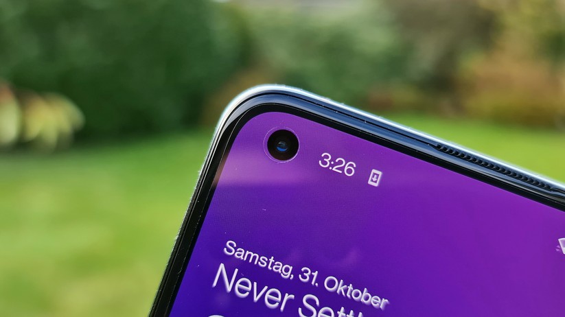 Schick ist es, das neue Oneplus 8T. Die Rückseite besteht bei unserem Testmodell aus einem satinierten Silberton, das Glas der Oberfläche wird dadurch minimal griffiger, bleibt aber insgesamt rutschig. Durch die zu den langen Kanten hin gerundeten Seiten liegt das Smartphone sehr angenehm in der Hand, beim Ablegen auf einen Tisch stört allerdings die vorstehende Kameraeinheit. Da die im oberen linken Eck platziert wurde, kippelt es dann bei der Bedienung. Der Übergang in den glänzenden Metallrahmen verläuft fließend, er weist keine störenden Kanten auf. Vorn ist das anders.